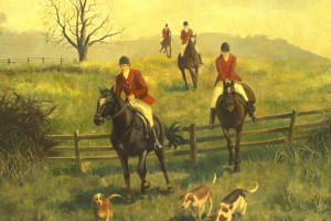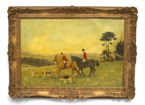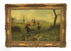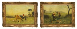 PAIR of English Country-style gilt carved framed oil paintings of hunt scenes with dogs, horses and riders with red jackets (signed MICHAEL WOOD)(PRICED AS PAIR)