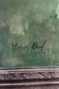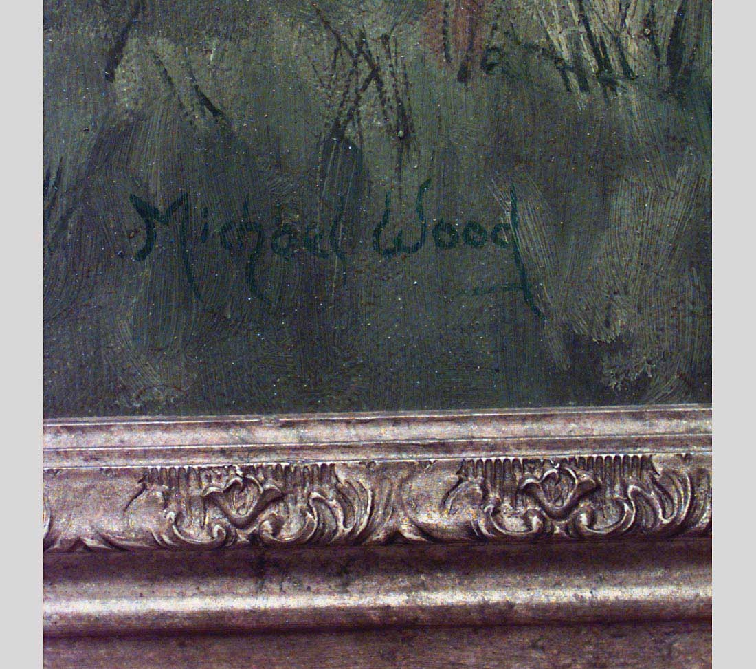 PAIR of English Country-style gilt carved framed oil paintings of hunt scenes with dogs, horses and riders with red jackets (signed MICHAEL WOOD)(PRICED AS PAIR).