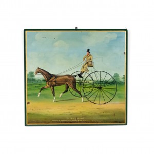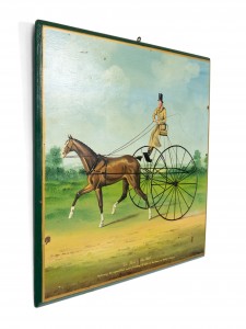 English oil painting of man on sulkey with horse on wood panel (20th Cent)