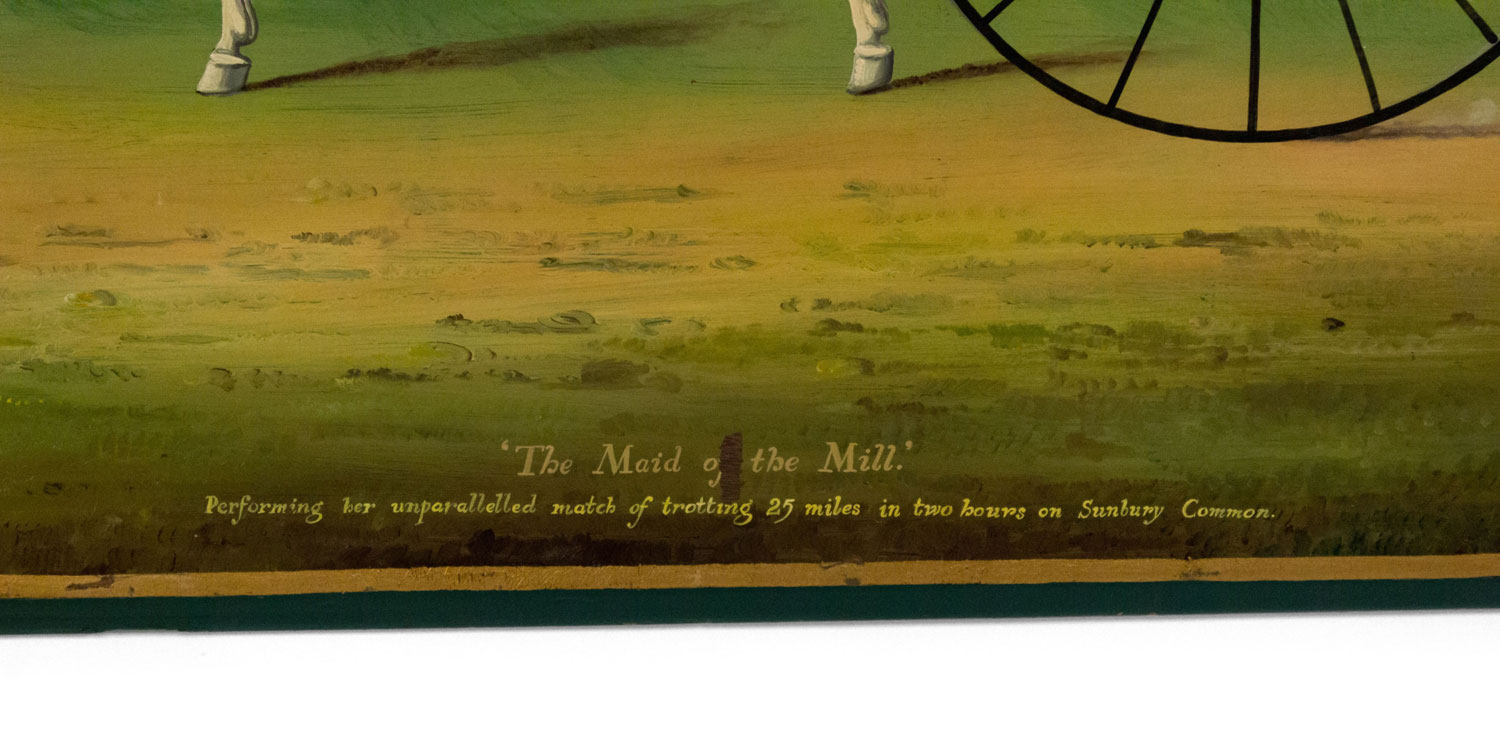 English oil painting of man on sulkey with horse on wood panel (20th Cent).