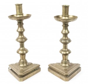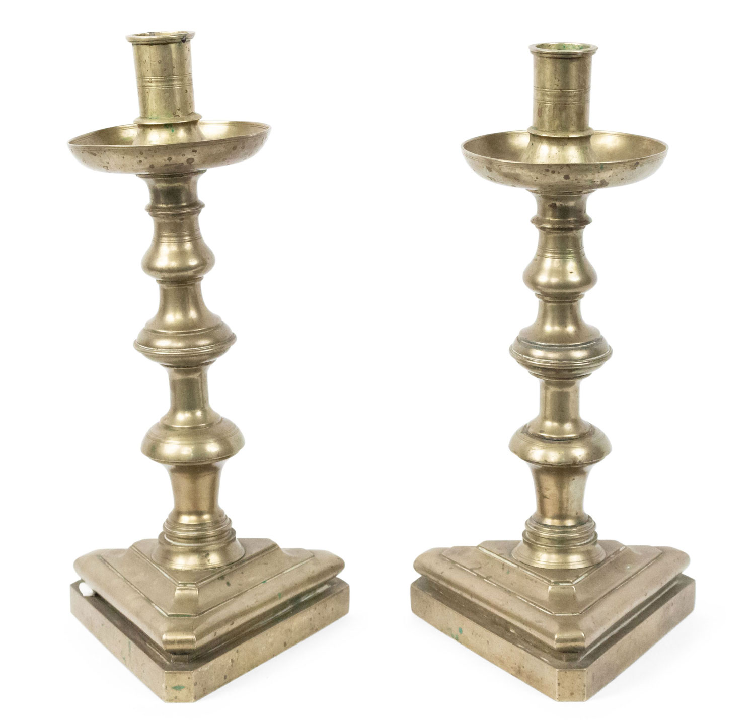 PAIR of English Country (19th Century) pewter turned design candlesticks on triangular base (Skinner Estate) (PRICED AS PAIR).