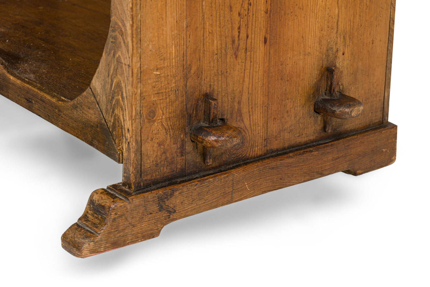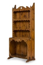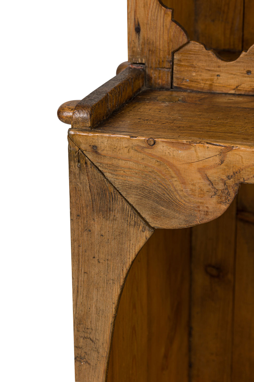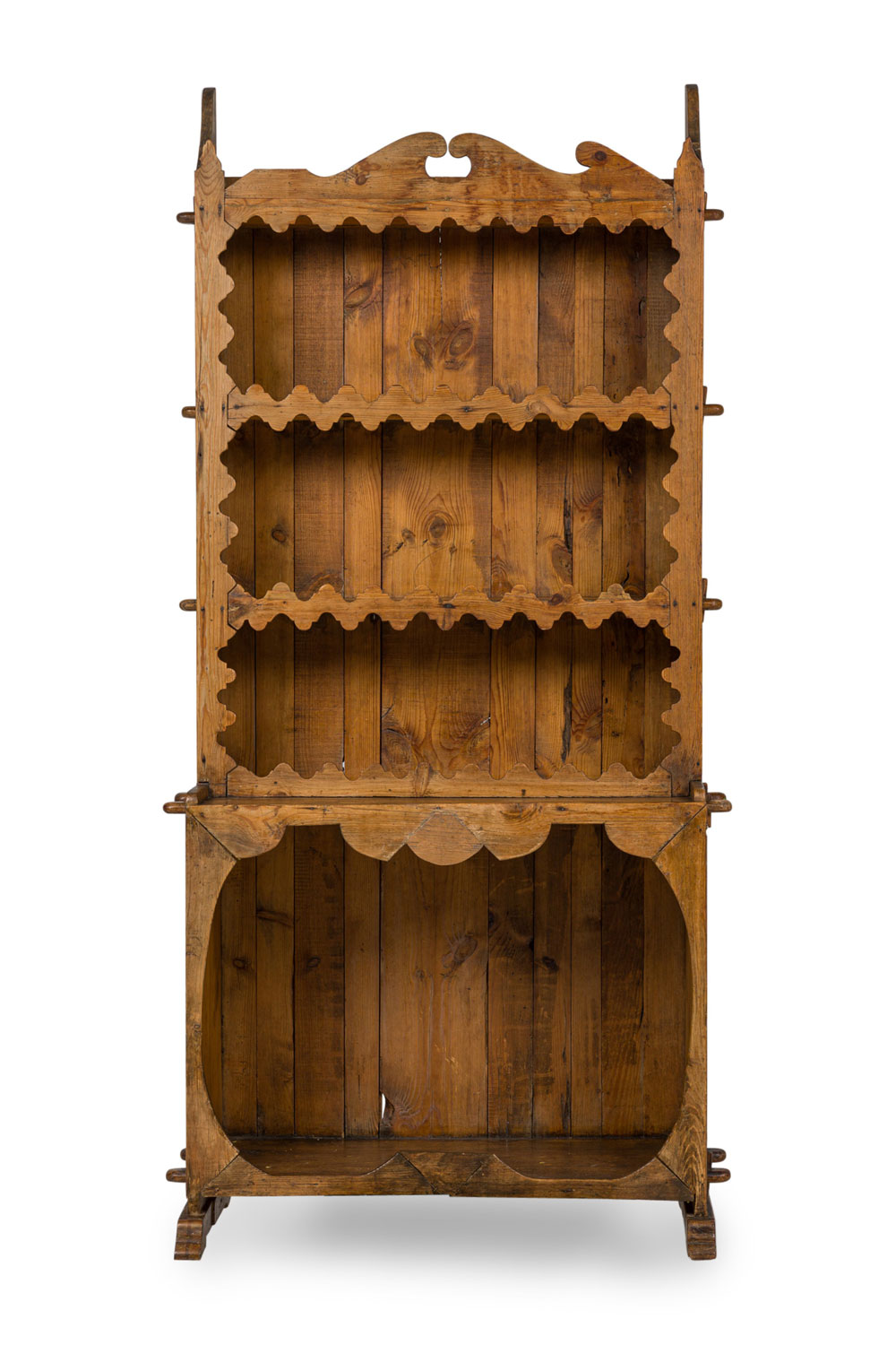 English Country (19th Century) pine hutch cabinet with scalloped shelf edge and open base.