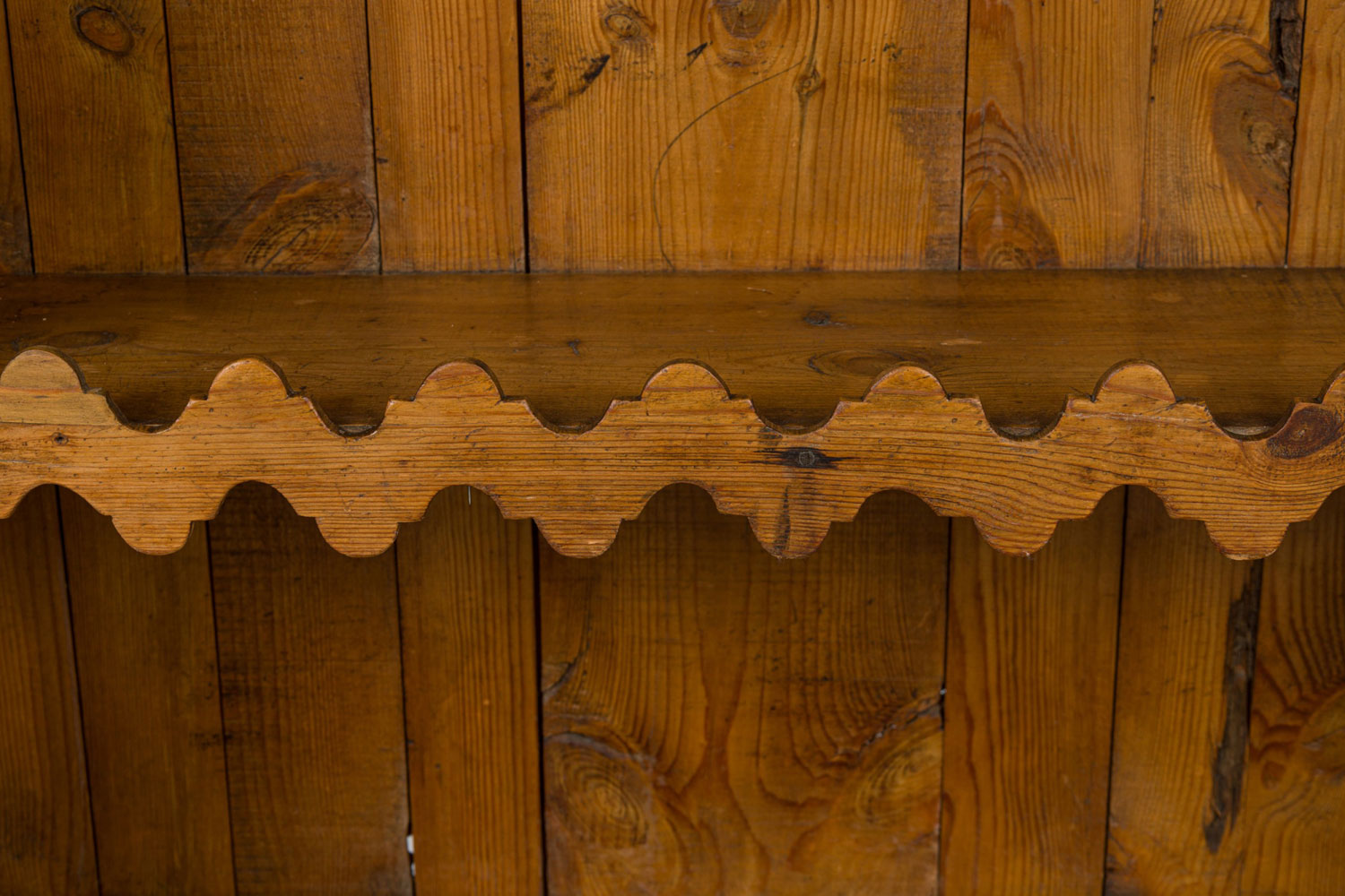 English Country (19th Century) pine hutch cabinet with scalloped shelf edge and open base..