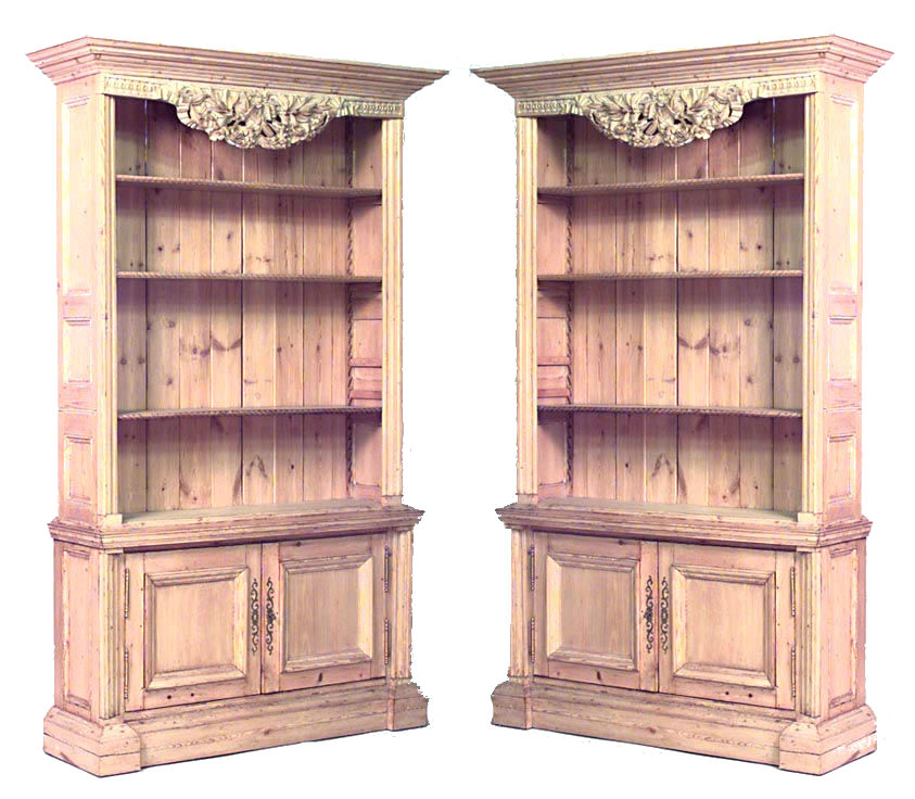 PAIR of English Country (19/20th Century) stripped pine bookcase cabinets with open shelves and 2 lower doors with floral carved top. (PRICED AS PAIR).