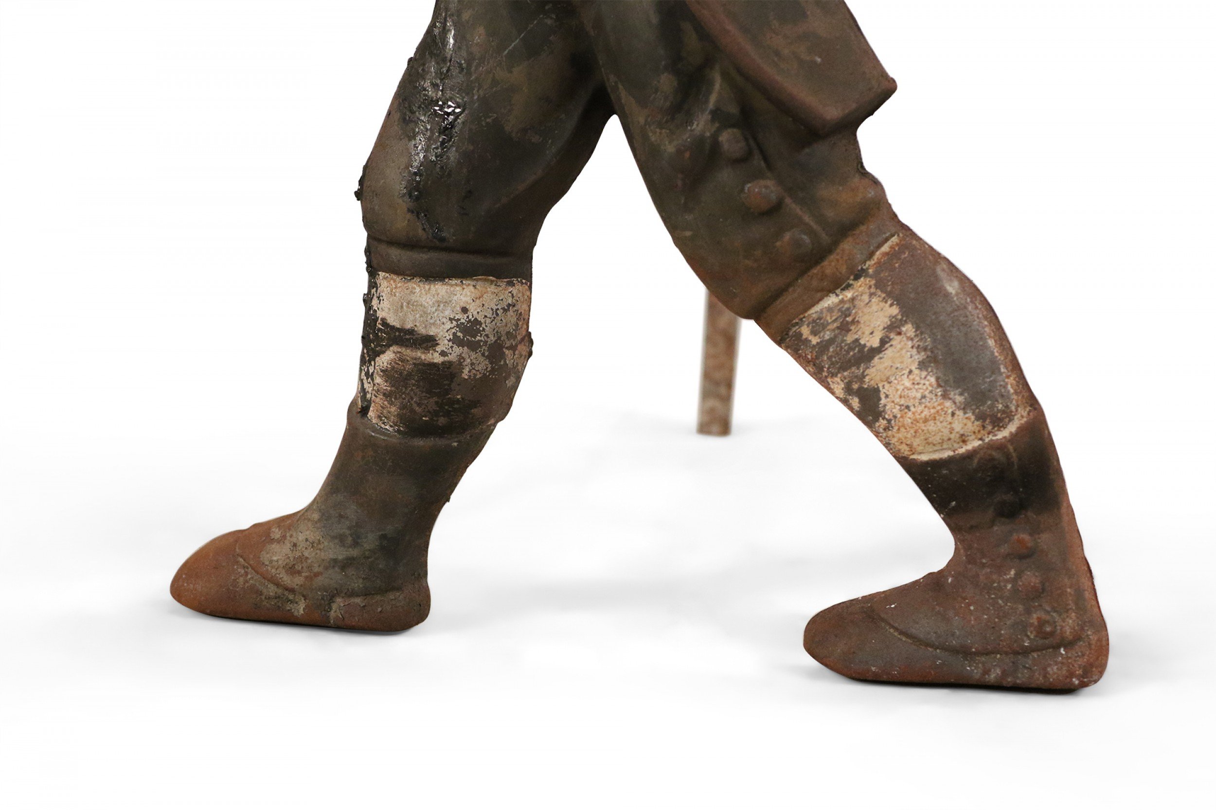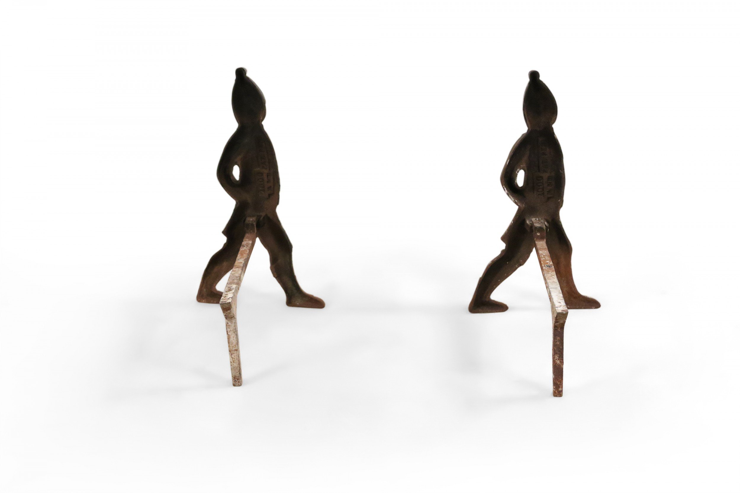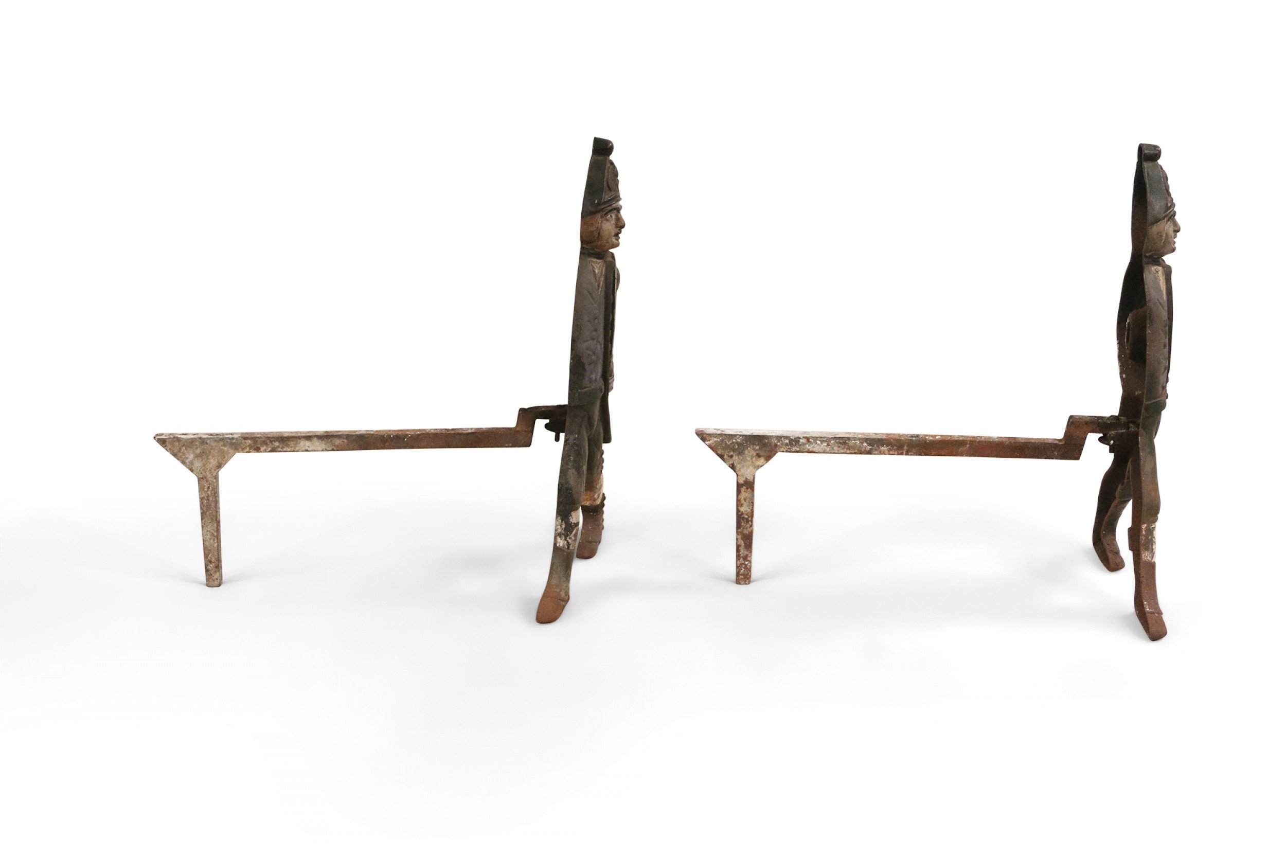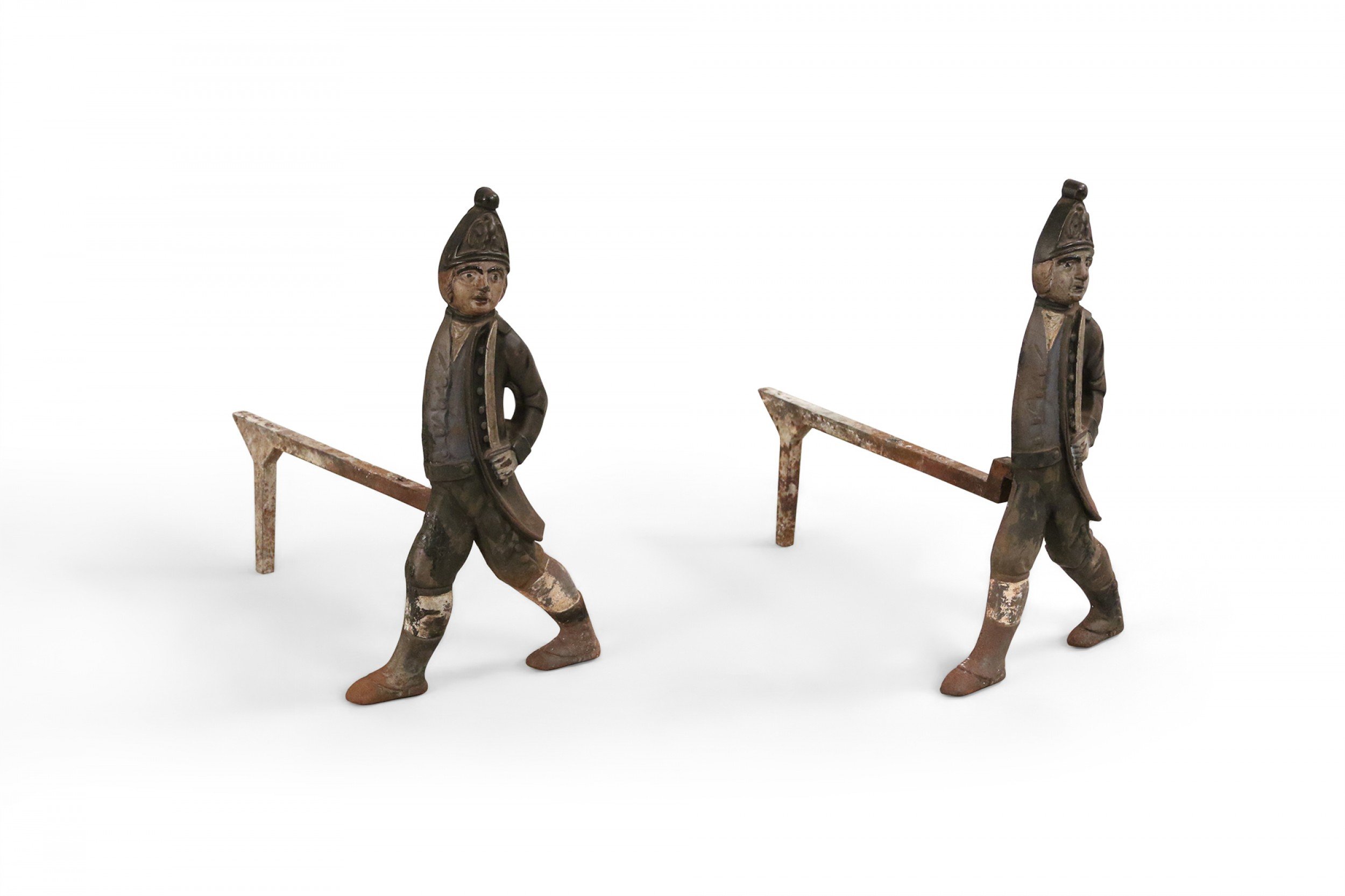 PAIR of English Country-style painted wrought iron fireplace andirons with 17th Century-style figures. (PRICED AS SET).