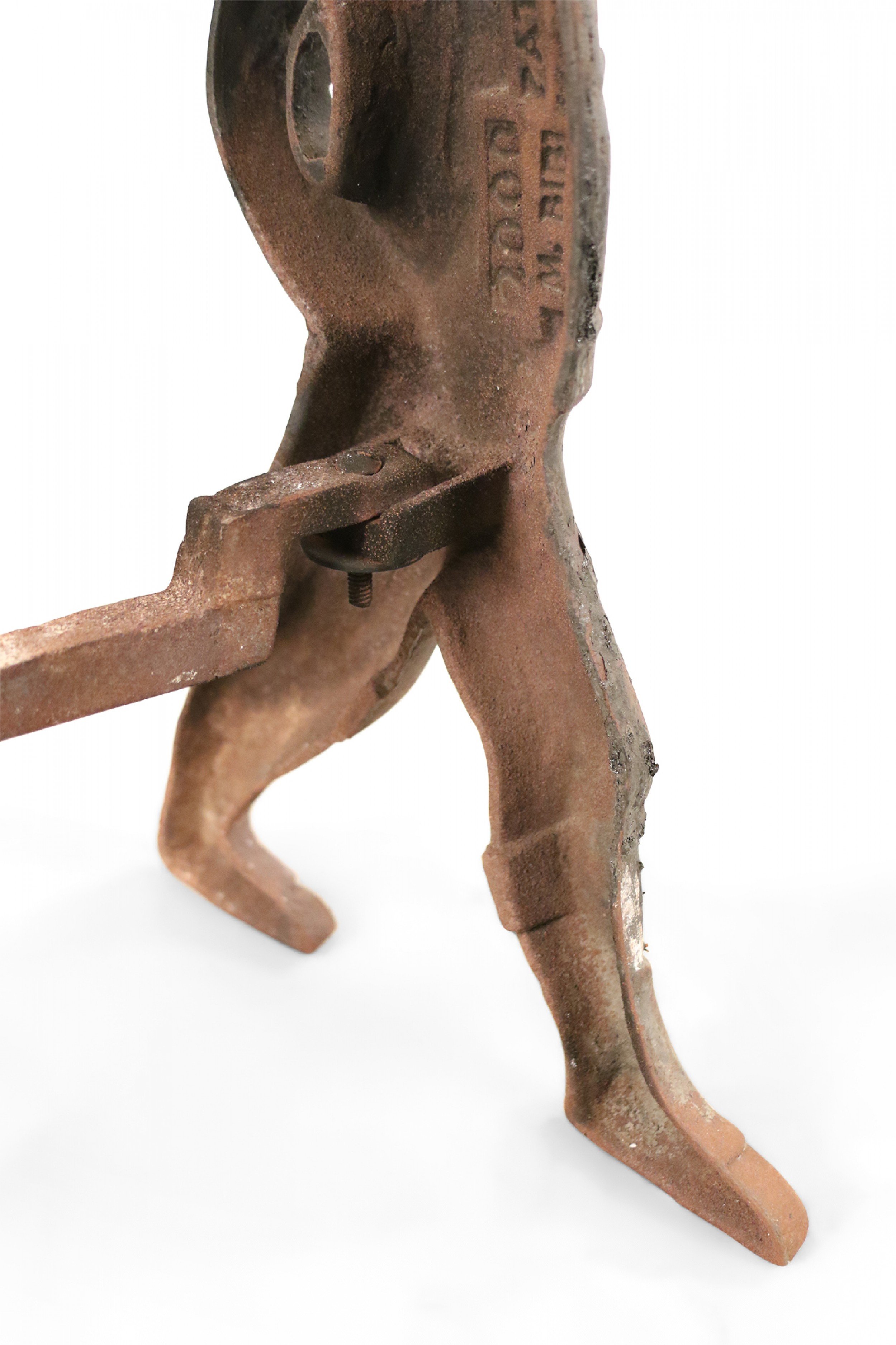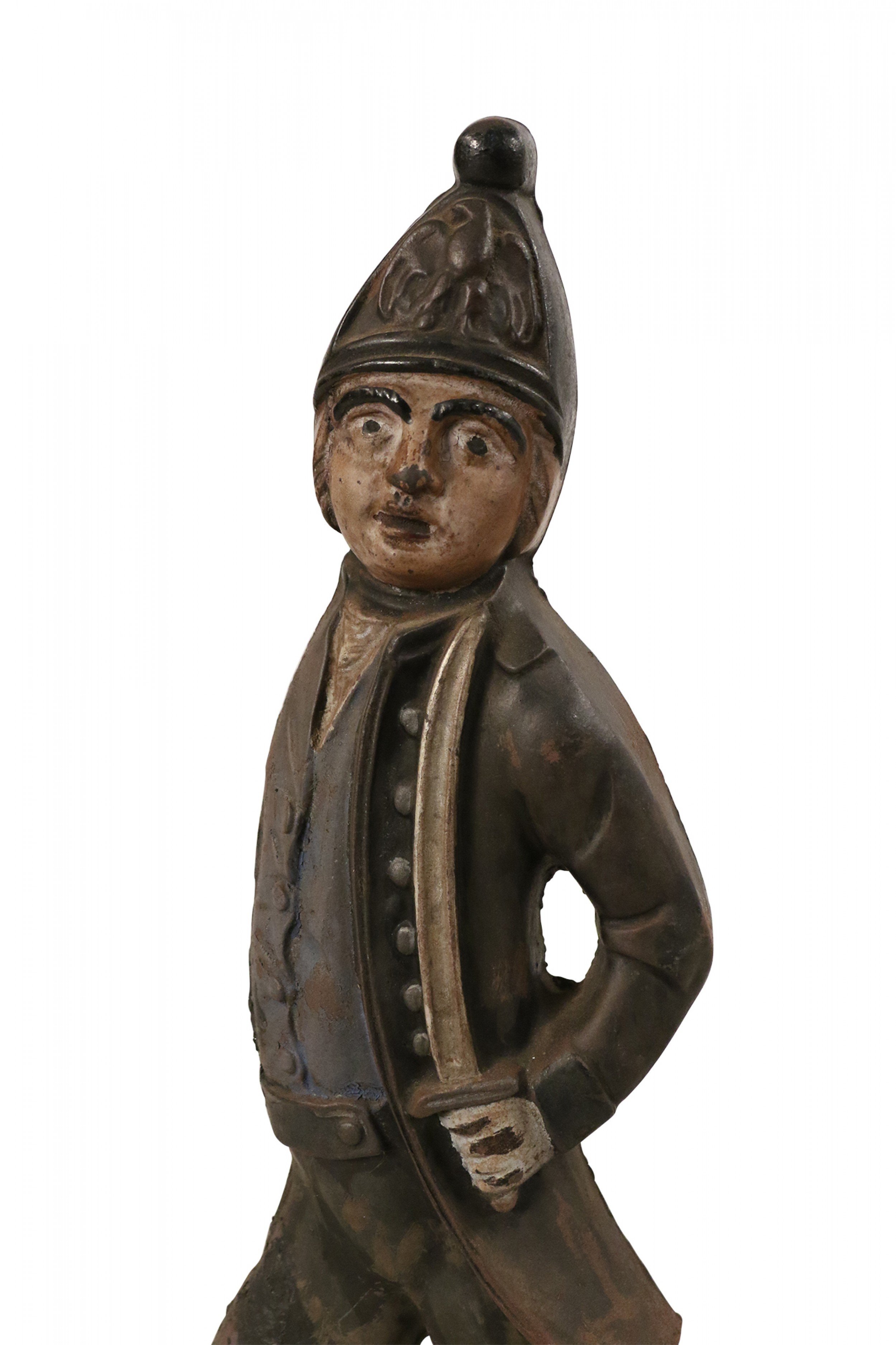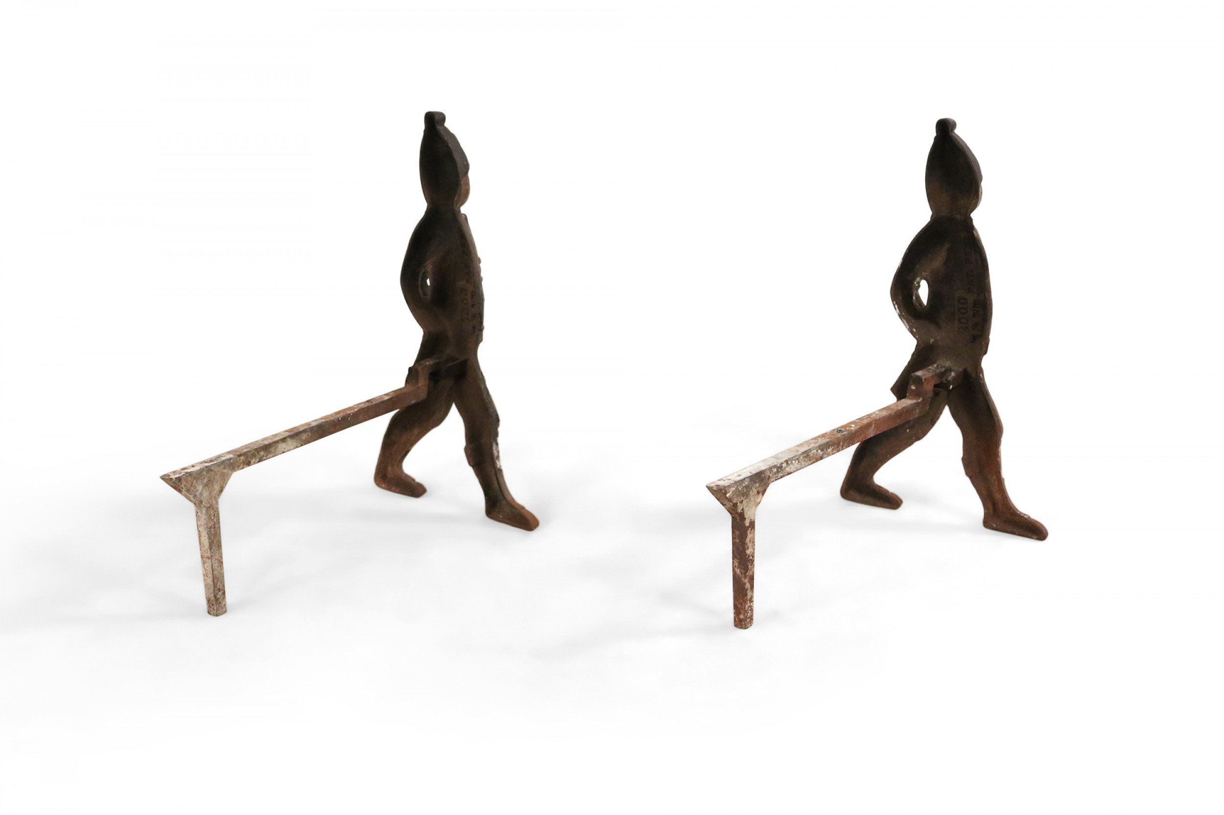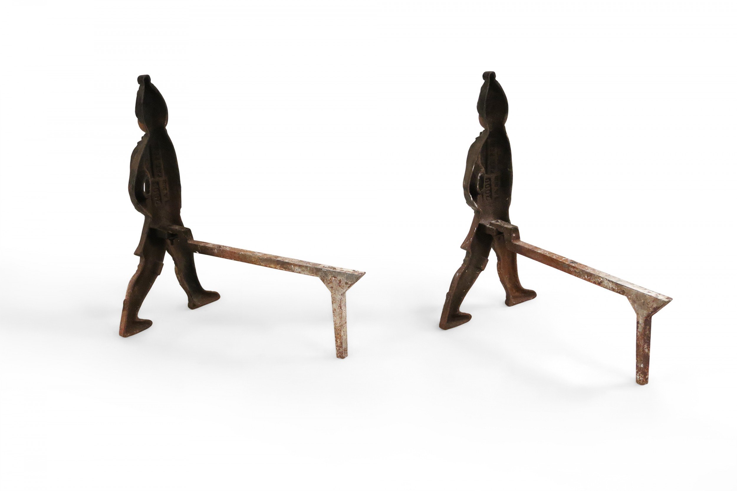 PAIR of English Country-style painted wrought iron fireplace andirons with 17th Century-style figures. (PRICED AS SET).