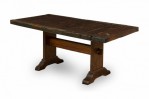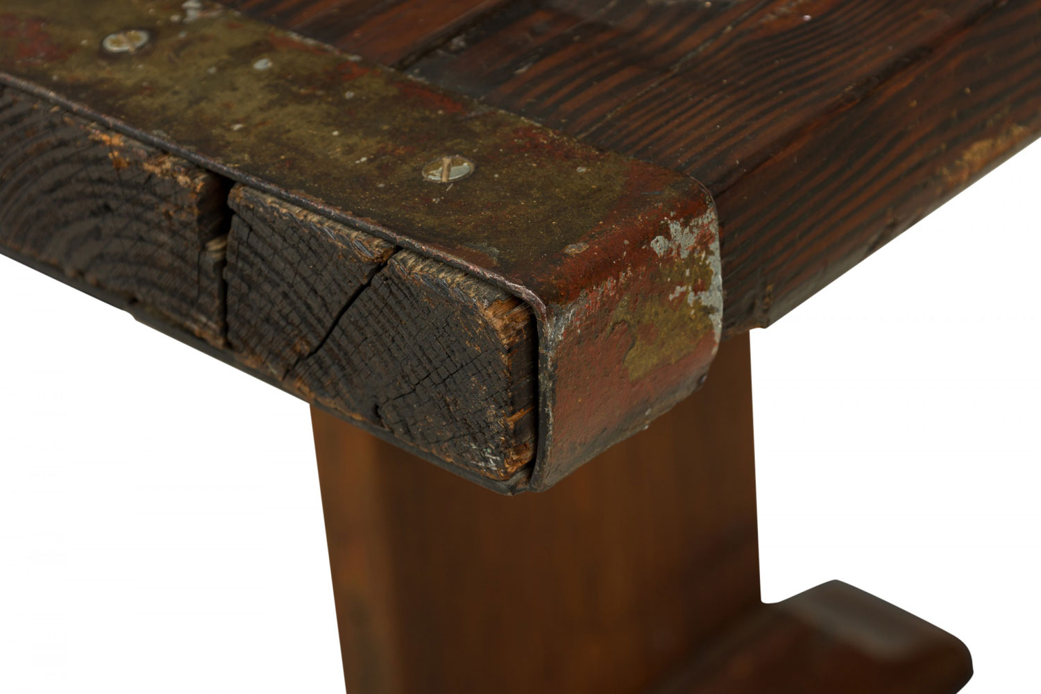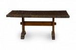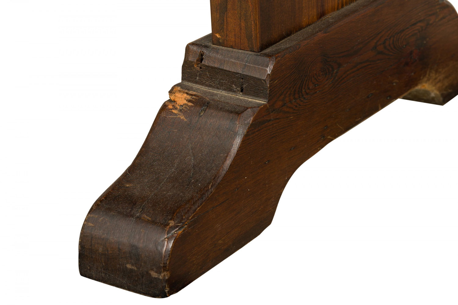 English Country style (20th Century) trestle dining table with a rectangular top made of oak planks held in place by two wide iron bands on either side, with cutouts in the corners banded by metal bars, resting on a trestle stretcher base..