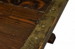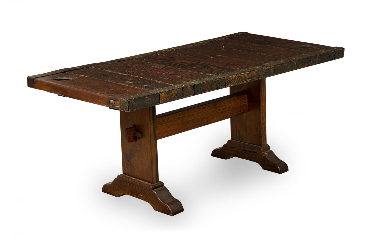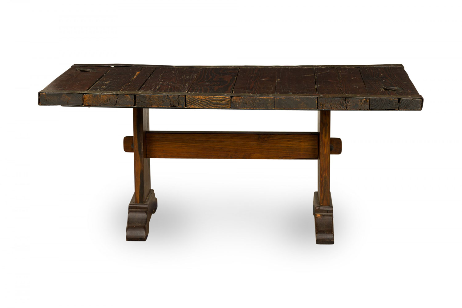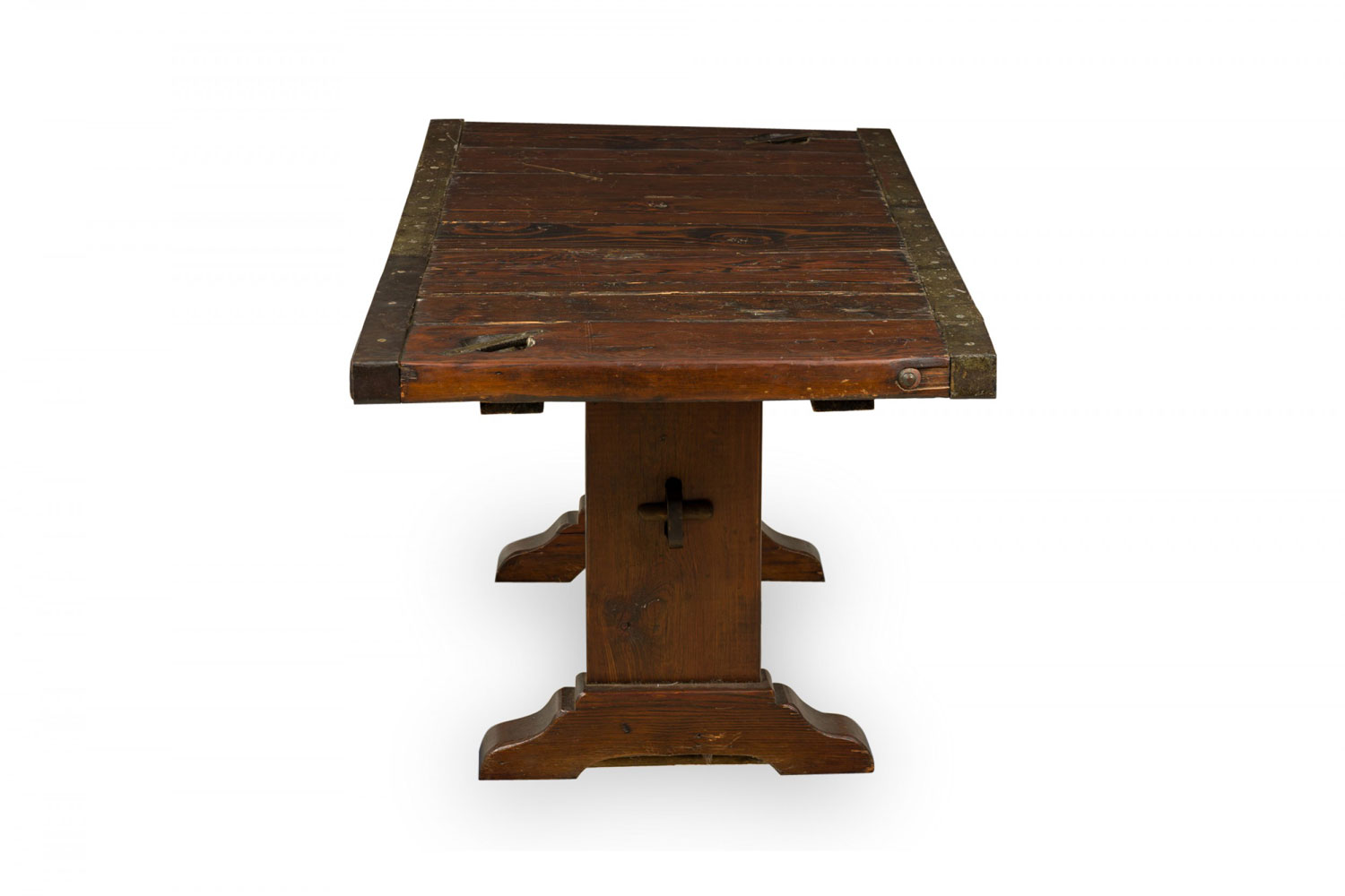 English Country style (20th Century) trestle dining table with a rectangular top made of oak planks held in place by two wide iron bands on either side, with cutouts in the corners banded by metal bars, resting on a trestle stretcher base.