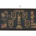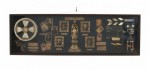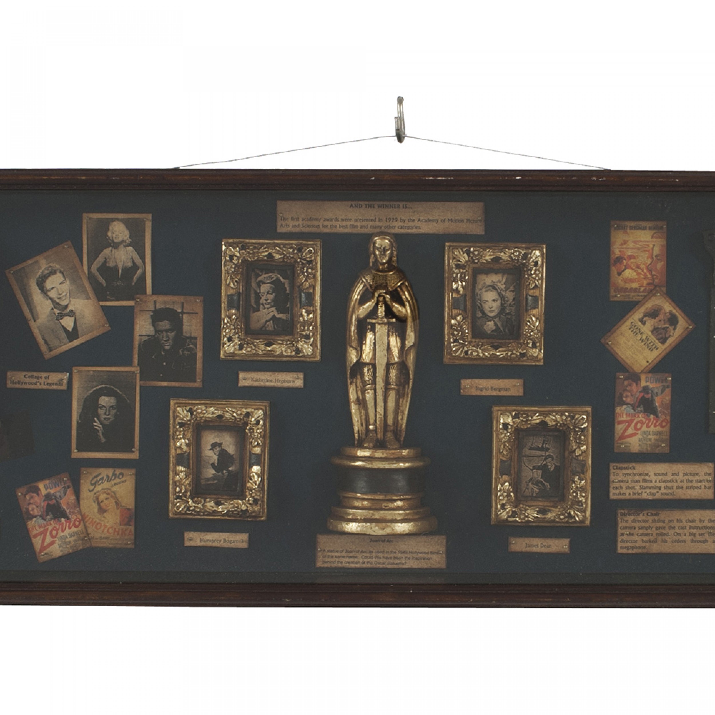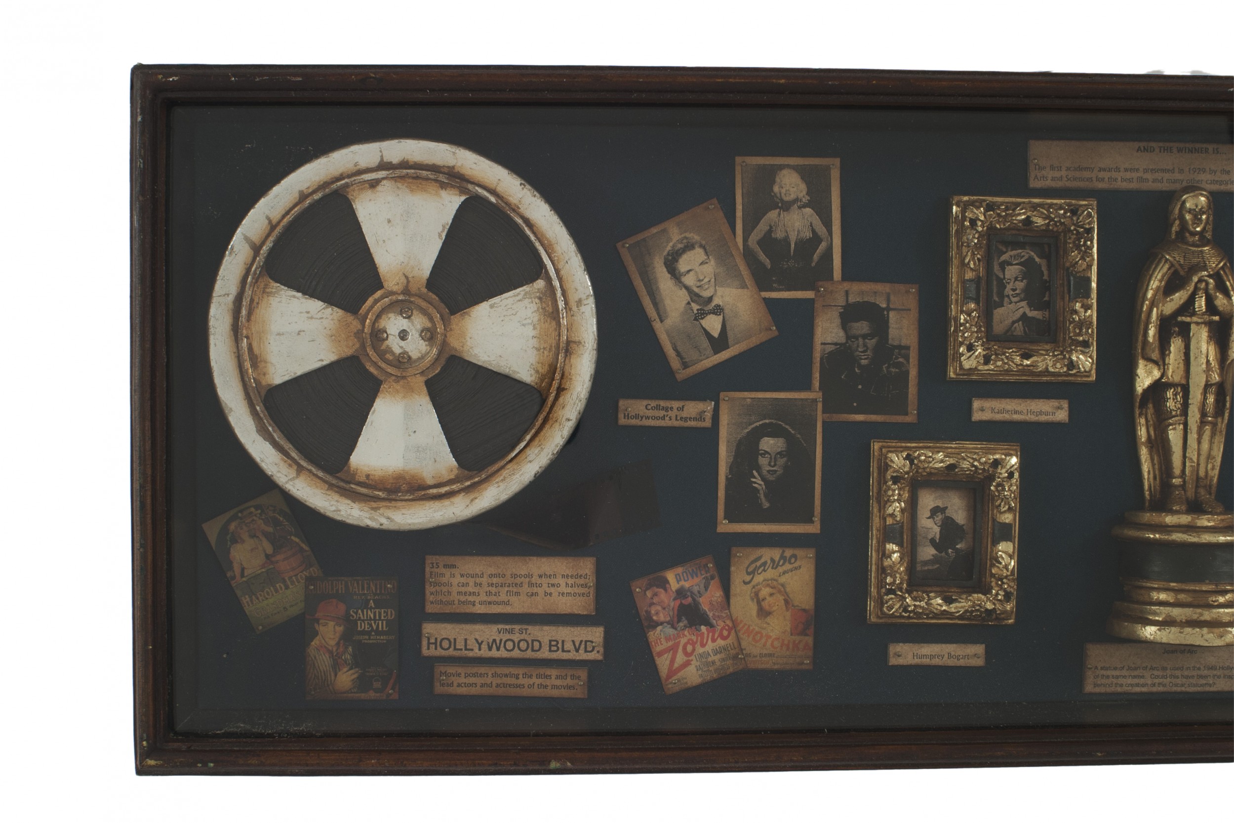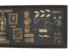 English-style display case/wall plaque featuring photographs of early film stars, antique film reels, and other film industry curios on a green felt background..