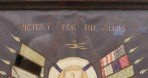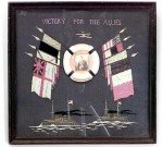 English Country style (20th Century) ebonized framed memorial "woolie" embroidery of flags and ships with photograph of a sailor in a life raft. Text embroidered at top, "Victory for the Allies"..