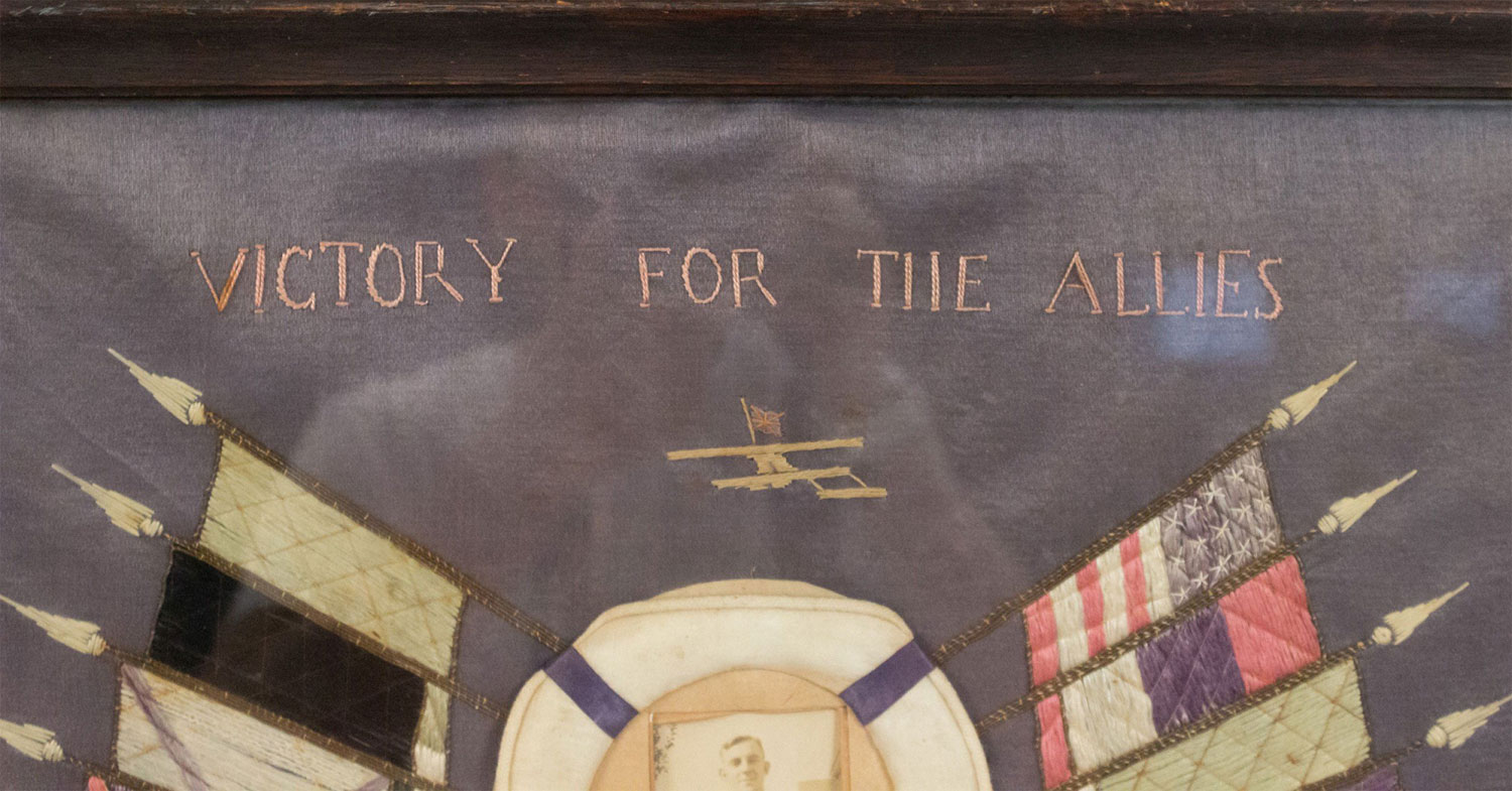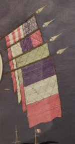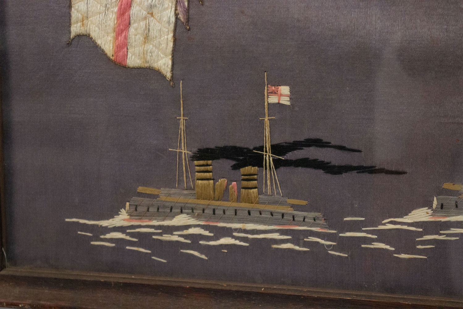 English Country style (20th Century) ebonized framed memorial "woolie" embroidery of flags and ships with photograph of a sailor in a life raft. Text embroidered at top, "Victory for the Allies".