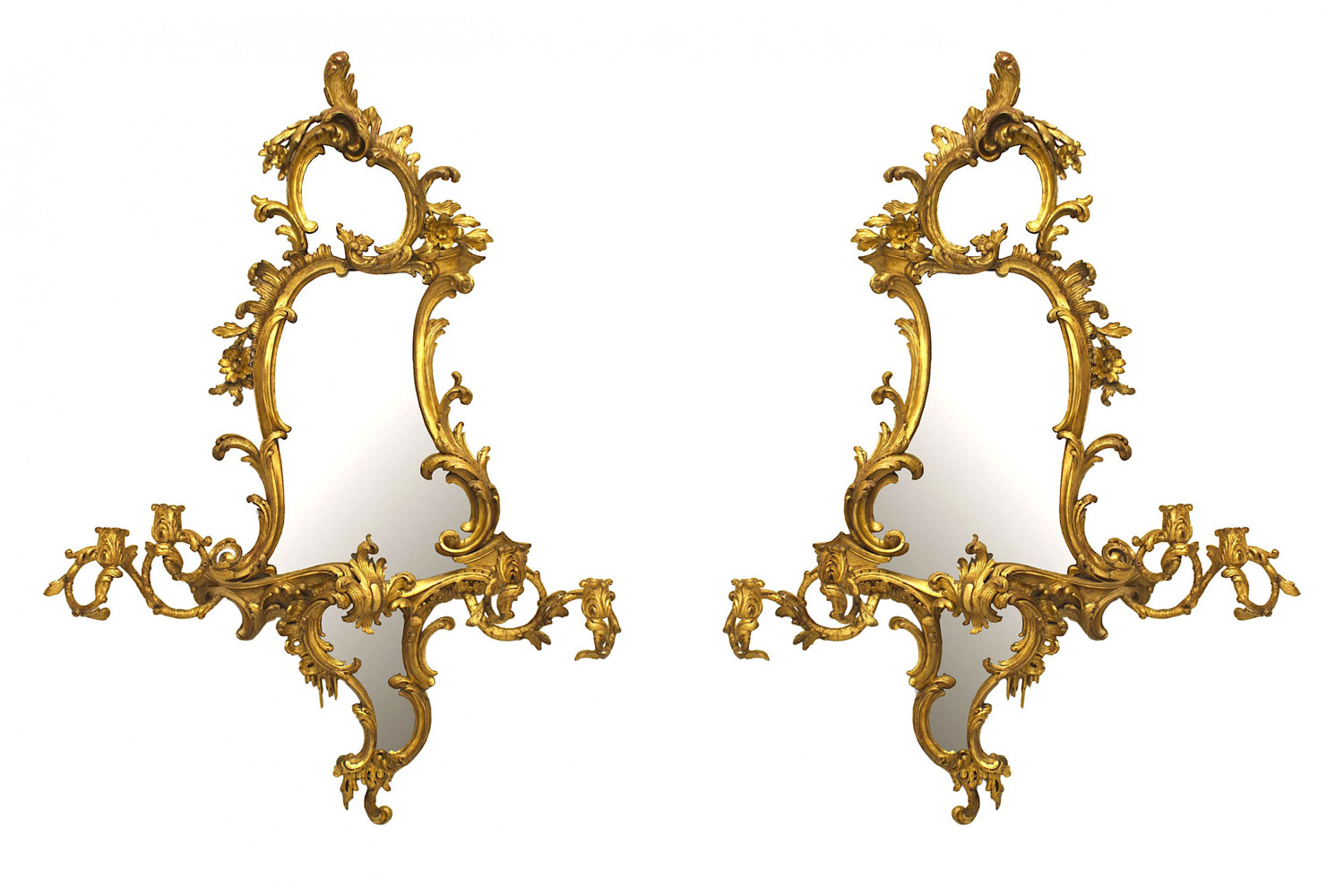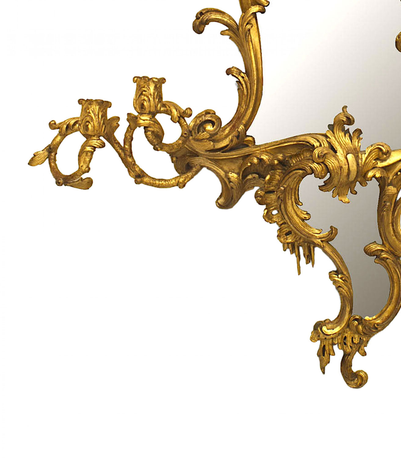 PAIR of English George II (circa 1750) giltwood shaped form wall mirrors / girandoles with elaborate carved scroll designs and two pairs of lights emanating from the center. (PRICED AS PAIR)