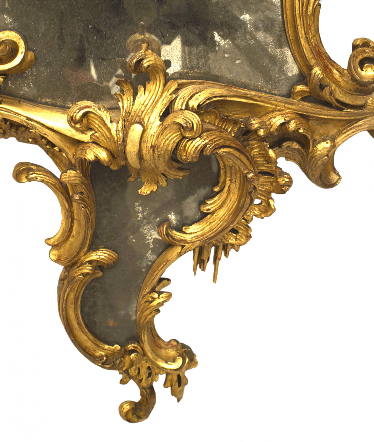 PAIR of English George II (circa 1750) giltwood shaped form wall mirrors / girandoles with elaborate carved scroll designs and two pairs of lights emanating from the center. (PRICED AS PAIR).