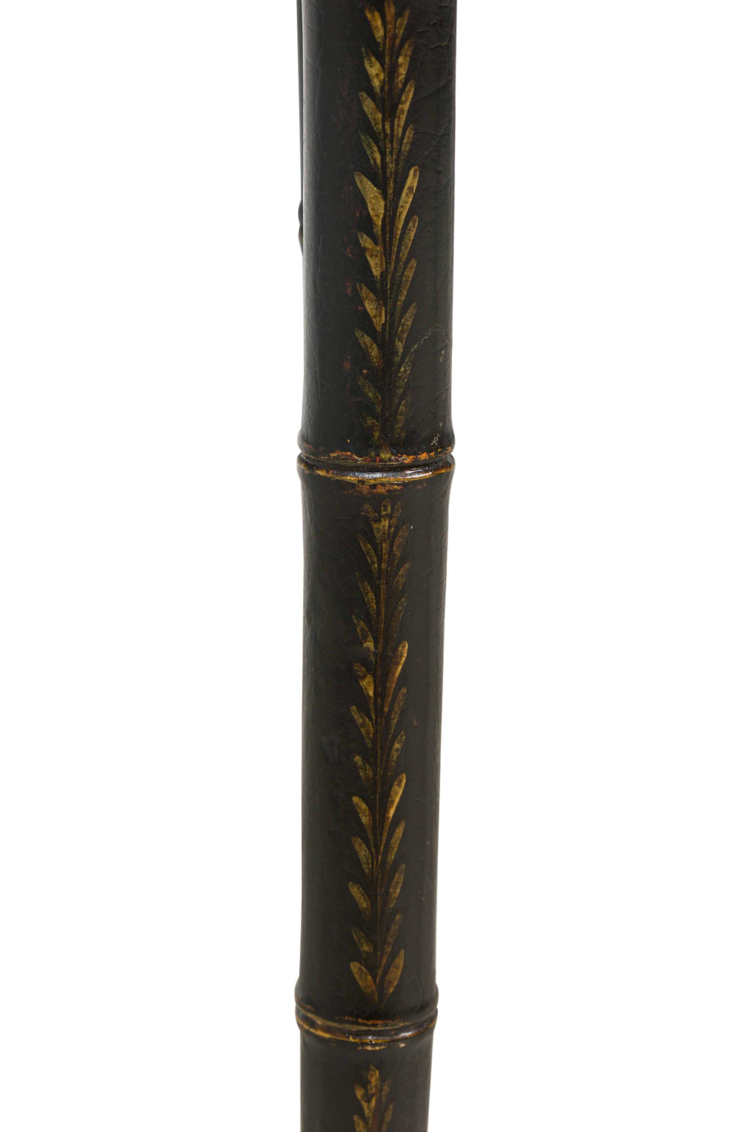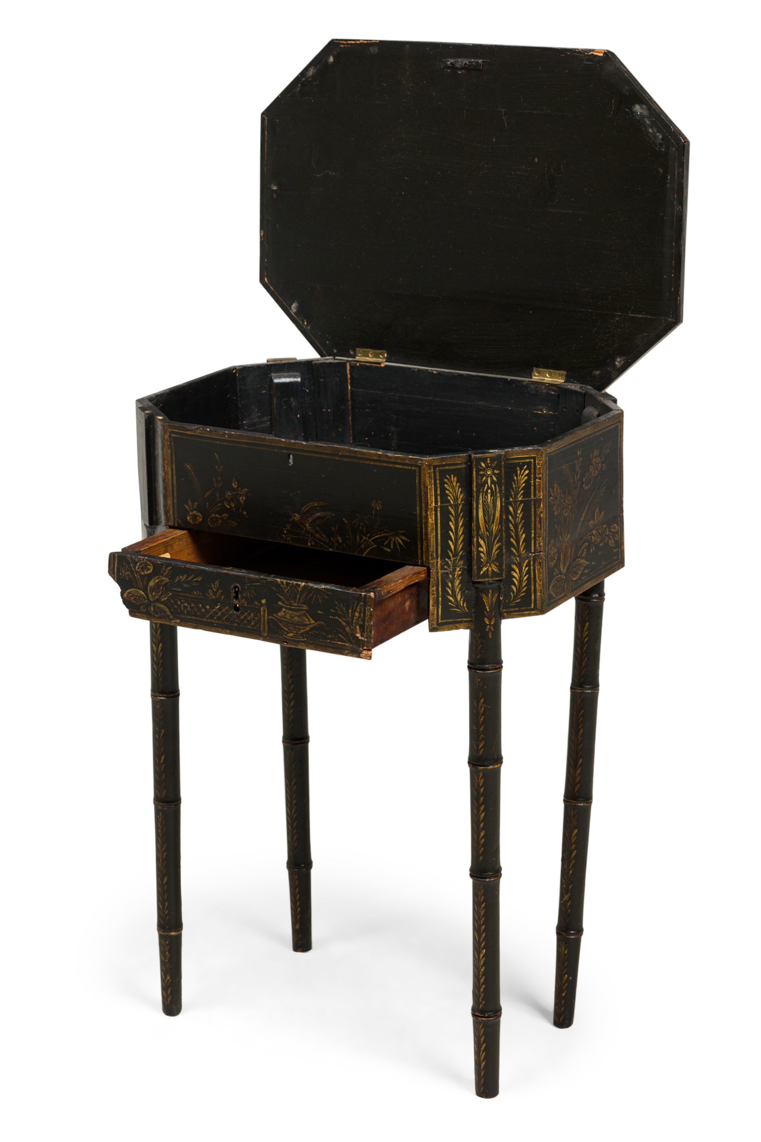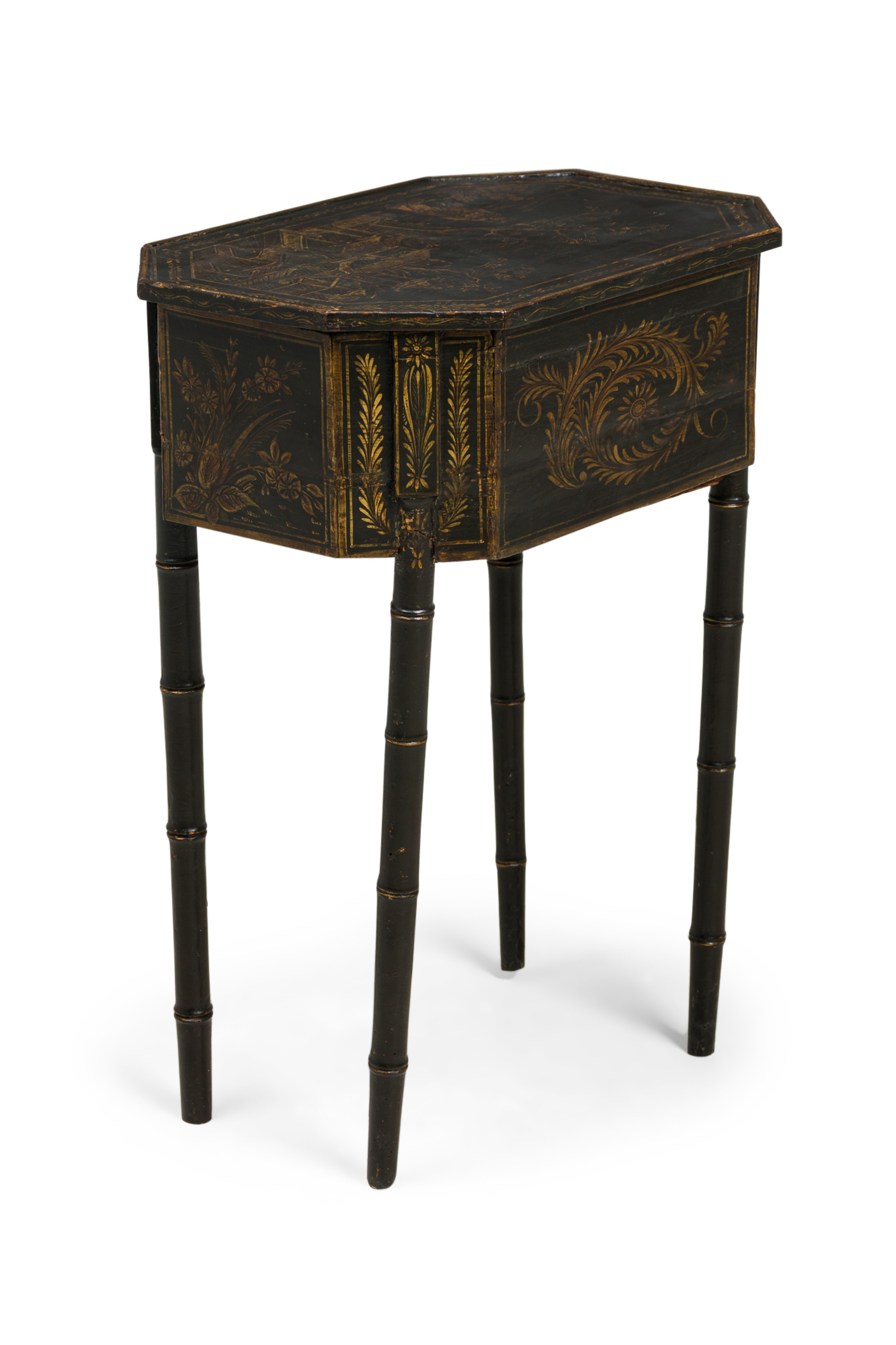English George III Black Japanned work / end / side table with an elongated hexagonal cabinet, having a lid decorated with a gilt genre scene which opens on hinges to reveal an open interior compartment above two lower drawers, resting on four faux bamboo legs..