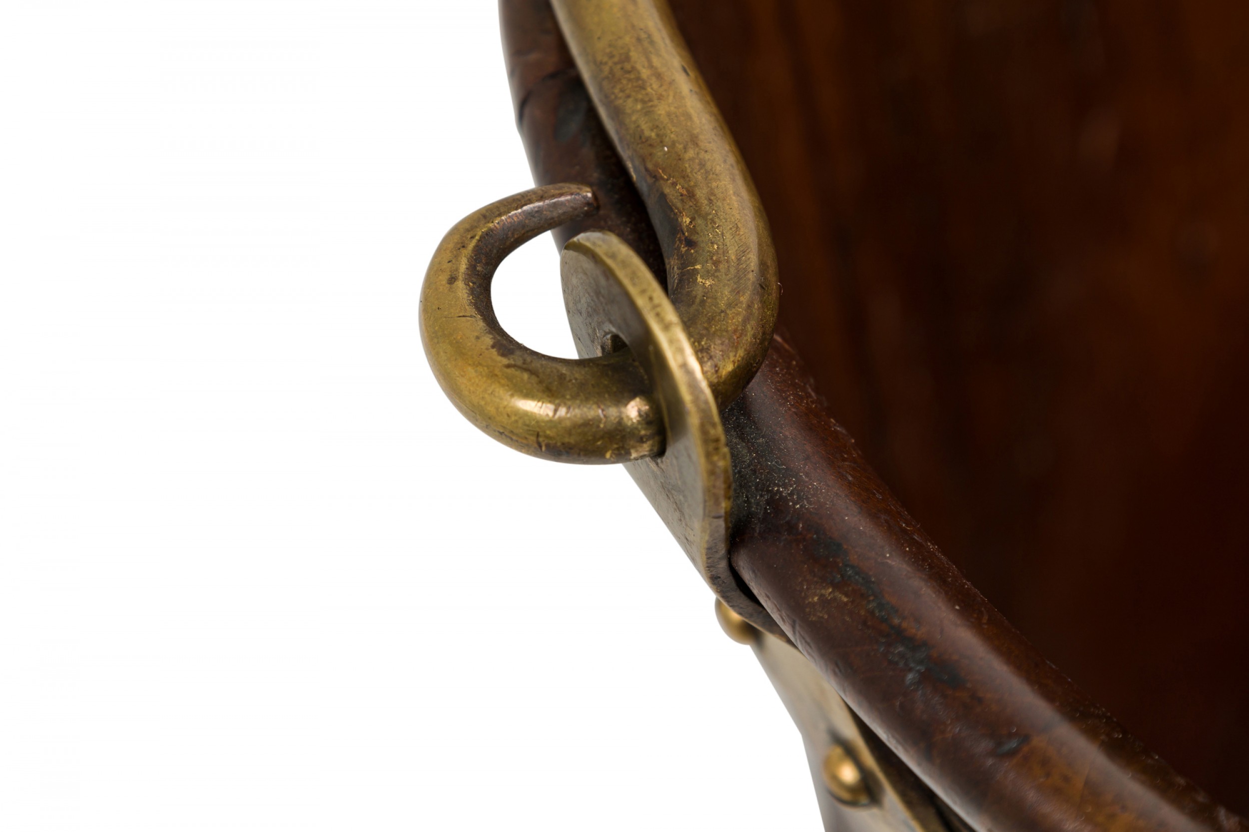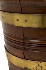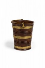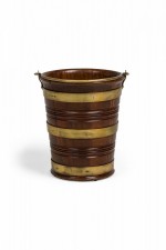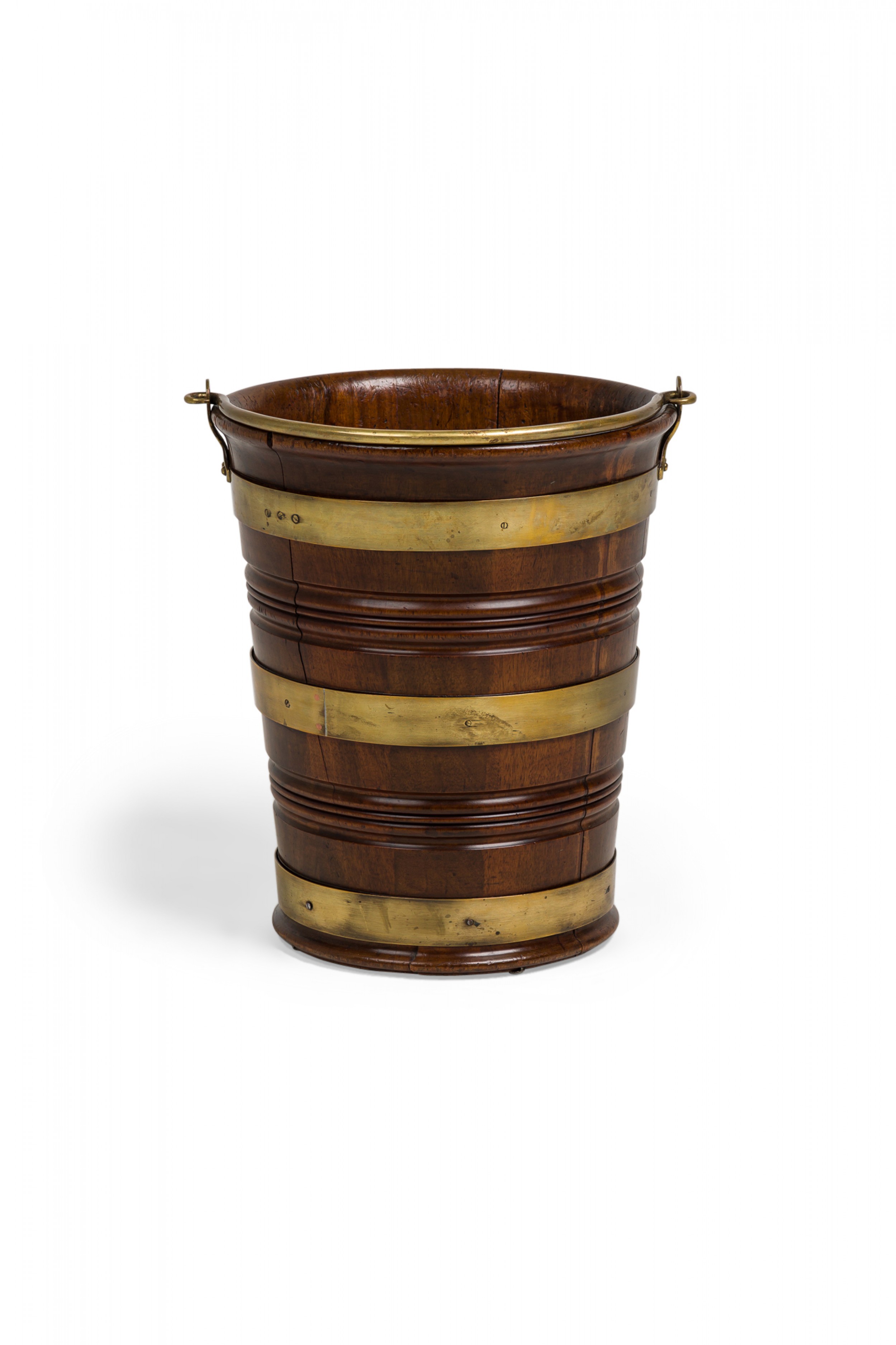 English George III tapered cylindrical mahgoany peat bucket, formed from 2 joined halves with turned embellishments, solid brass handle and horizontal band reinforcements..
