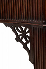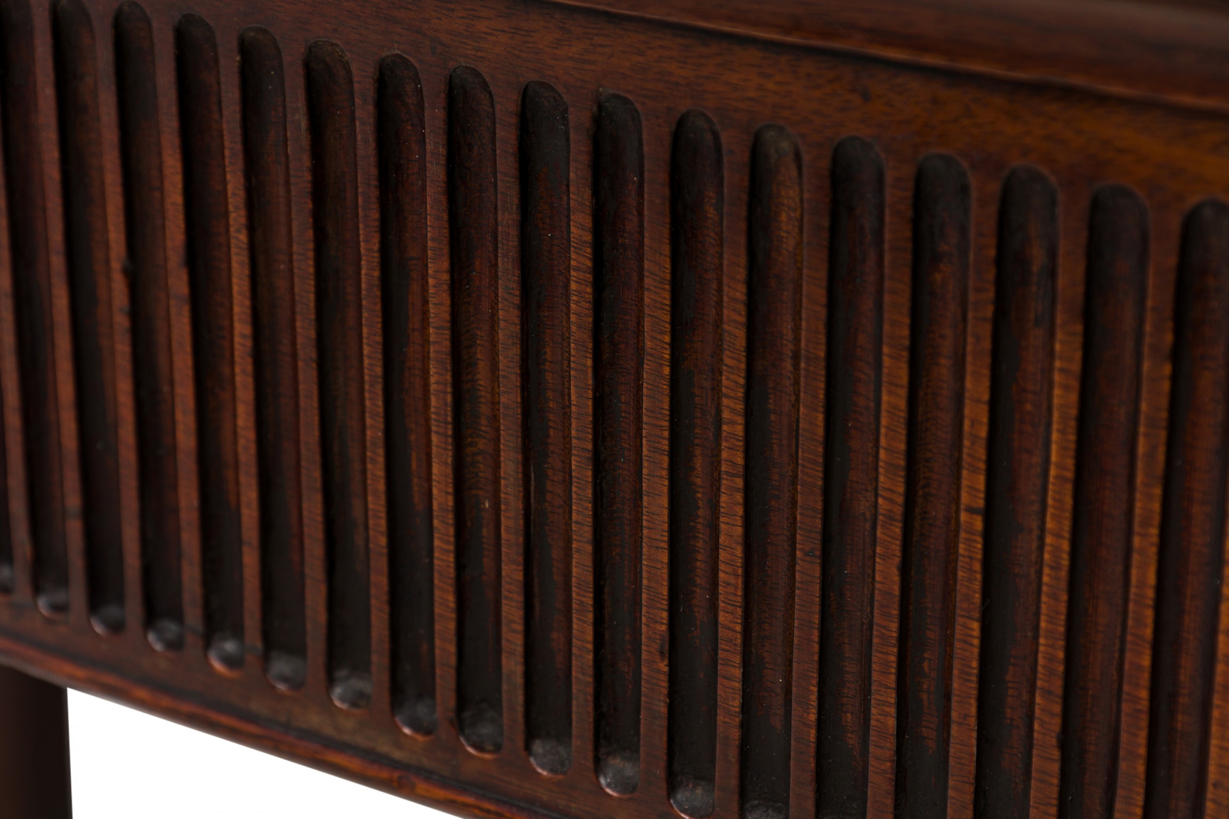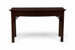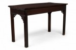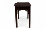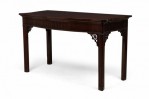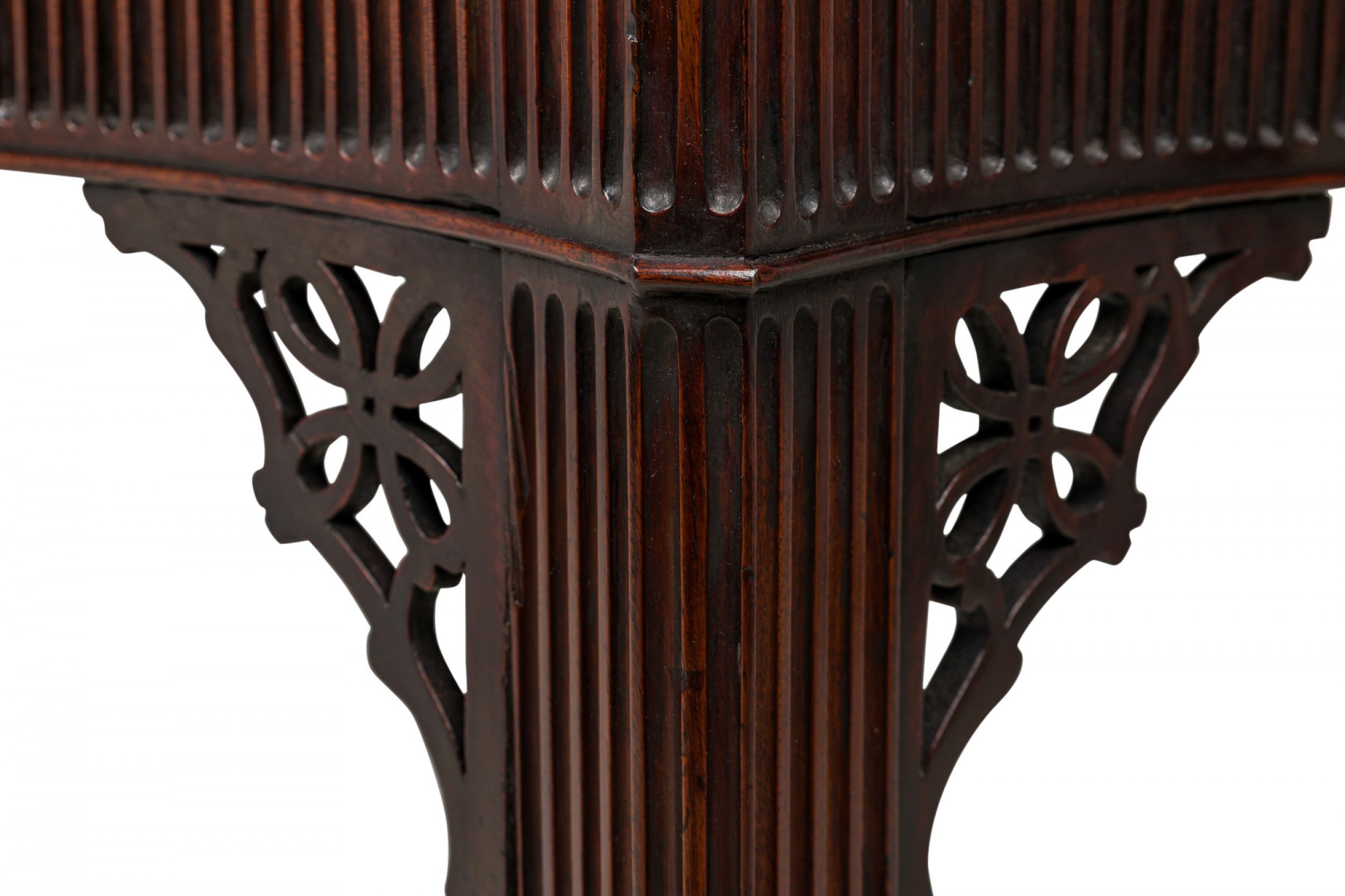 English George III (18th Century) shaped rectangular table with carved fluted apron extending from the 2 sides to the front, flattened pierced scroll adornments at the interior corners and 5-sided pentagon legs fluted at the corners.