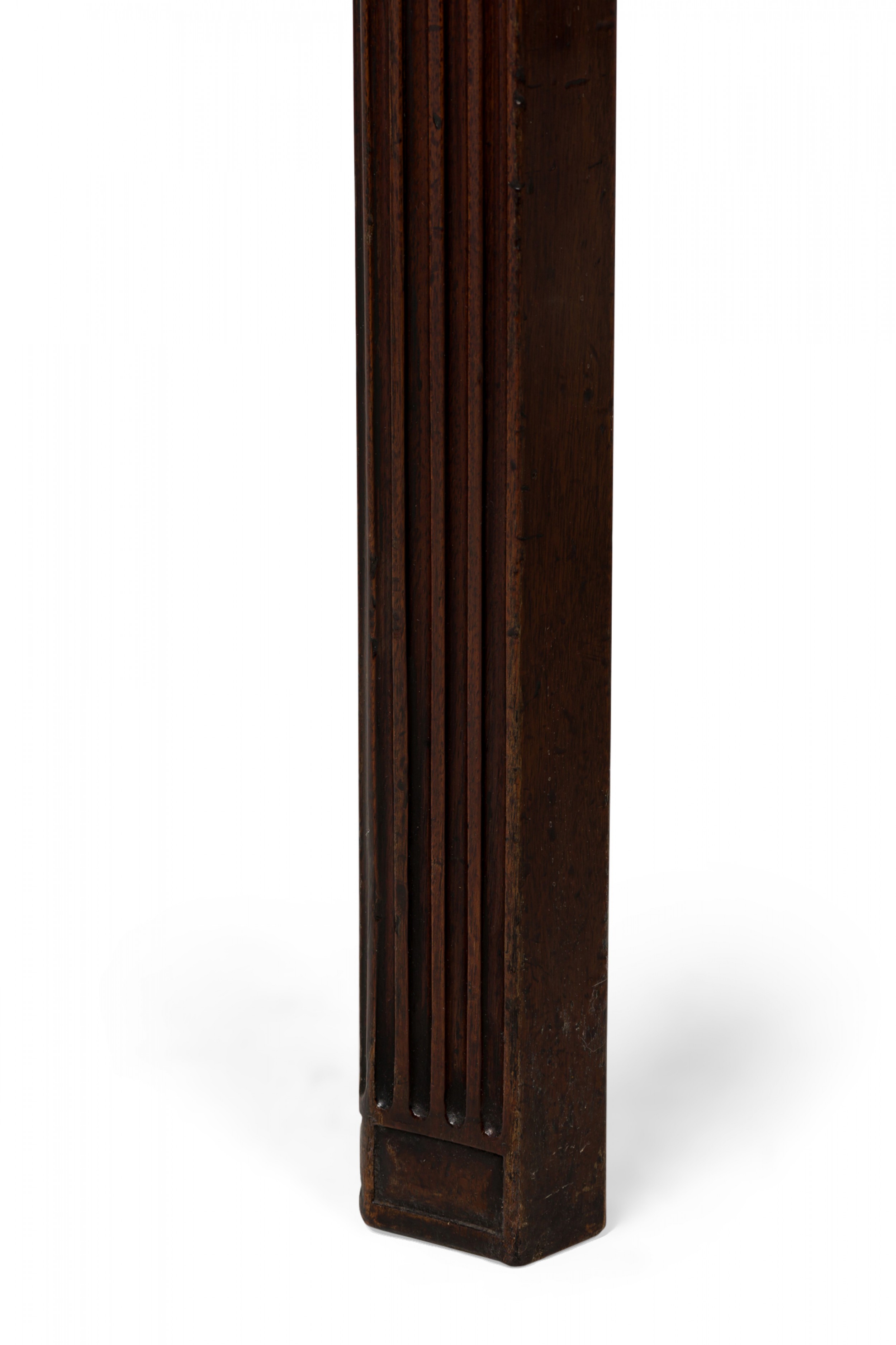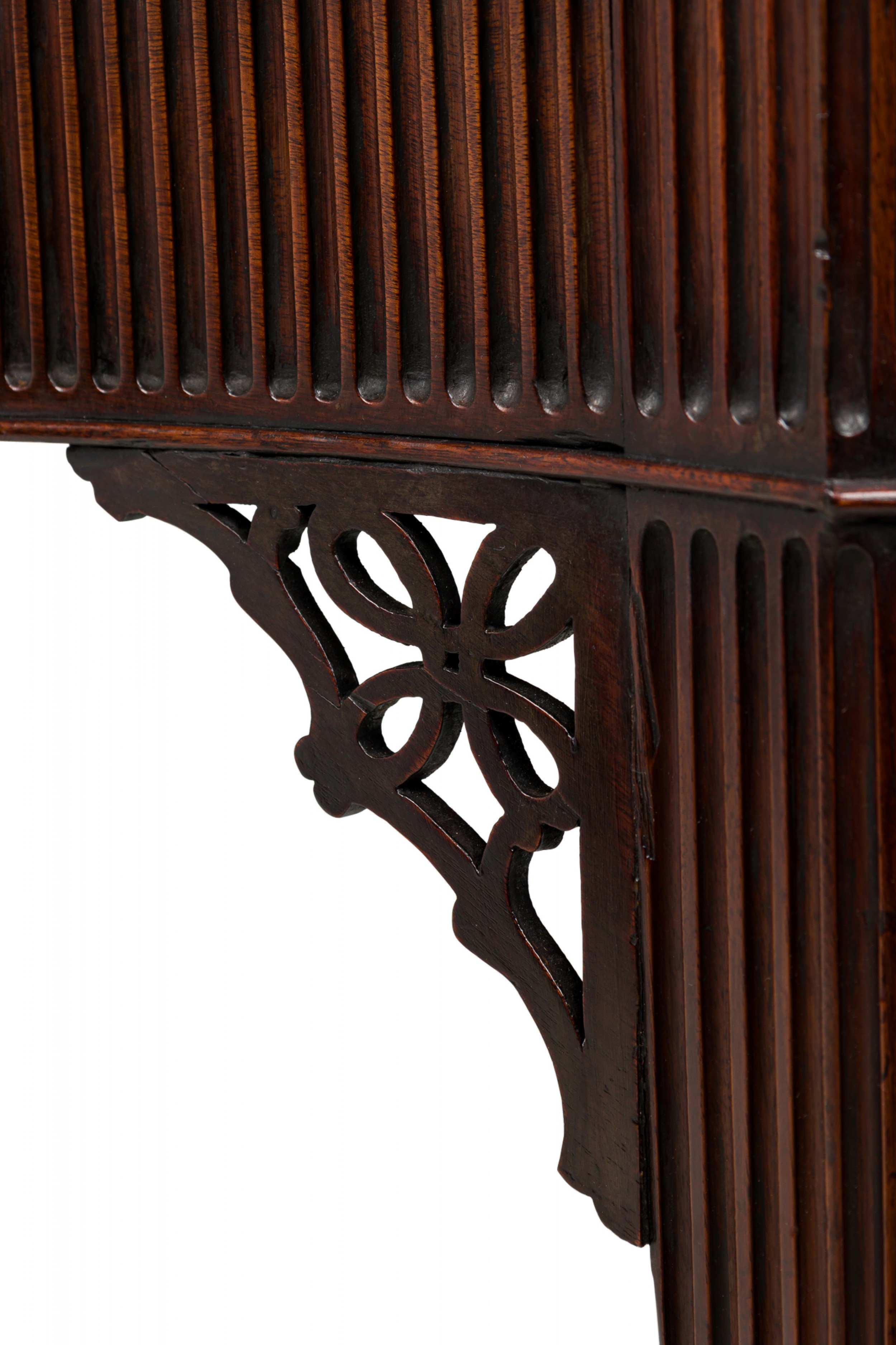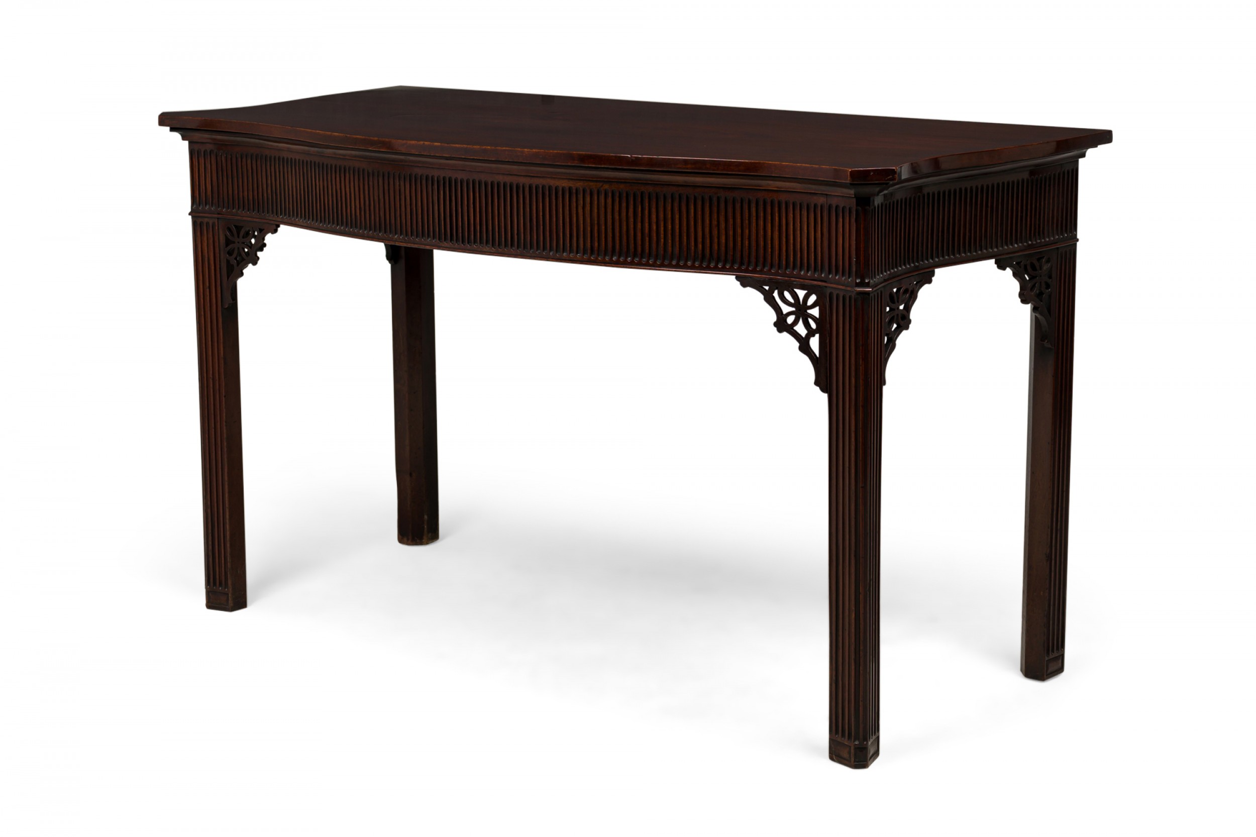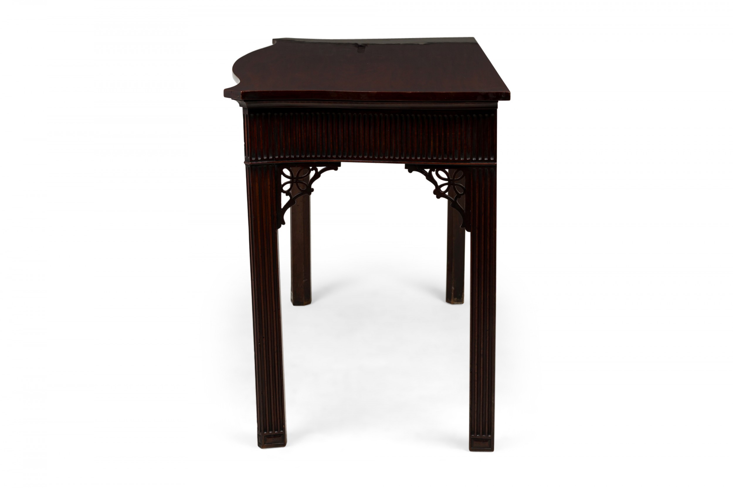 English George III (18th Century) shaped rectangular table with carved fluted apron extending from the 2 sides to the front, flattened pierced scroll adornments at the interior corners and 5-sided pentagon legs fluted at the corners..