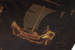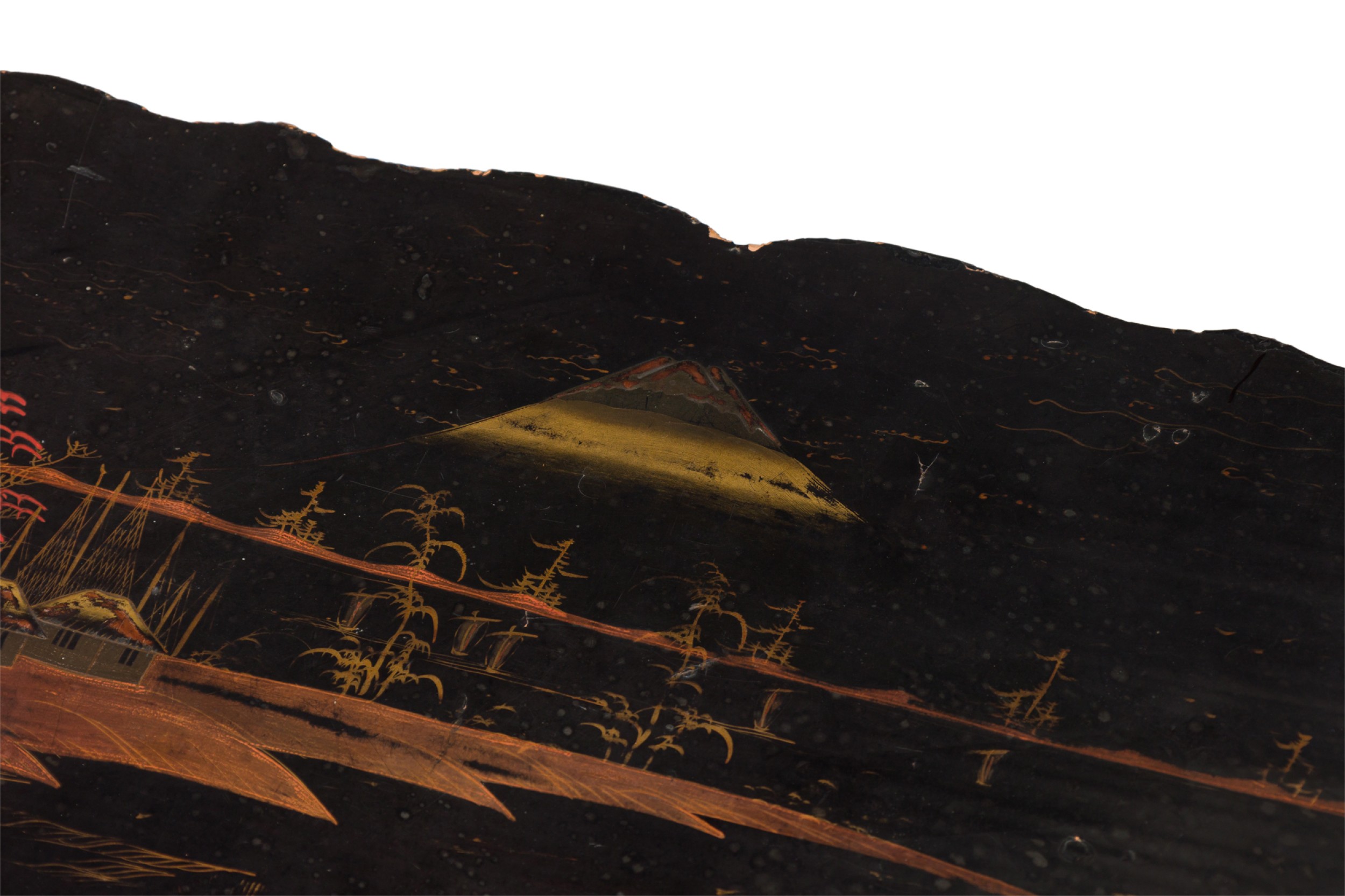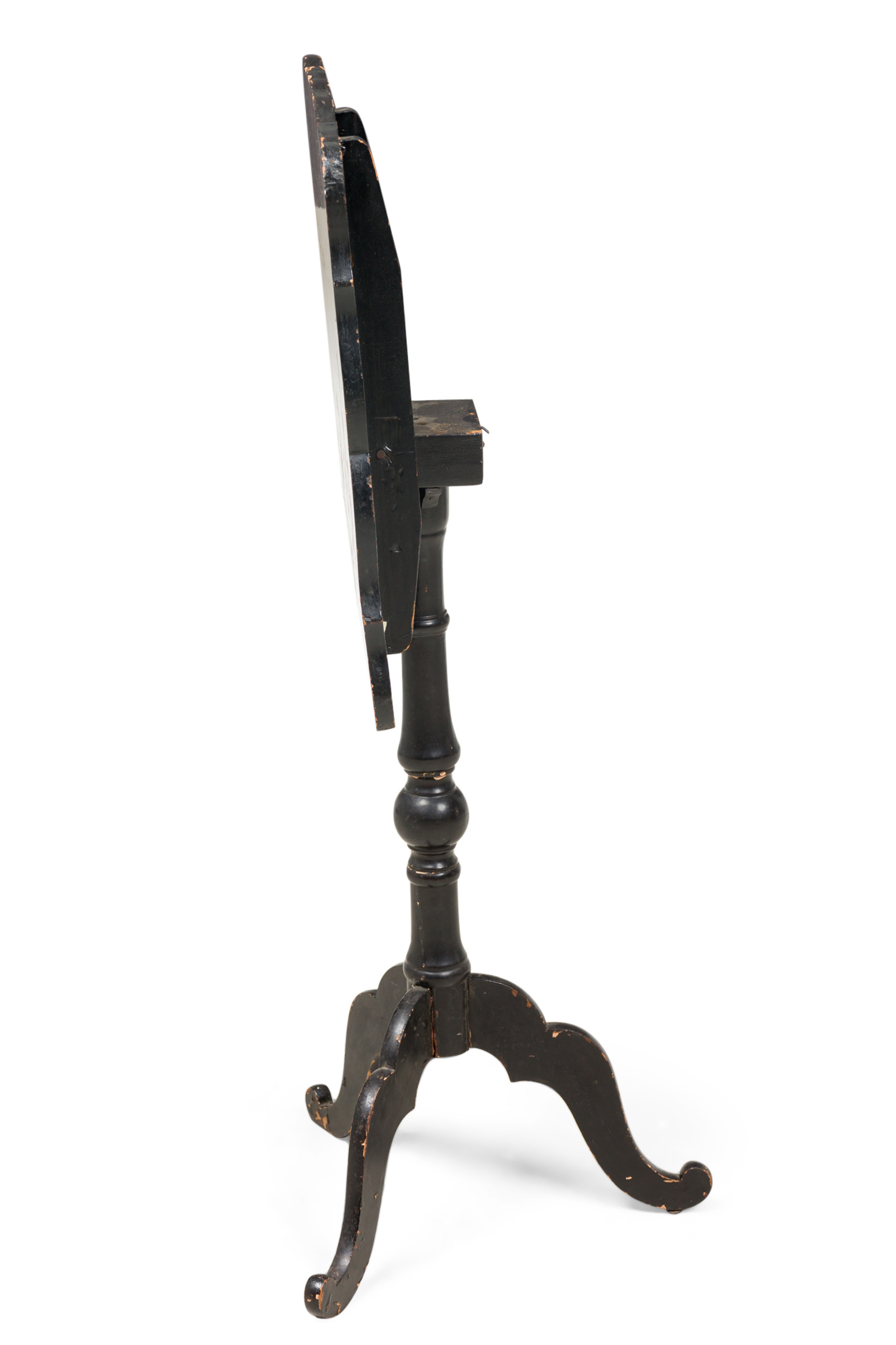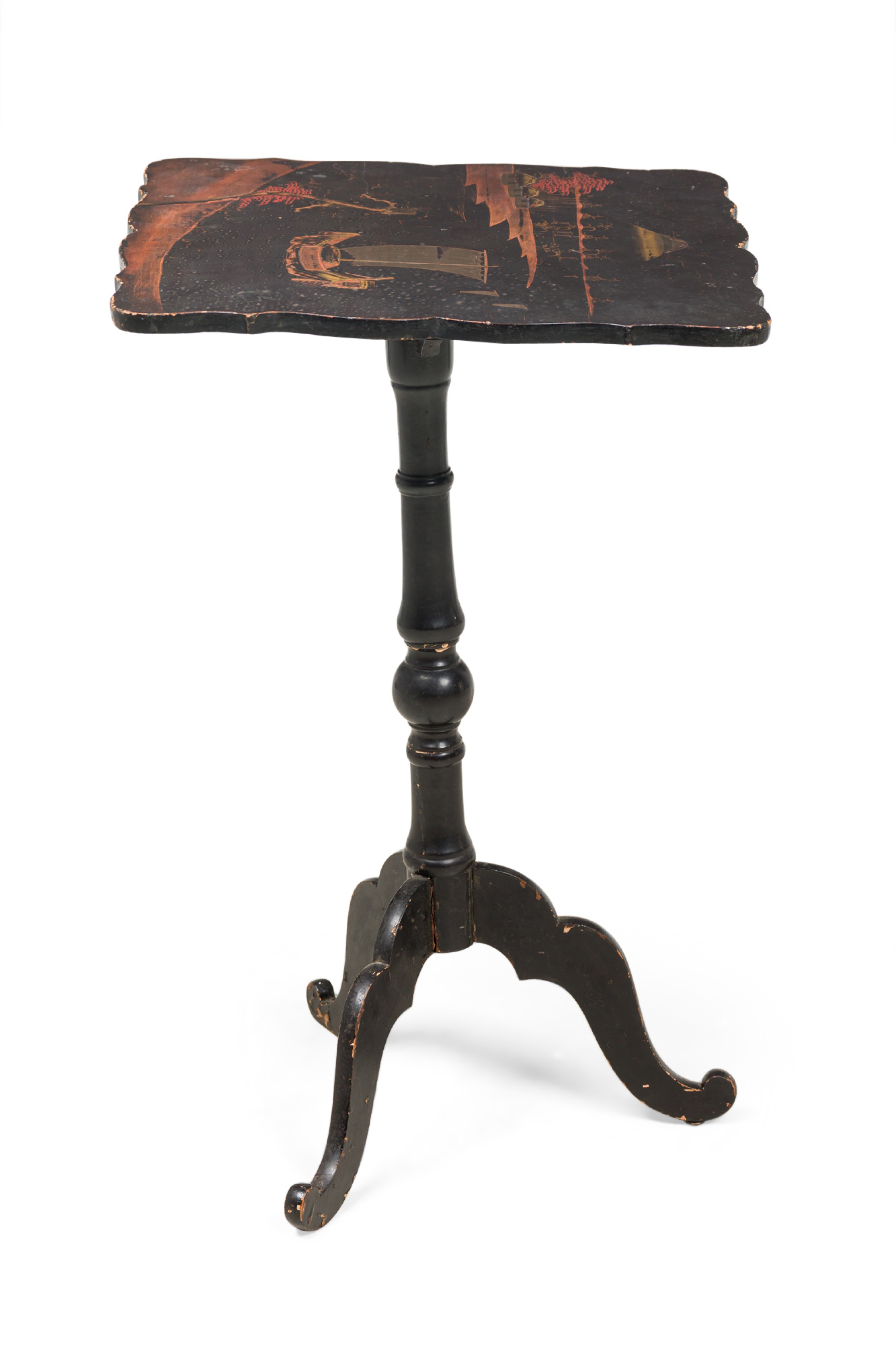 English George III Japanned tilt top end / side table featuring a tabletop with a scalloped edge decorated with a painted and gilt pastoral scene of boats on water with a mountain in the distance, resting on a turned pedestal with three shaped scroll form legs..
