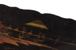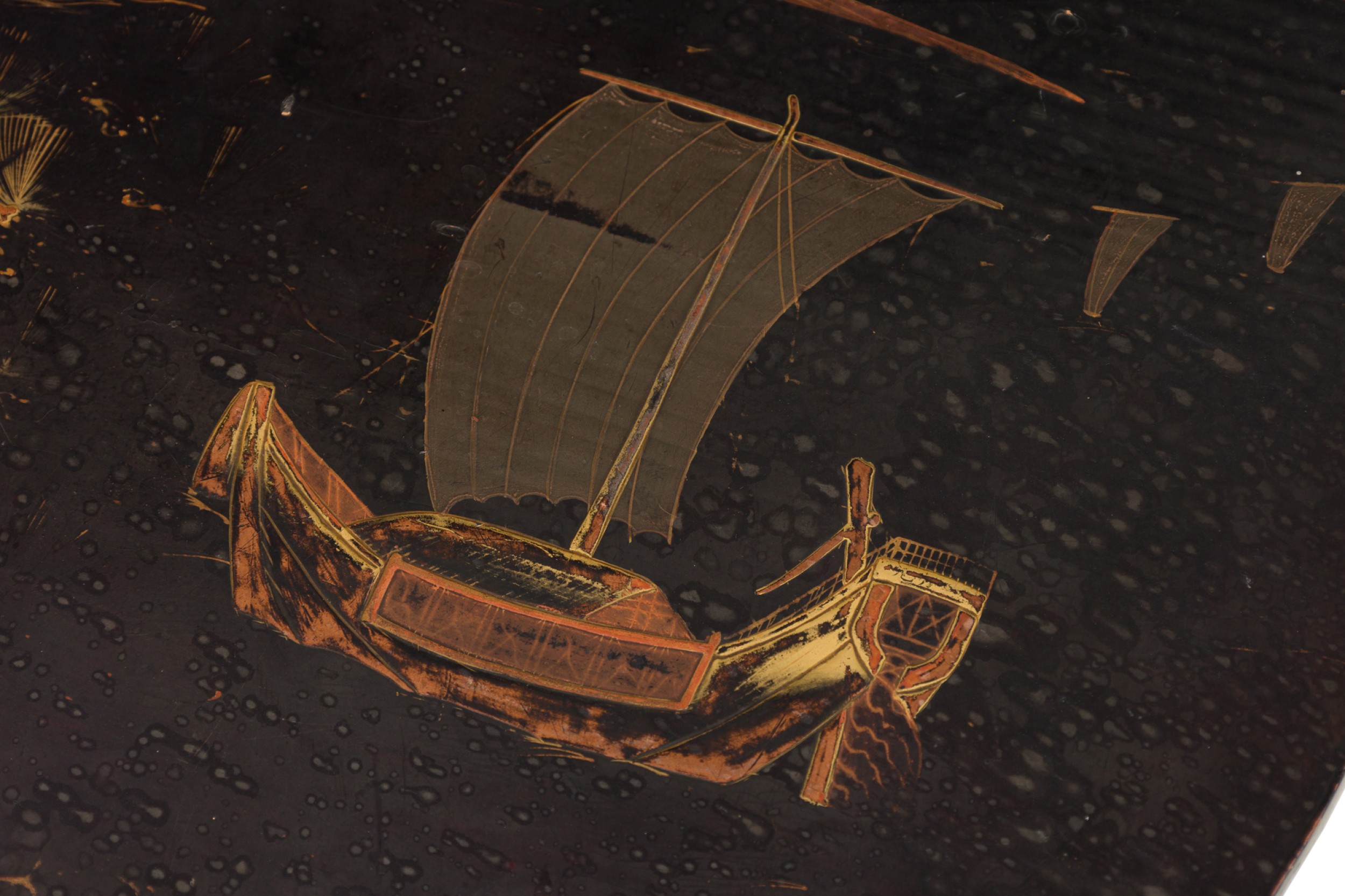 English George III Japanned tilt top end / side table featuring a tabletop with a scalloped edge decorated with a painted and gilt pastoral scene of boats on water with a mountain in the distance, resting on a turned pedestal with three shaped scroll form legs.