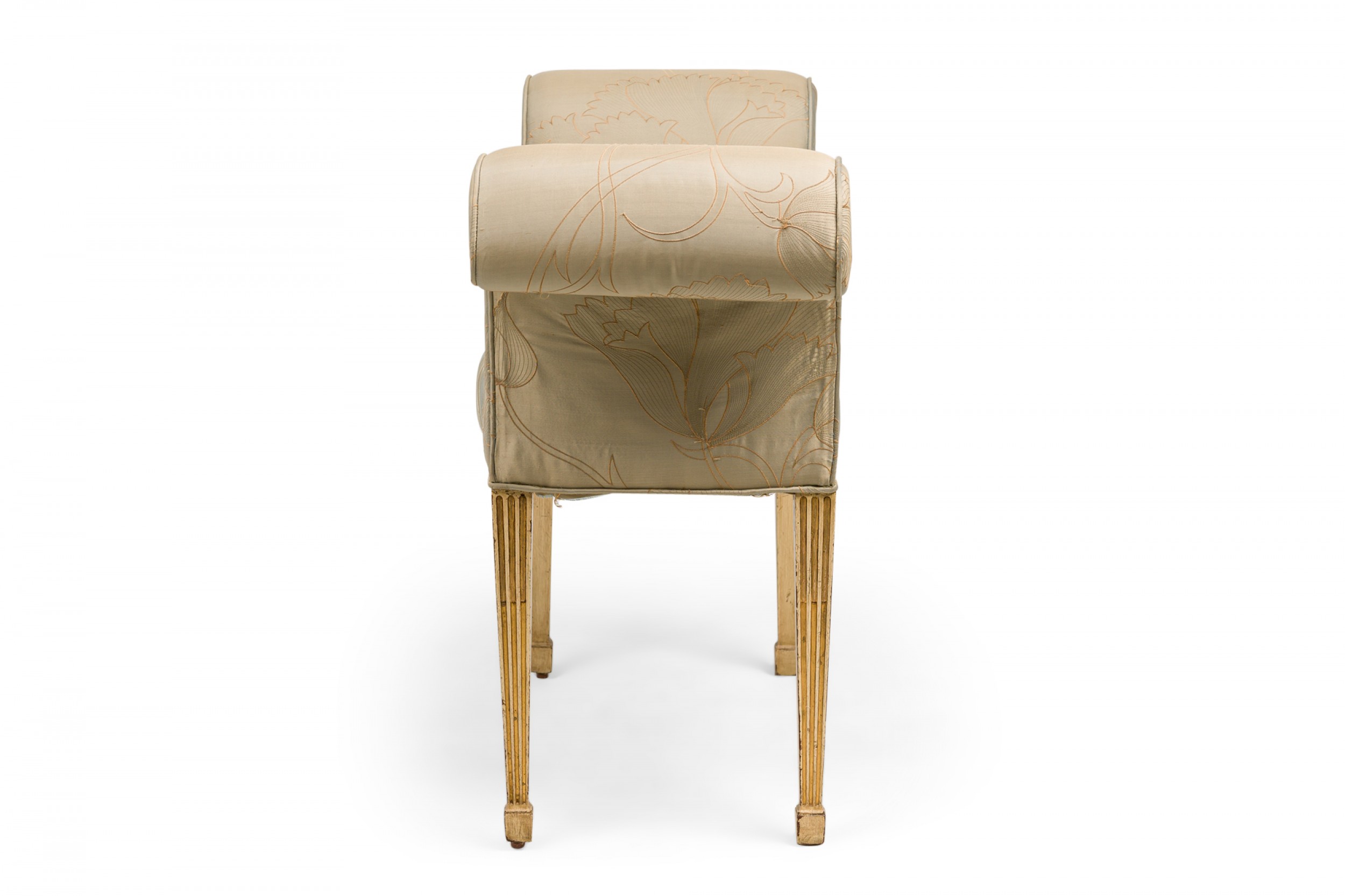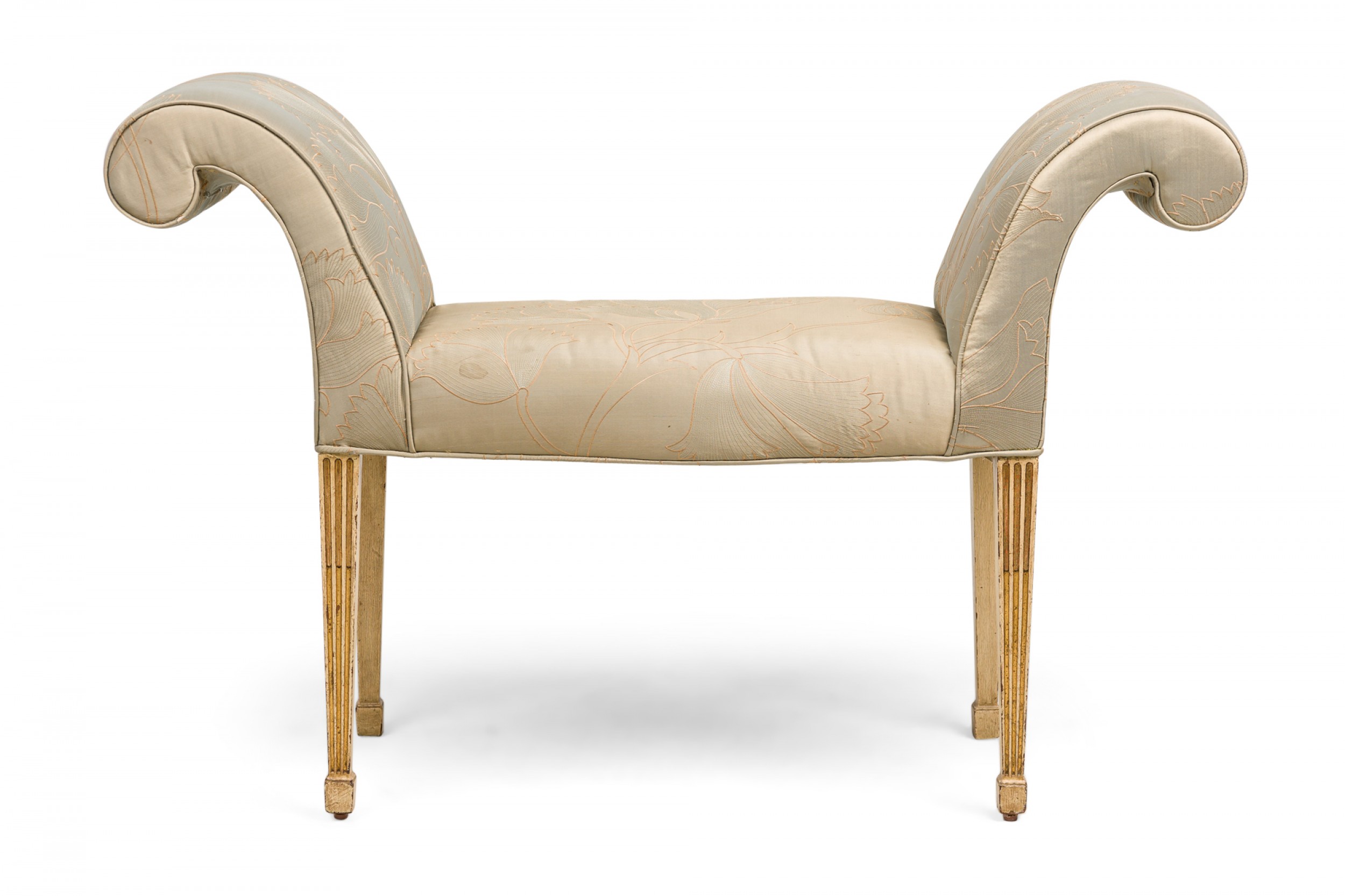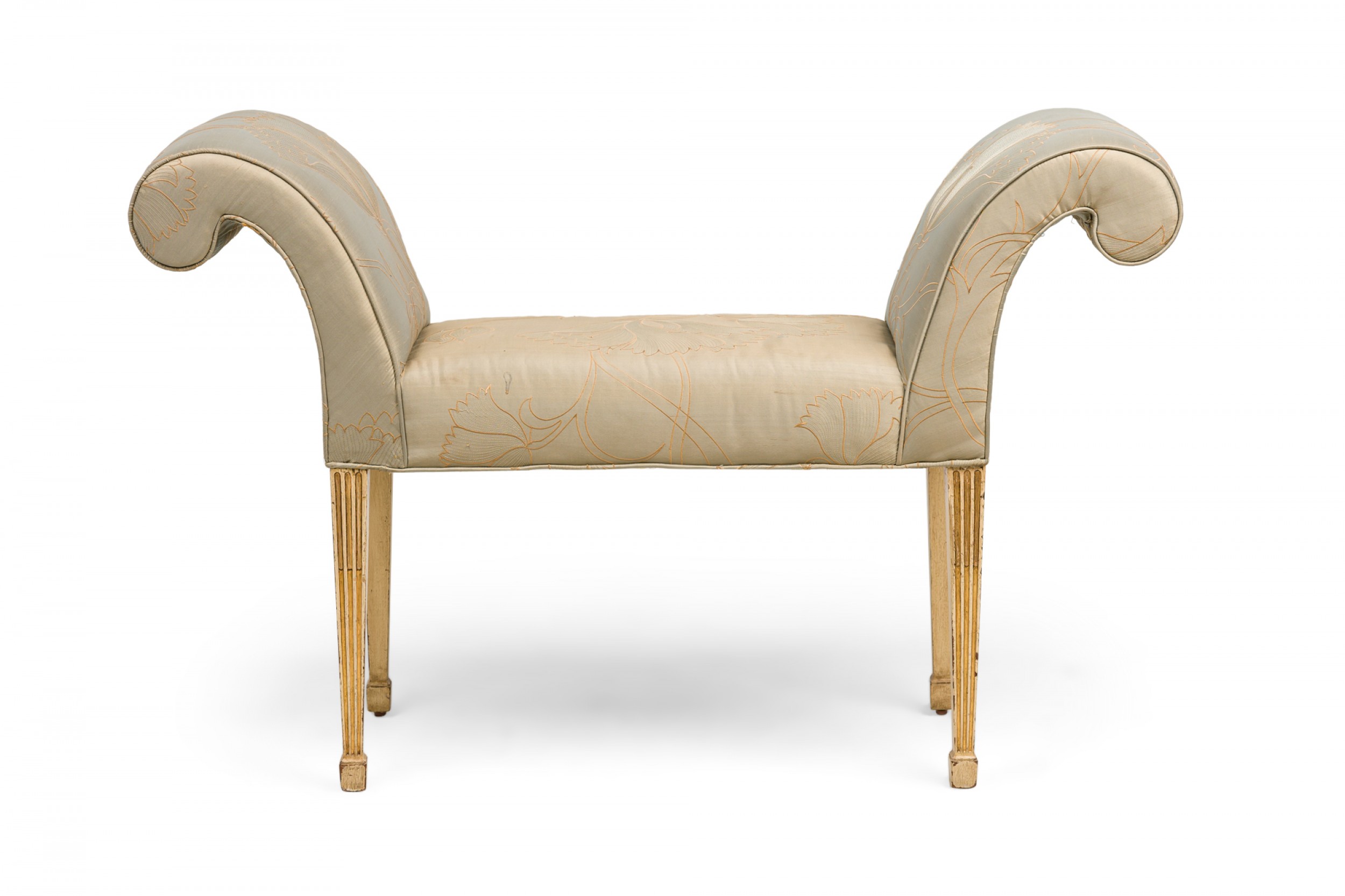 English George III style (19th Century) rectangular window seat /bench having a slight bow front with scroll side arms, upholstered in a gray satin fabric with raised floral embroidery, on fluted parcel gilt painted legs. (Label: WARING & SON)