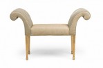 English George III style (19th Century) rectangular window seat /bench having a slight bow front with scroll side arms, upholstered in a gray satin fabric with raised floral embroidery, on fluted parcel gilt painted legs. (Label: WARING & SON).