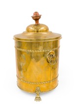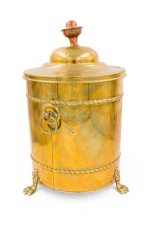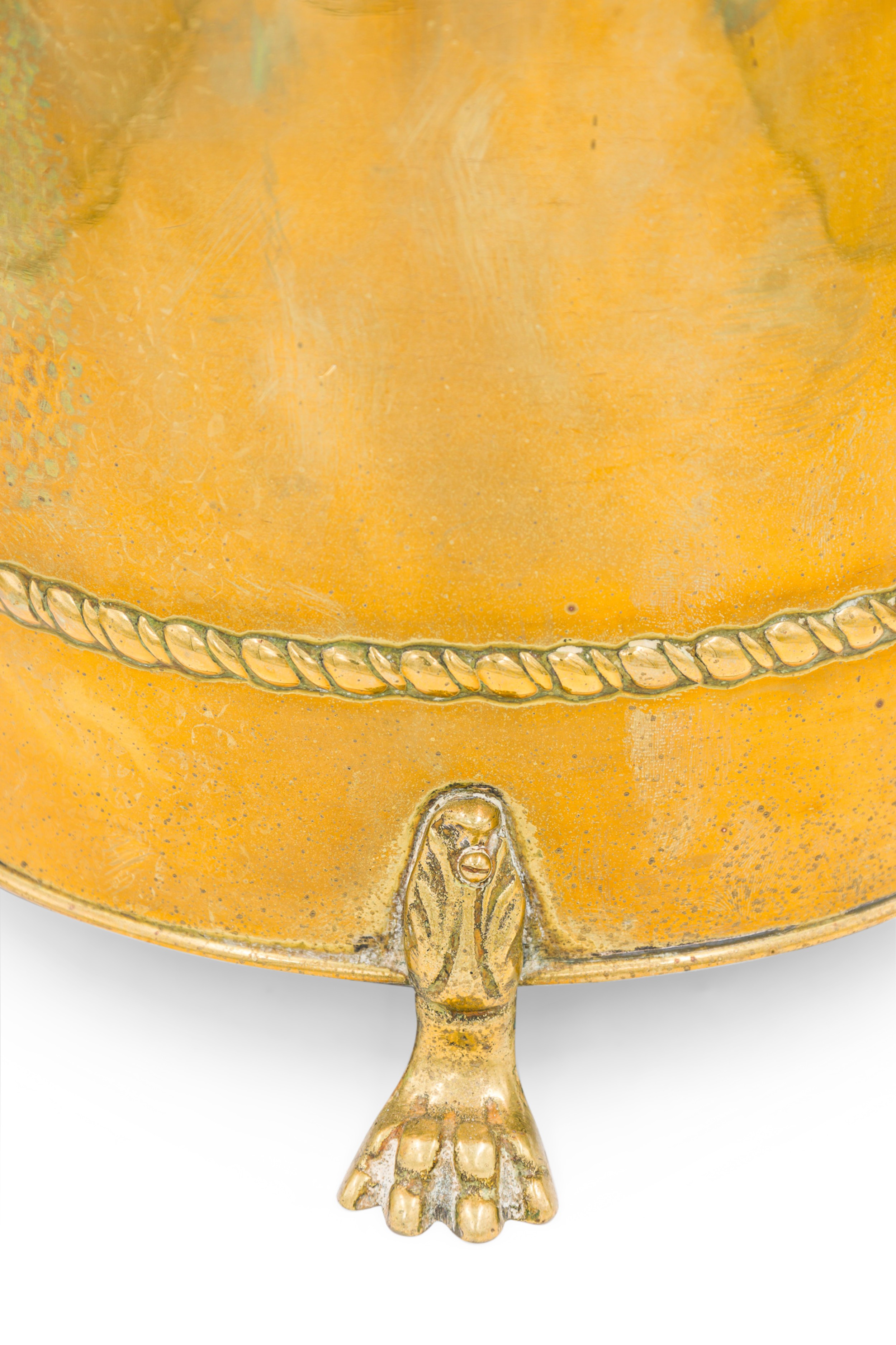English Georgian style (20th Century) brass round bucket with lid and two small round brass handles resting on 3 claw feet