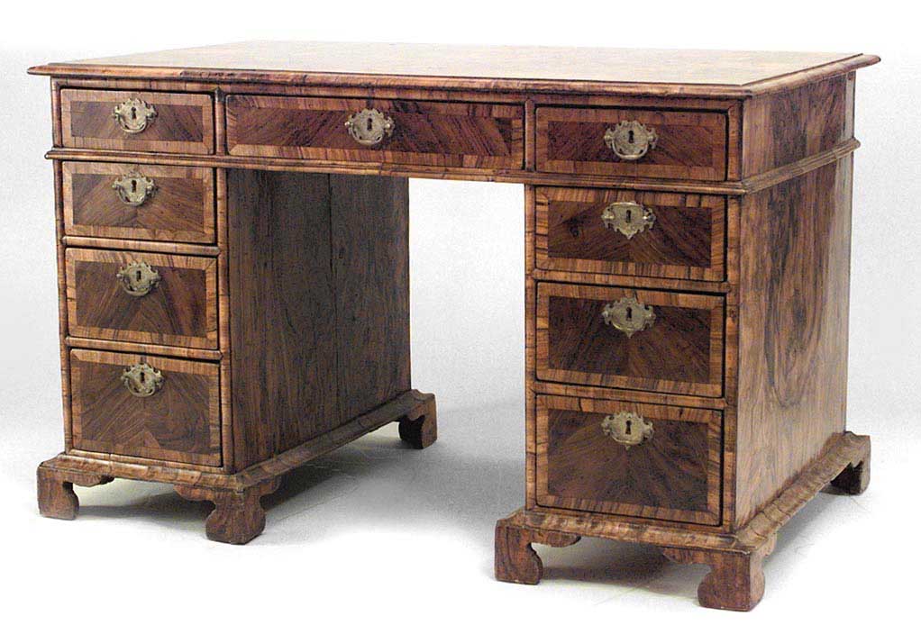 English Georgian style (18/19th Century) burl walnut kneehole desk with 9 drawers.
