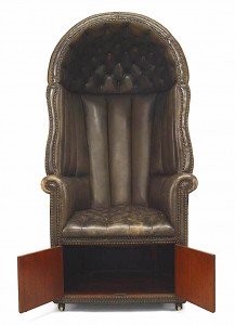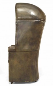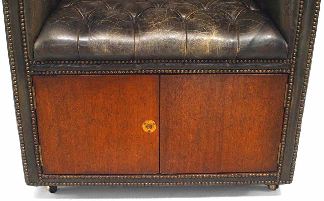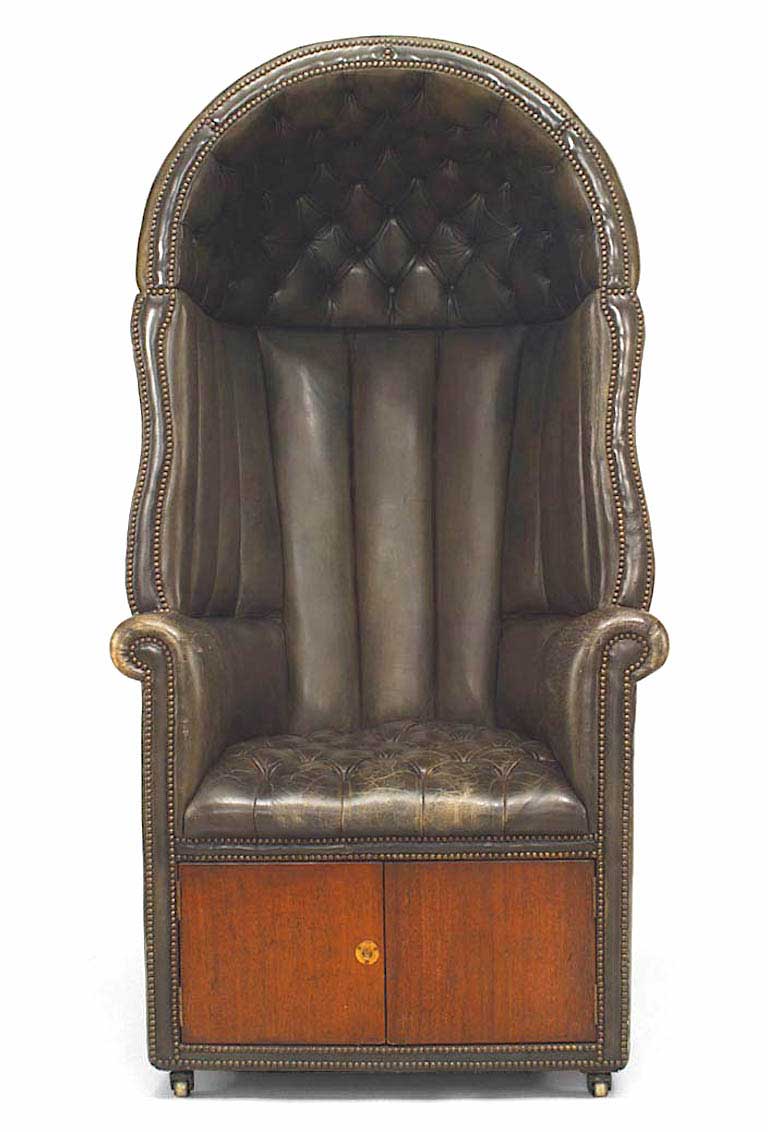 English Georgian style draft arm chair upholstered in tufted green leather with hood above wings & a seat over 2 doors (late 19th/early 20th Cent)