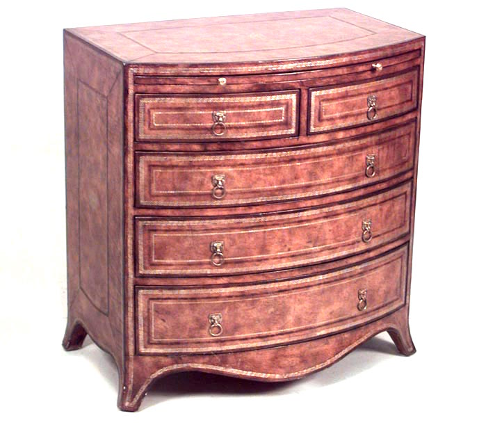English Georgian style (20th Century) brown leather bow front bachelors chest with gold embossed trim. (att: MAITLAND-SMITH)