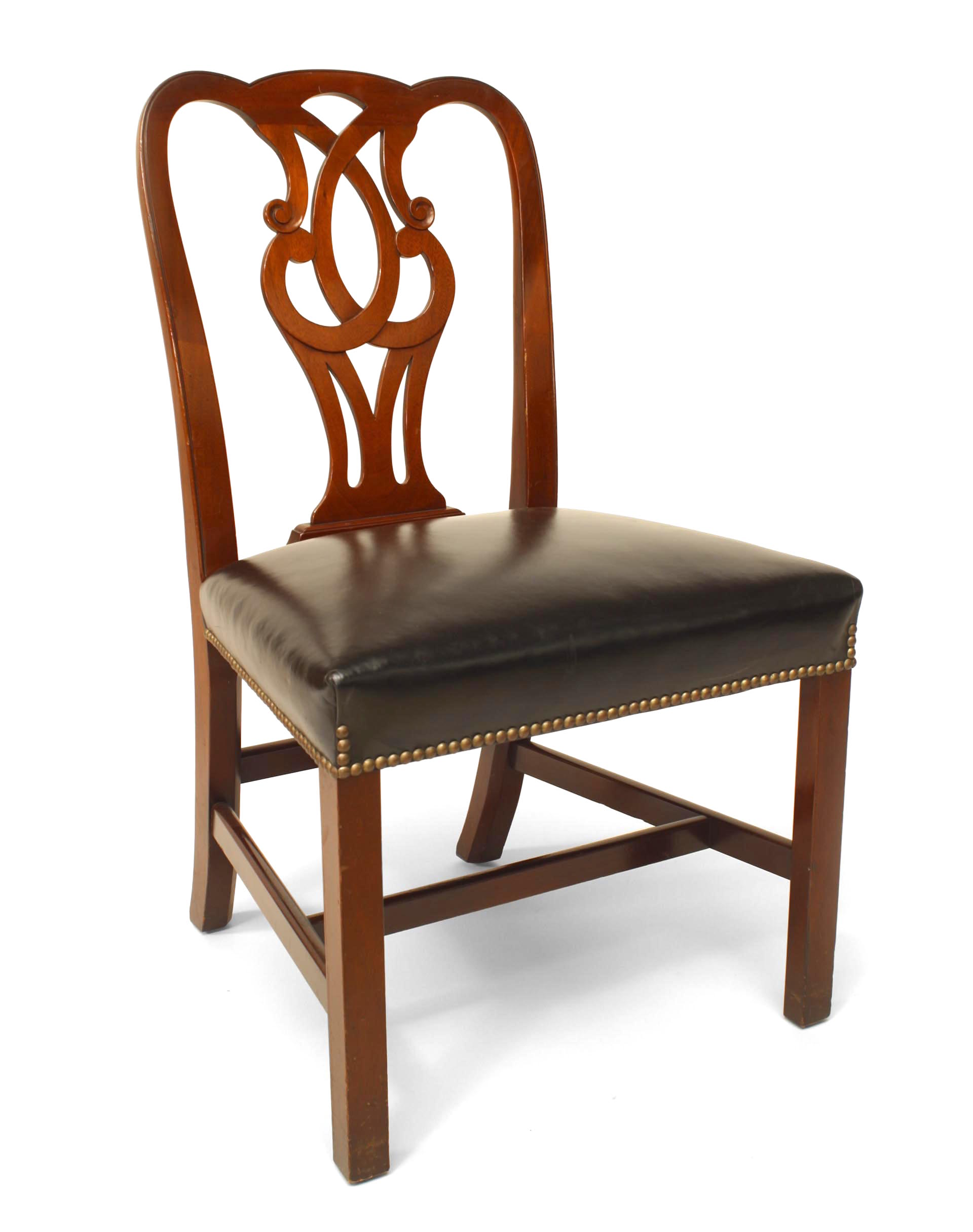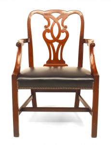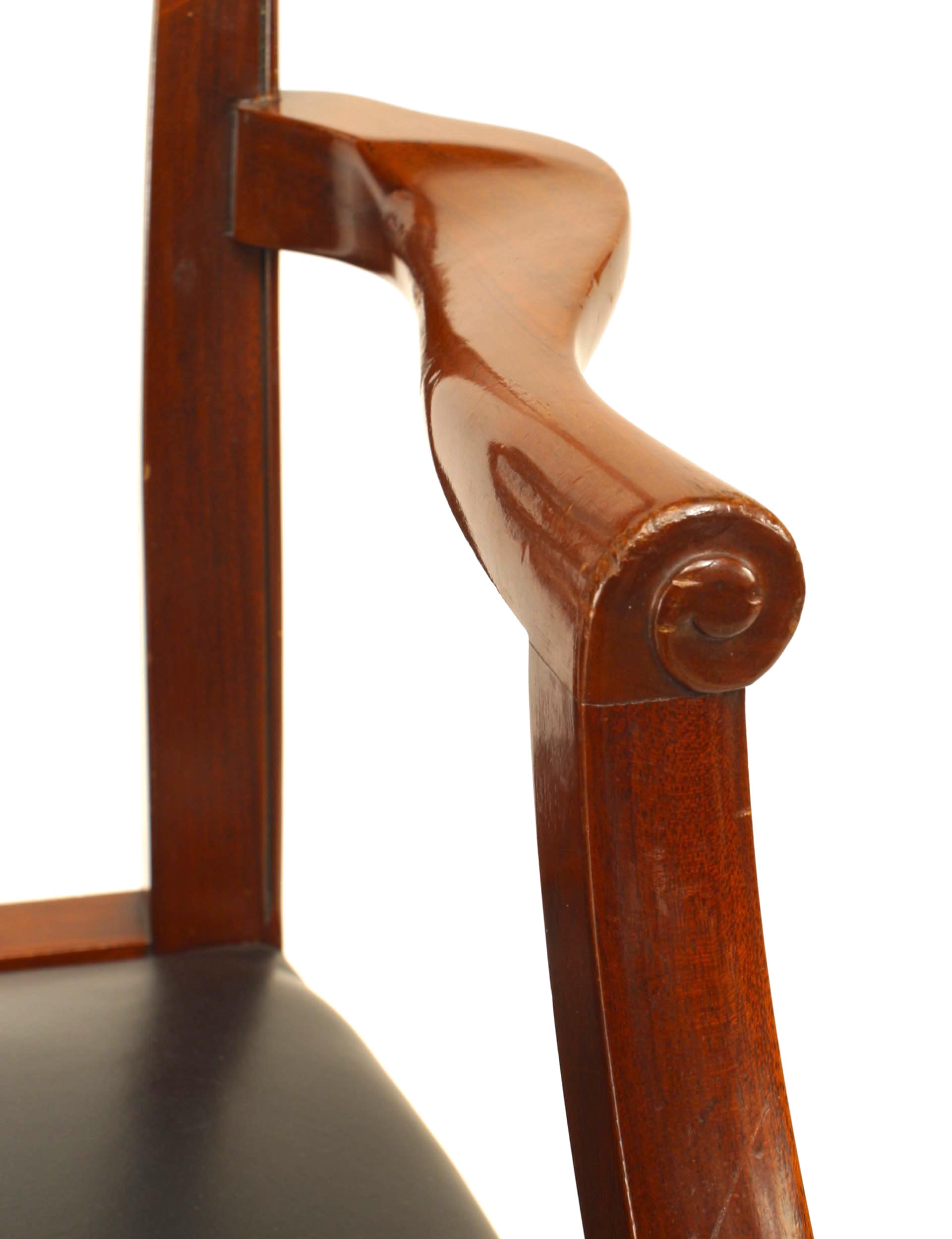 Style: English Materials & Techniques: Mahogany, leather Category: Seating, Office/Library, Dining Room Condition: Visible cracks on leather (minor).