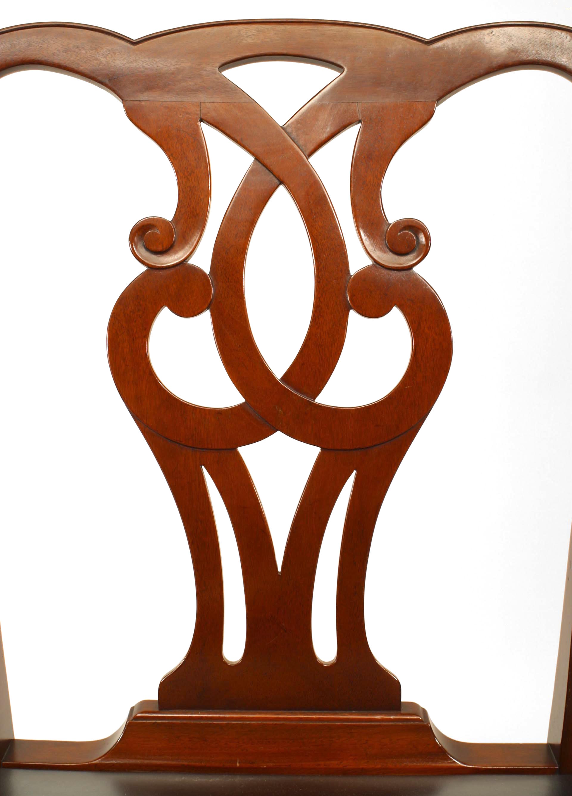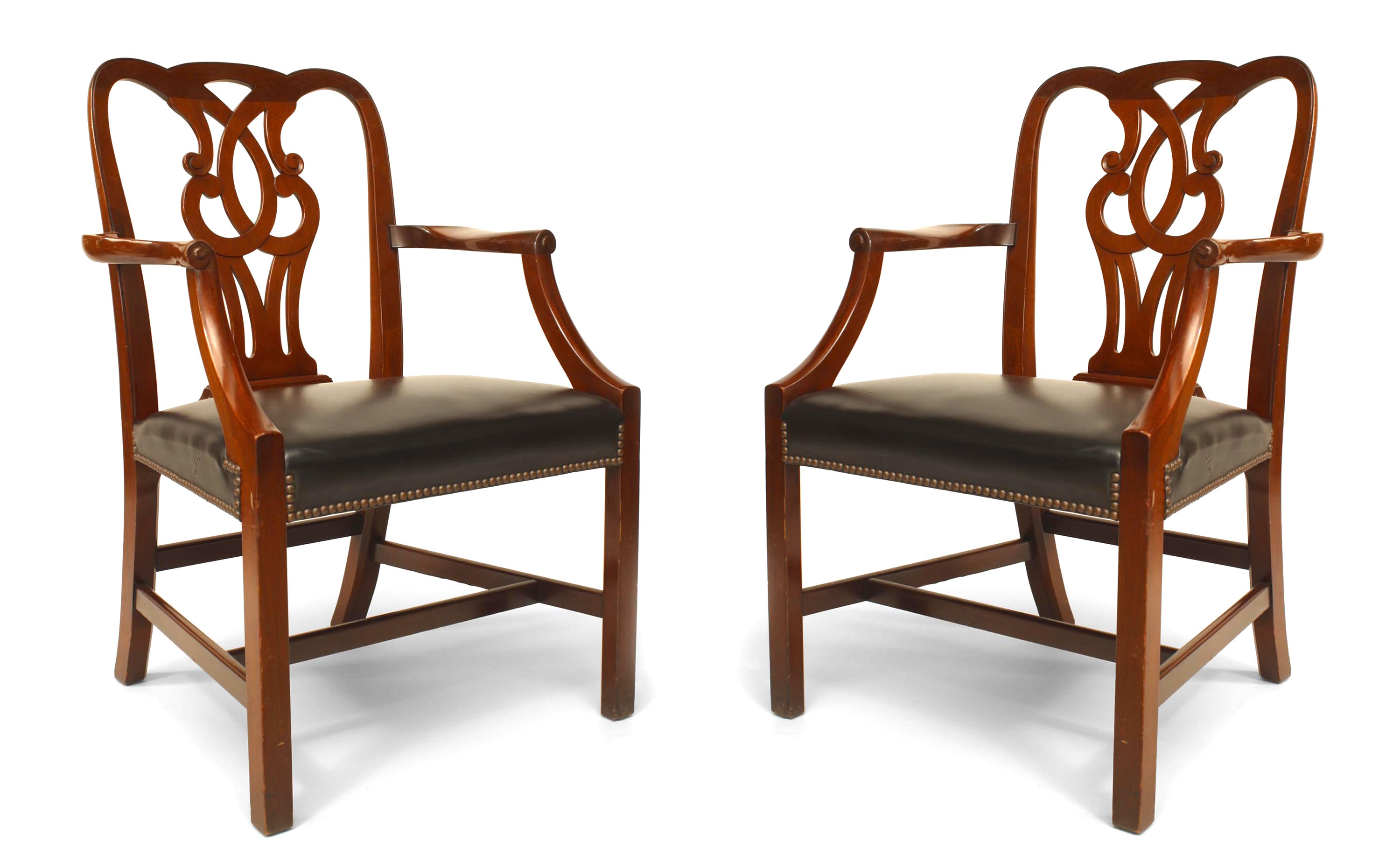 SET of 12 English Georgian style (20th Cent) mahogany chairs (2 arm/10 sides) with open scroll back and black leather seat. Side: 22½"w x 22½"d x 37"h.