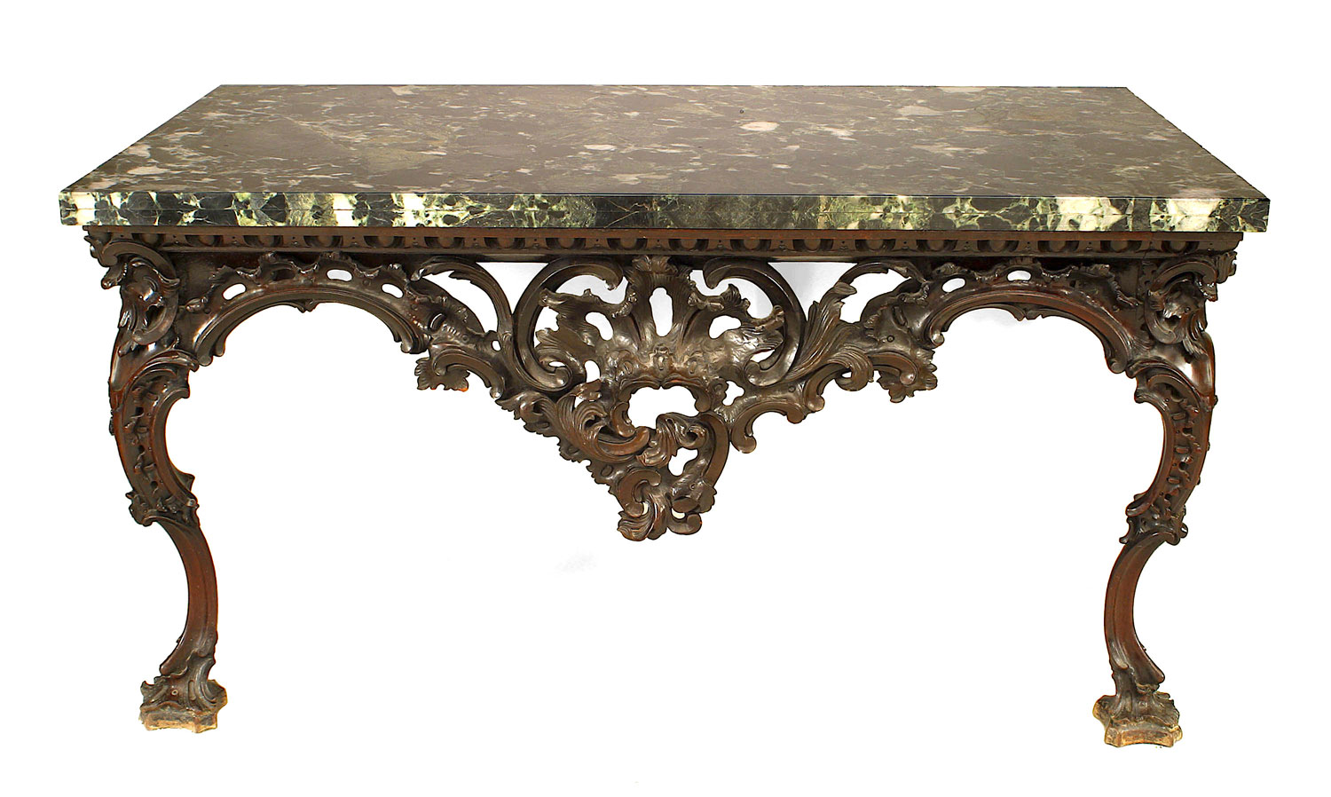 English Georgian (18th Century) mahogany bracket console table with a filigree floral and scroll carved apron and 2 front cabriole form legs supporting a green marble top..