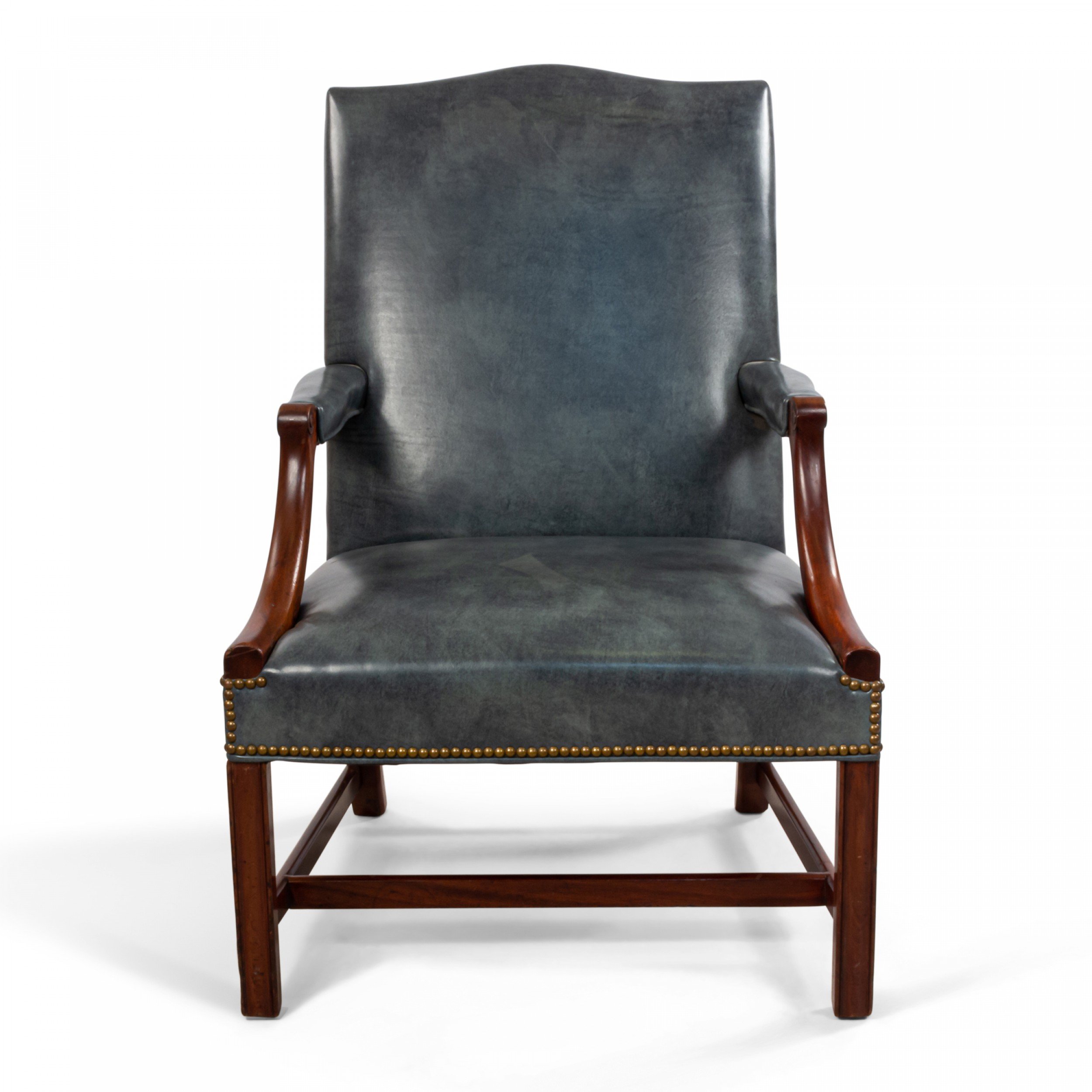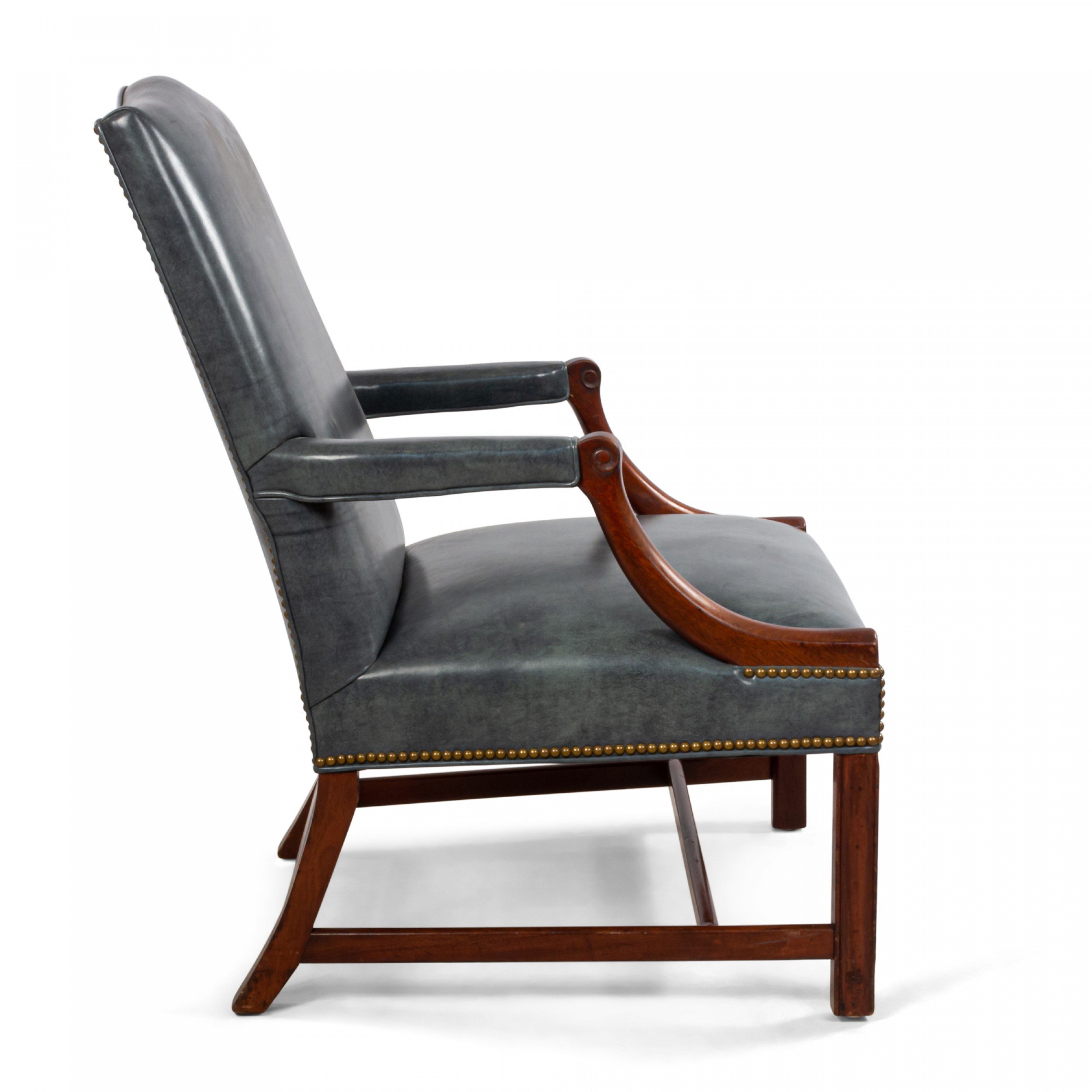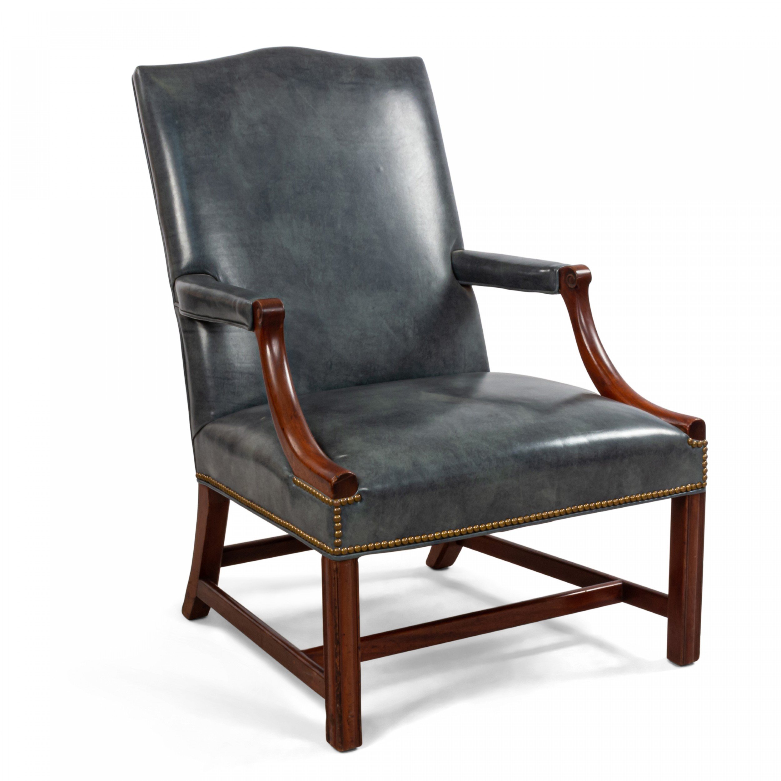 English Georgian style (20th Cent) mahogany open arm chair with shaped back and upholstered in a leather style blue/grey.