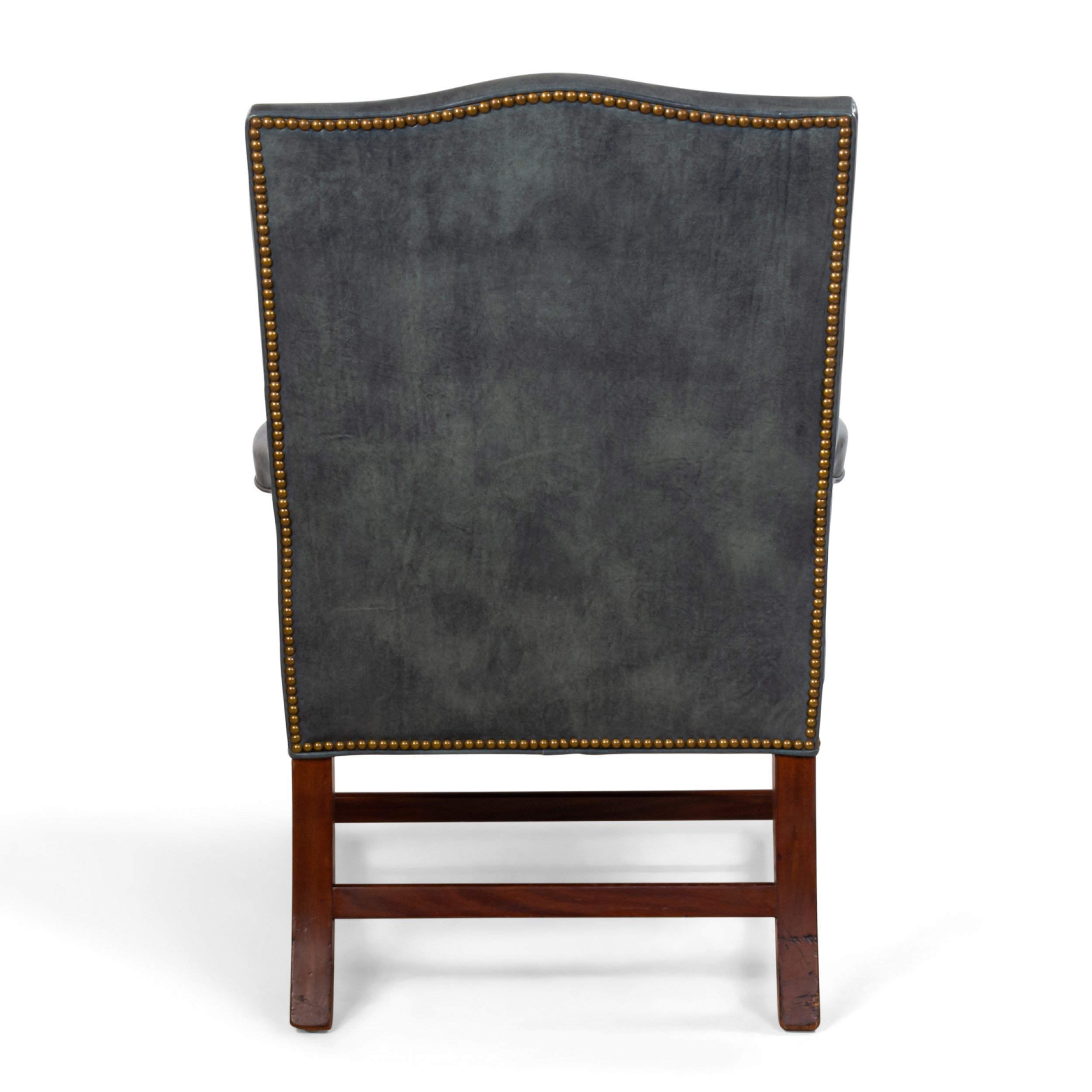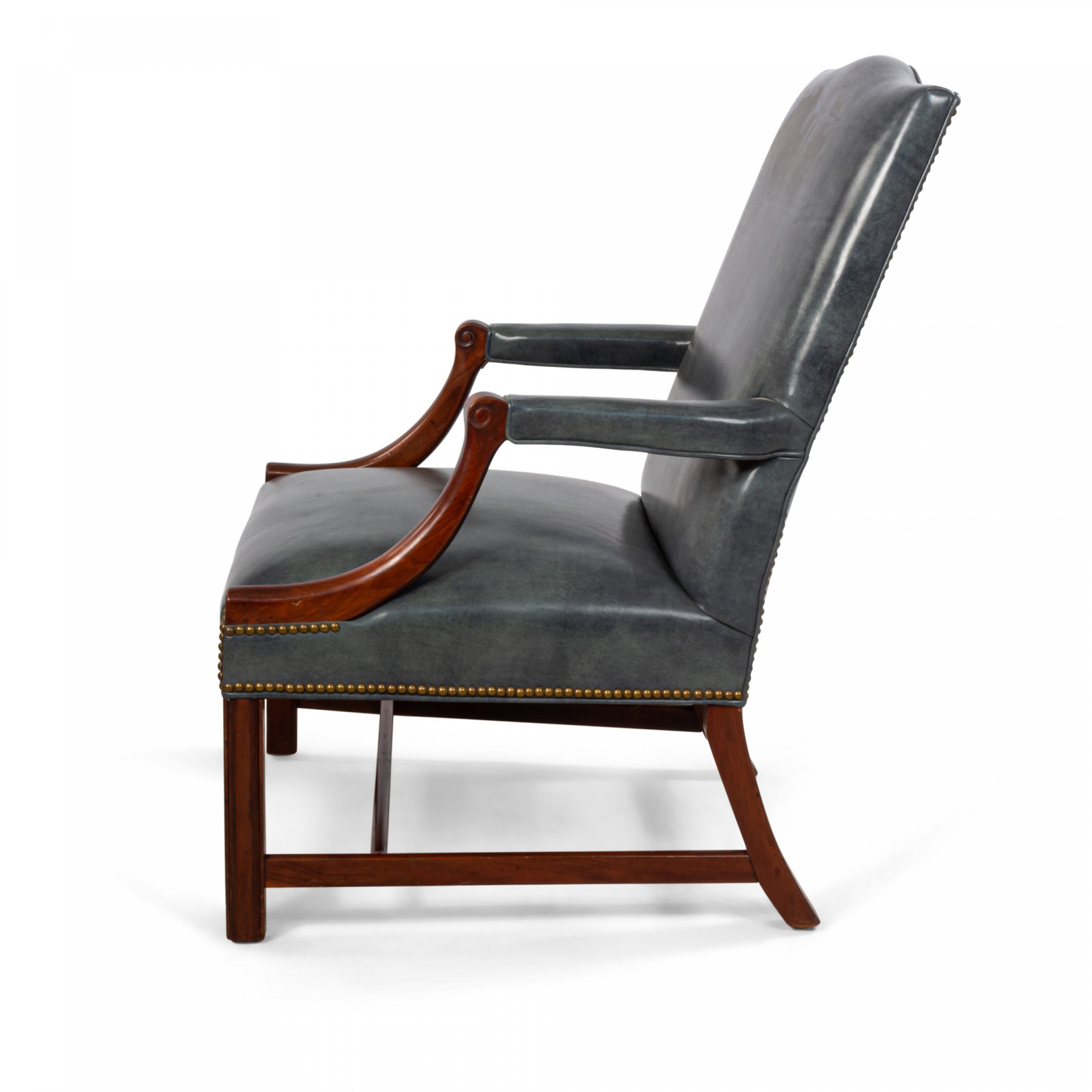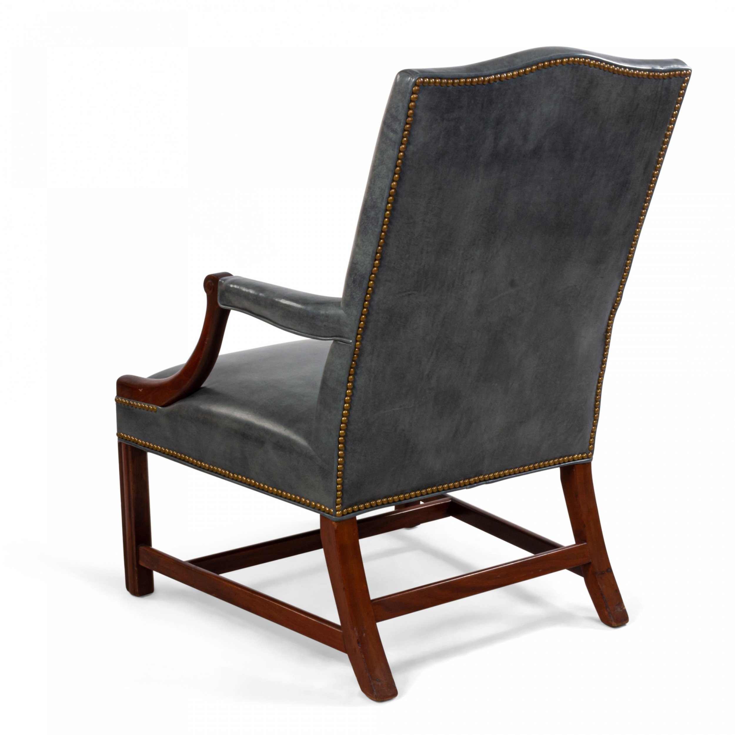 English Georgian style (20th Cent) mahogany open arm chair with shaped back and upholstered in a leather style blue/grey.