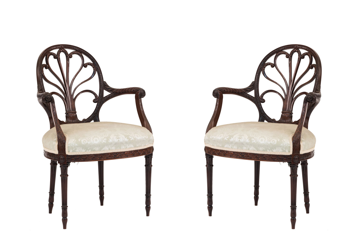 PAIR of English Georgian style mahogany Armchairs with carved palmette design back on fluted legs with upholstered seat (19th Cent.).