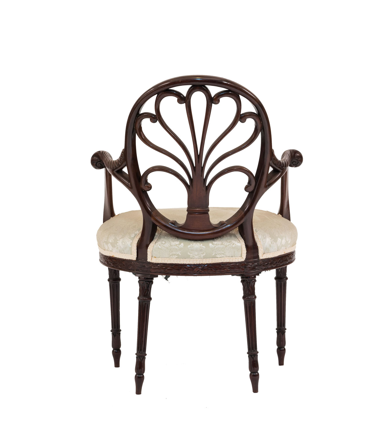 PAIR of English Georgian style mahogany Armchairs with carved palmette design back on fluted legs with upholstered seat (19th Cent.)