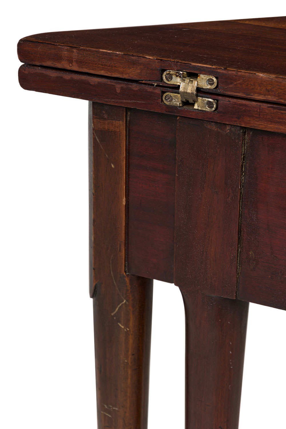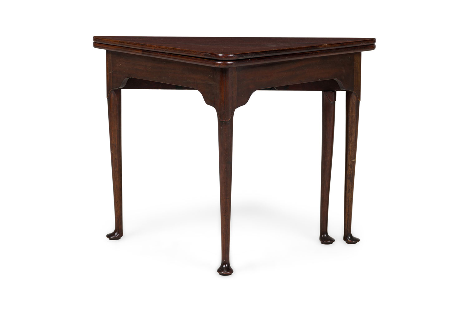 English Georgian-style (20th Century) mahogany triangular shaped flip top console table (Top measures 30.25" wide x 30.25" deep when opened).