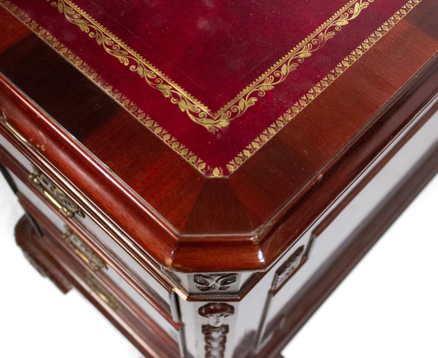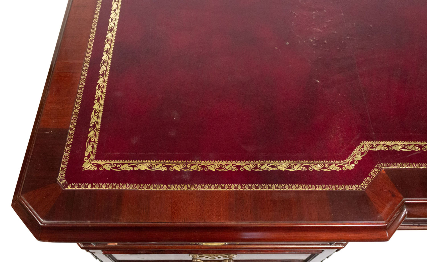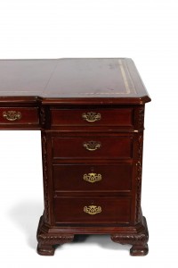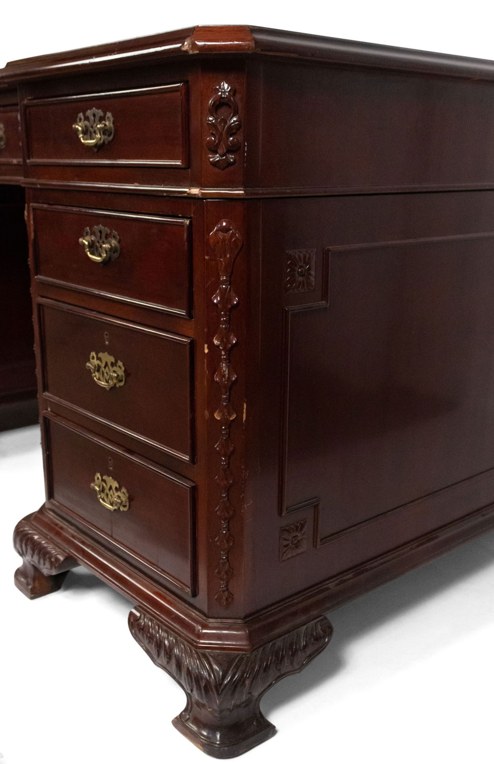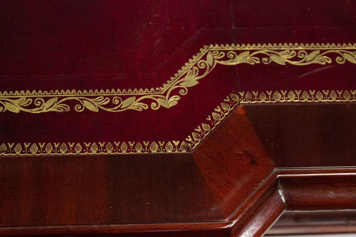 English Georgian style (20th Century) mahogany kneehole partners desk with 3 sections and burgundy leather top..
