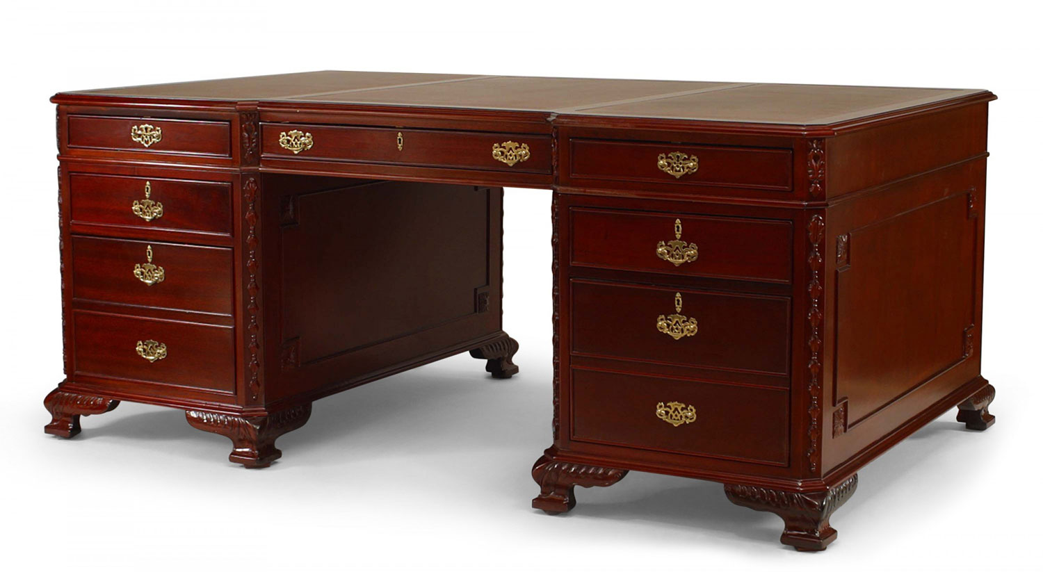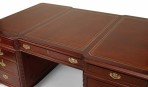 English Georgian style mahogany partner's desk with kneehole design surrounded by drawers and 3 section leather top..