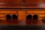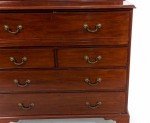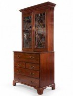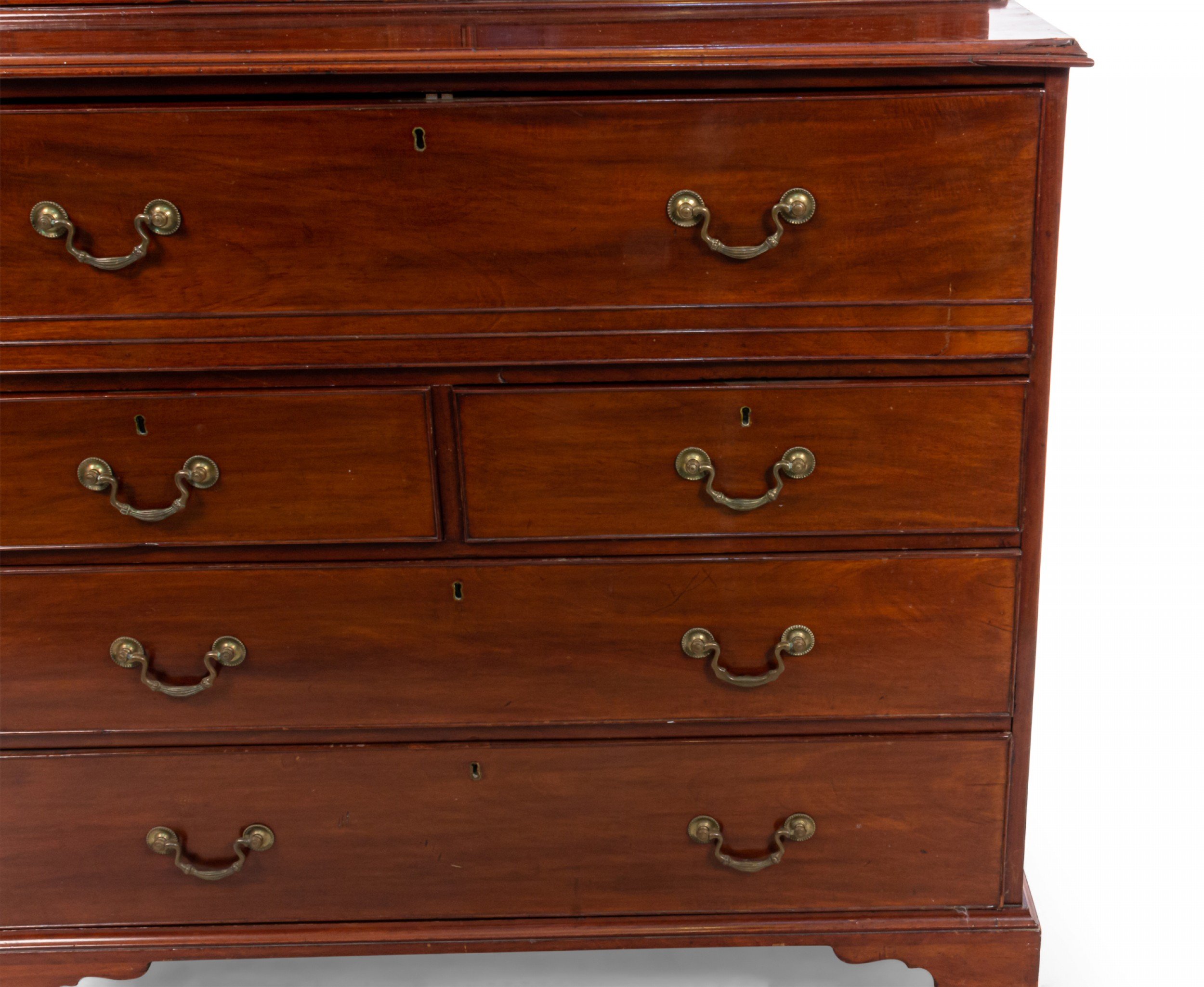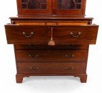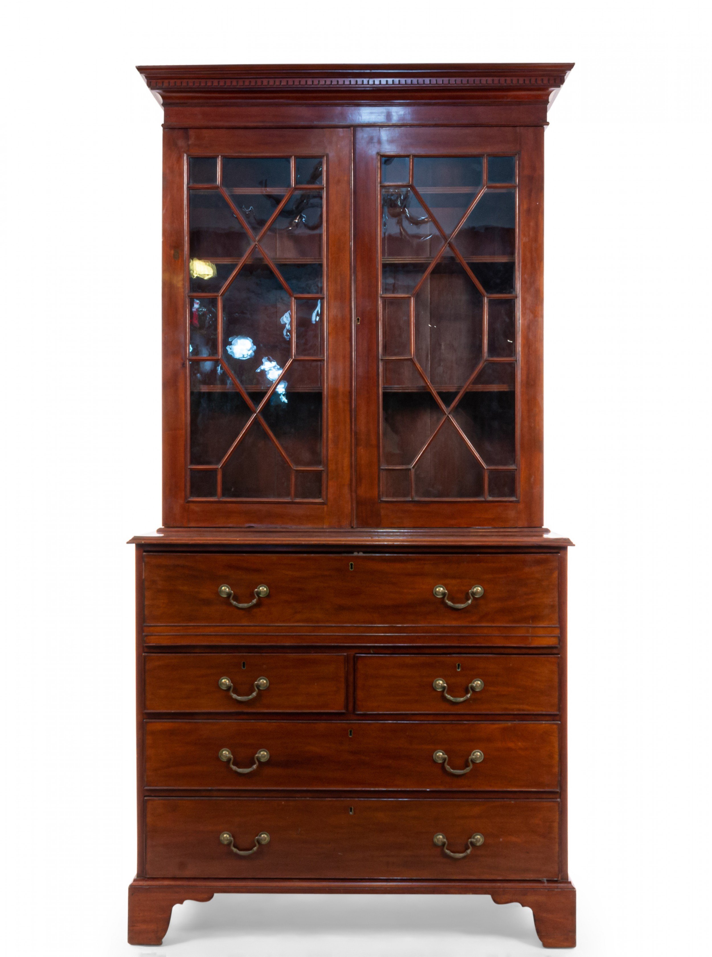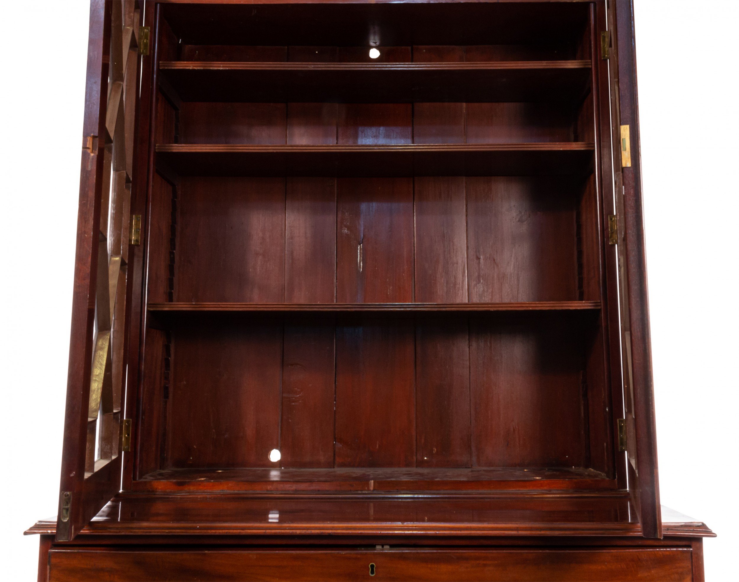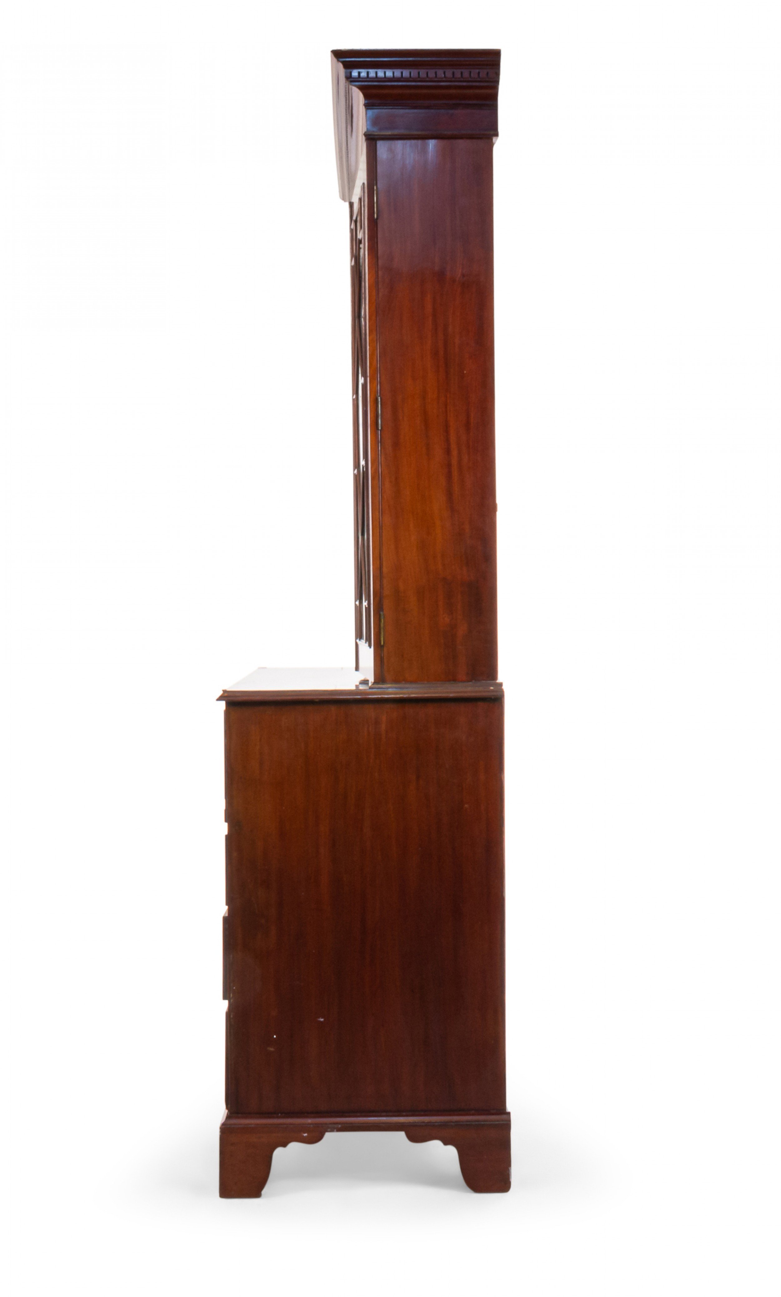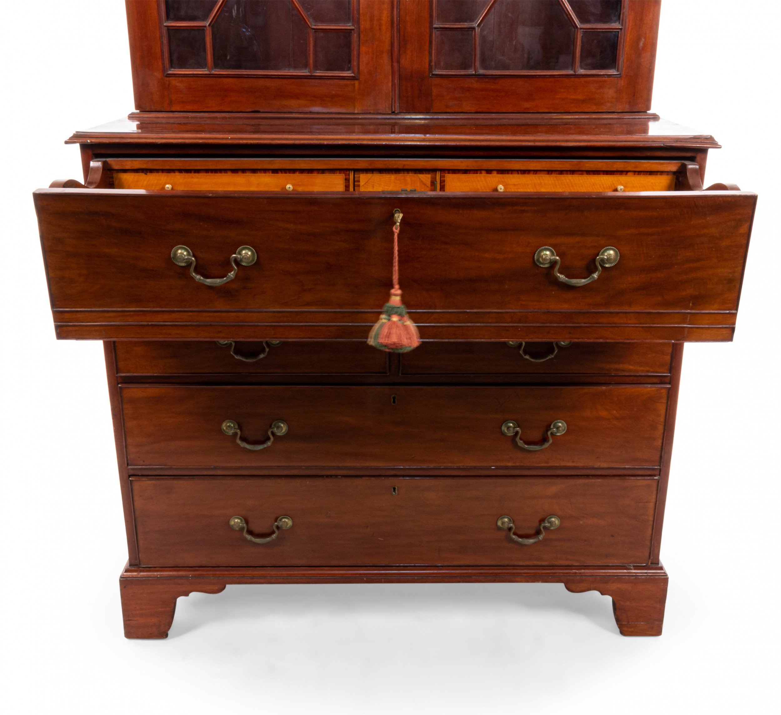 English Georgian mahogany secretary cabinet with a bottom section with drawers and an upper section with 2 lattice glass doors