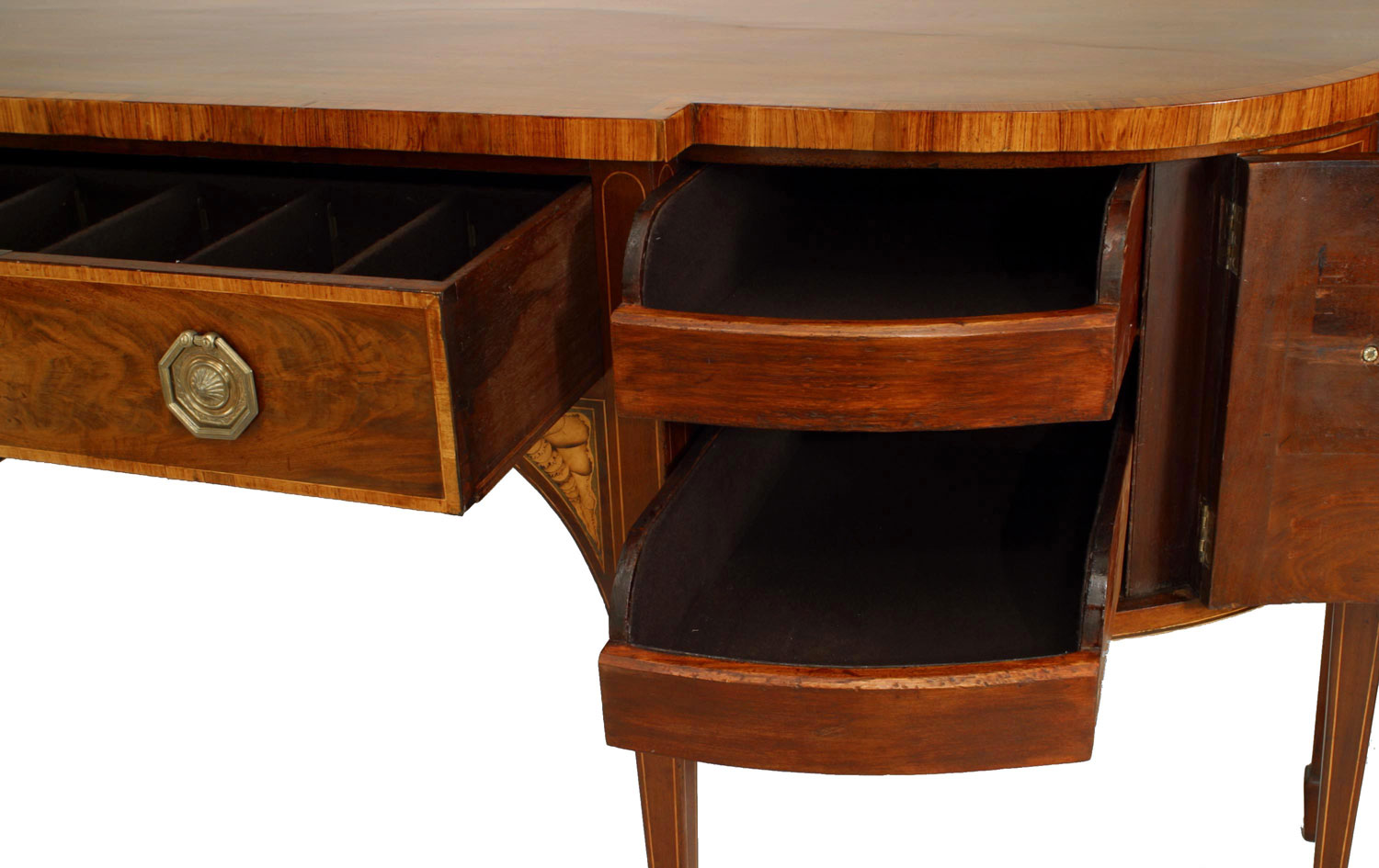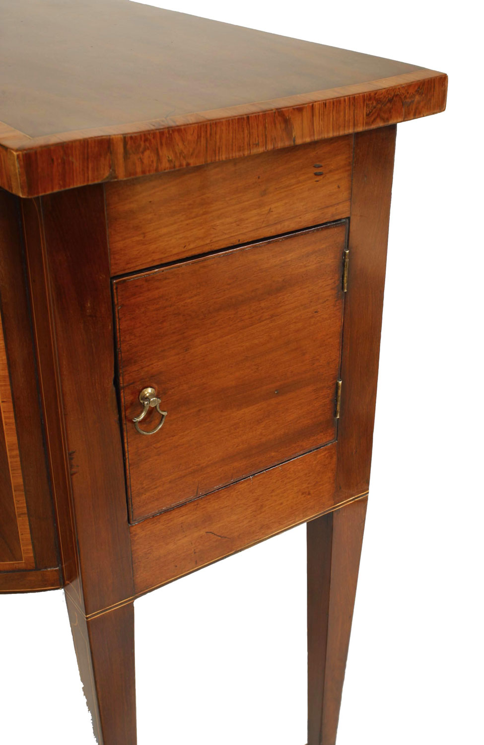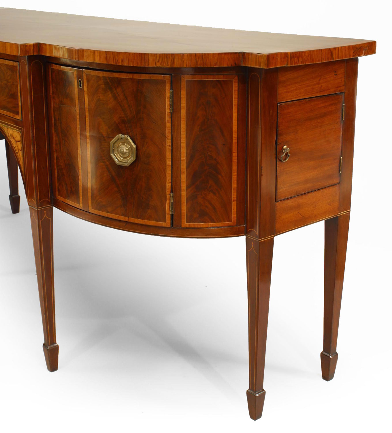 English Georgian mahogany sideboard with bow shaped front and inlaid with cross-banding and panels on either side of center front drawer..