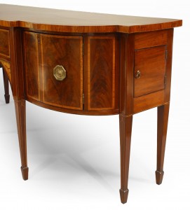English Georgian mahogany sideboard with bow shaped front and inlaid with cross-banding and panels on either side of center front drawer.