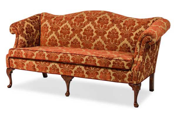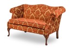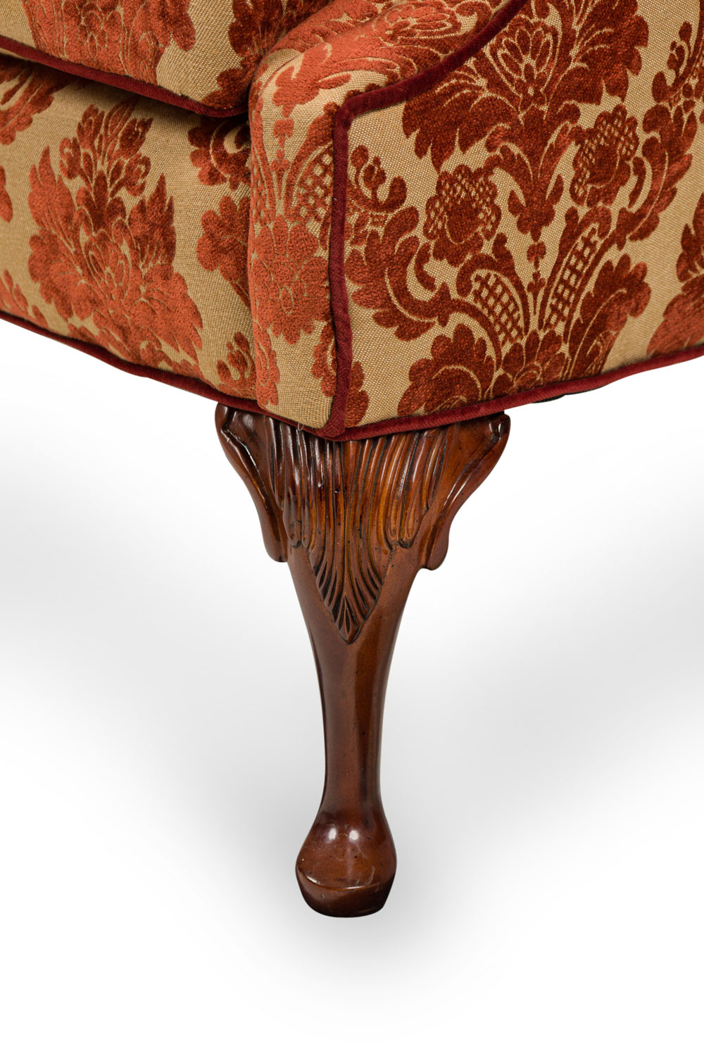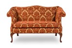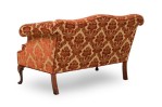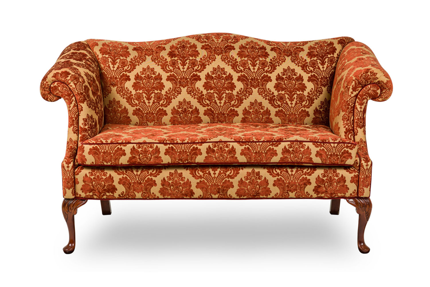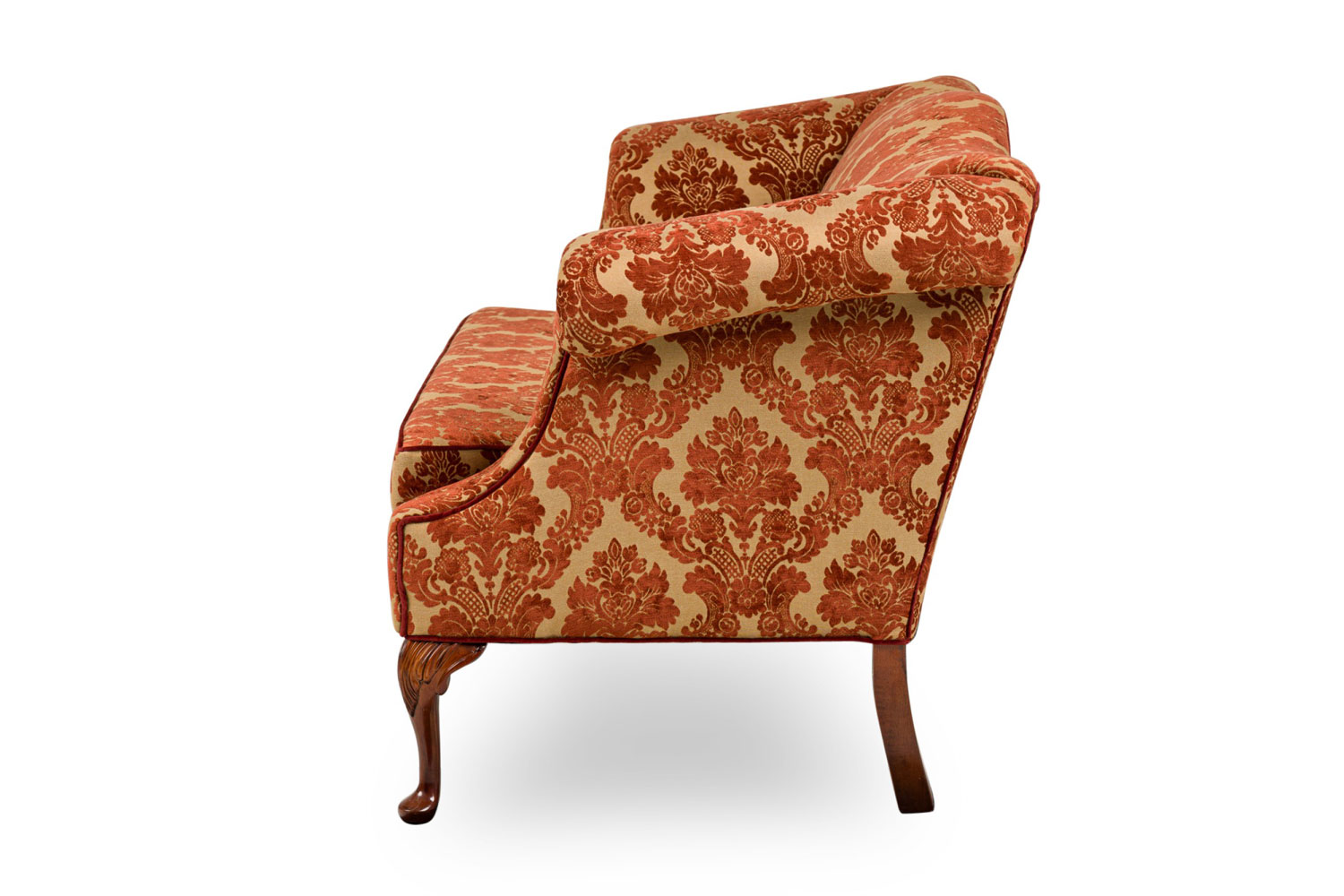 English Georgian style (Mid-20th Century) camel back loveseat with scrolled arms in a red and gold damask upholstery with carved mahogany legs (matching larger sofa: 063918).