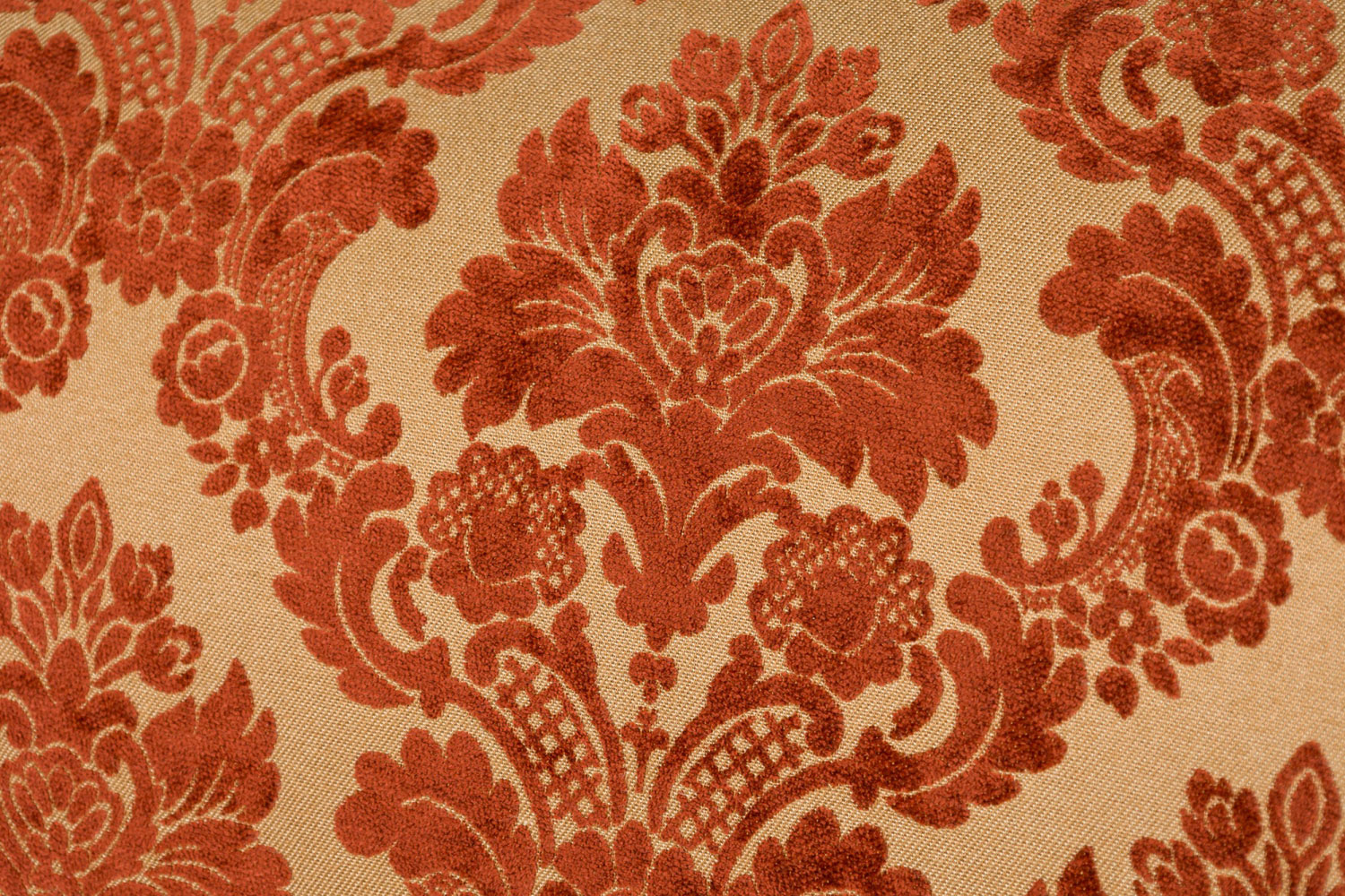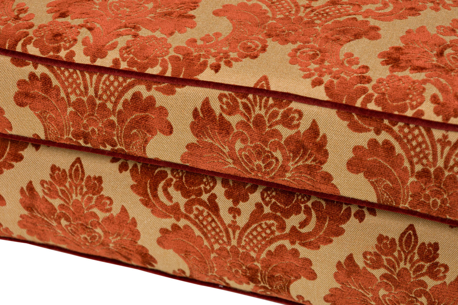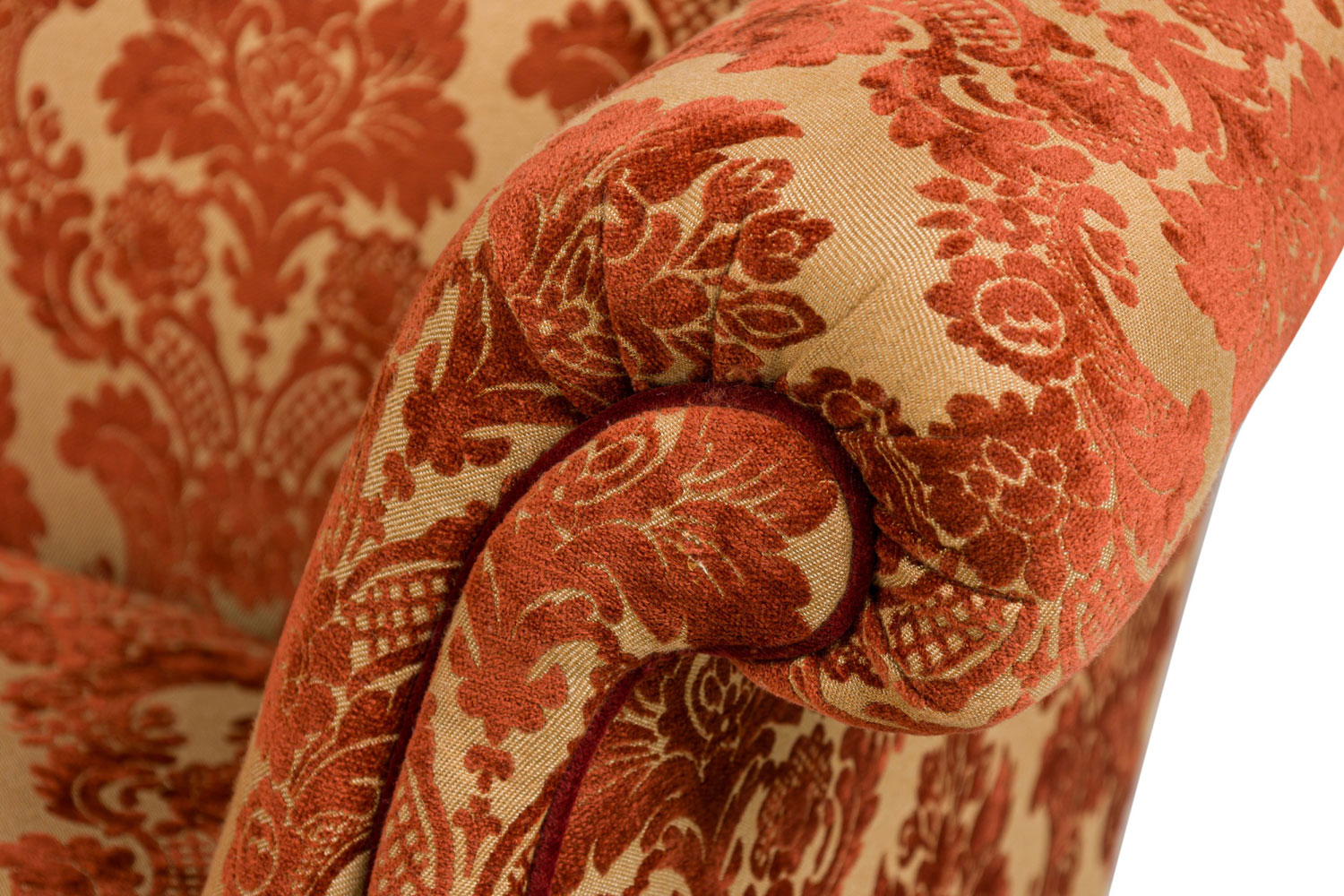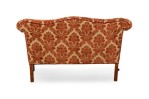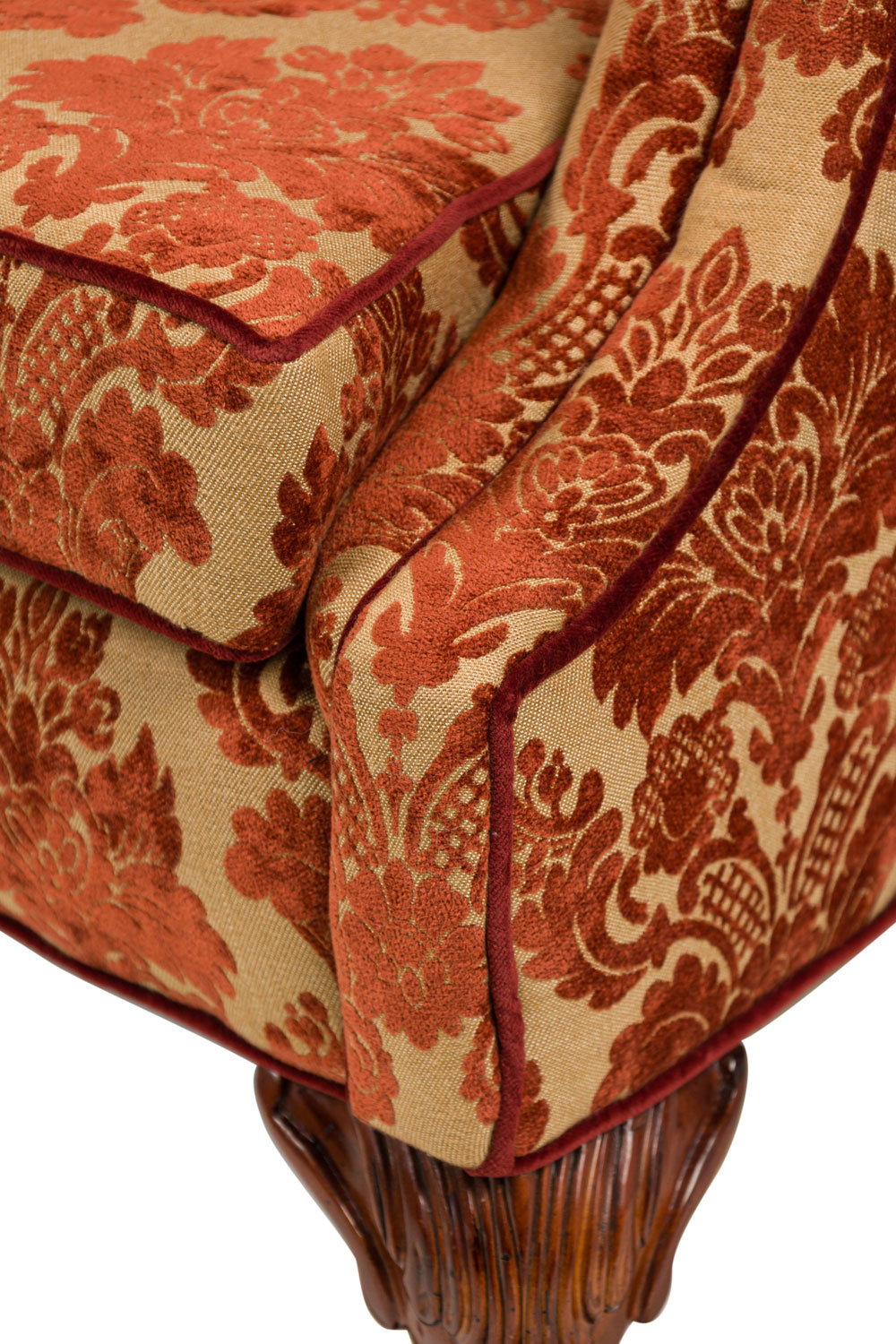 English Georgian style (Mid-20th Century) camel back loveseat with scrolled arms in a red and gold damask upholstery with carved mahogany legs (matching larger sofa: 063918).