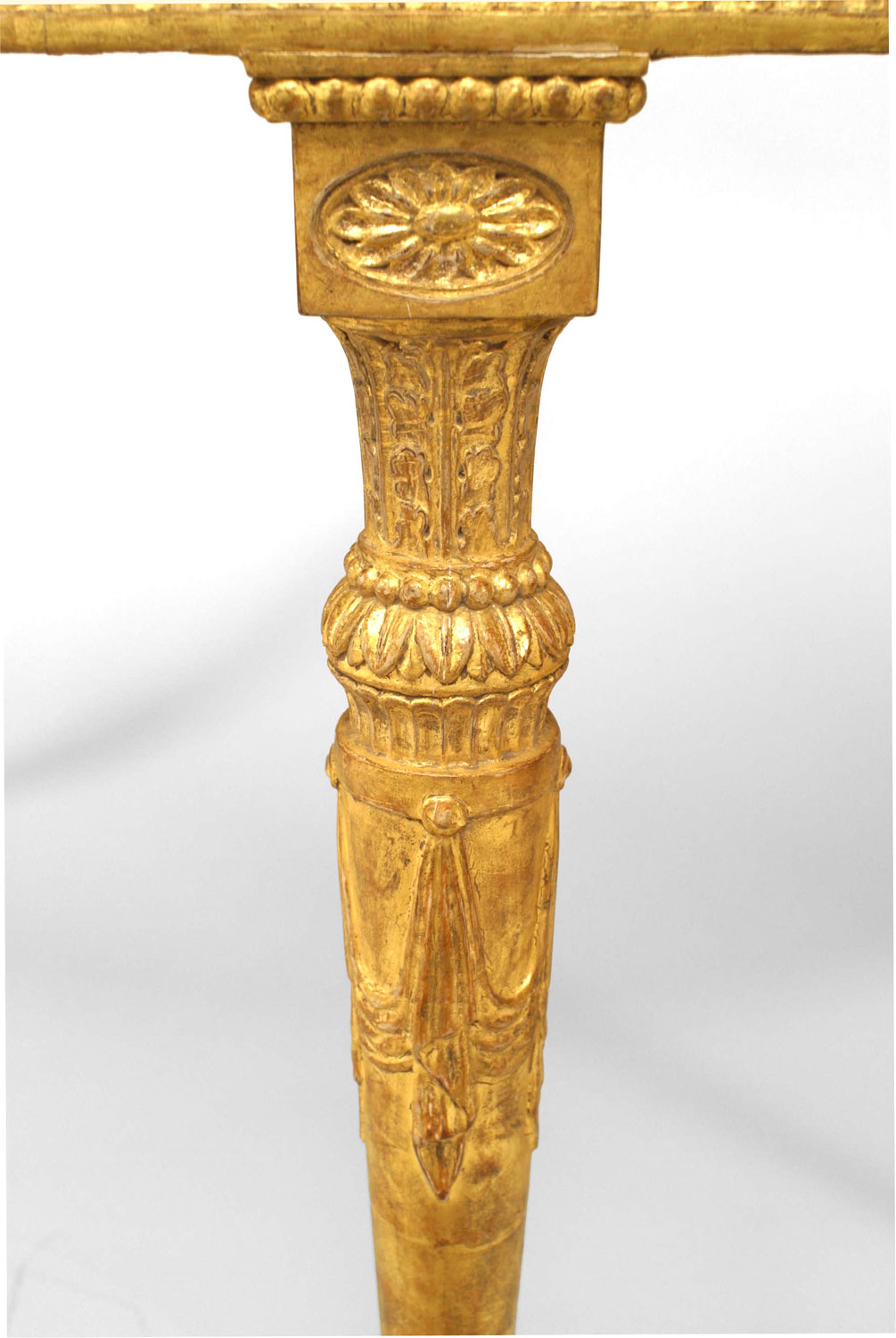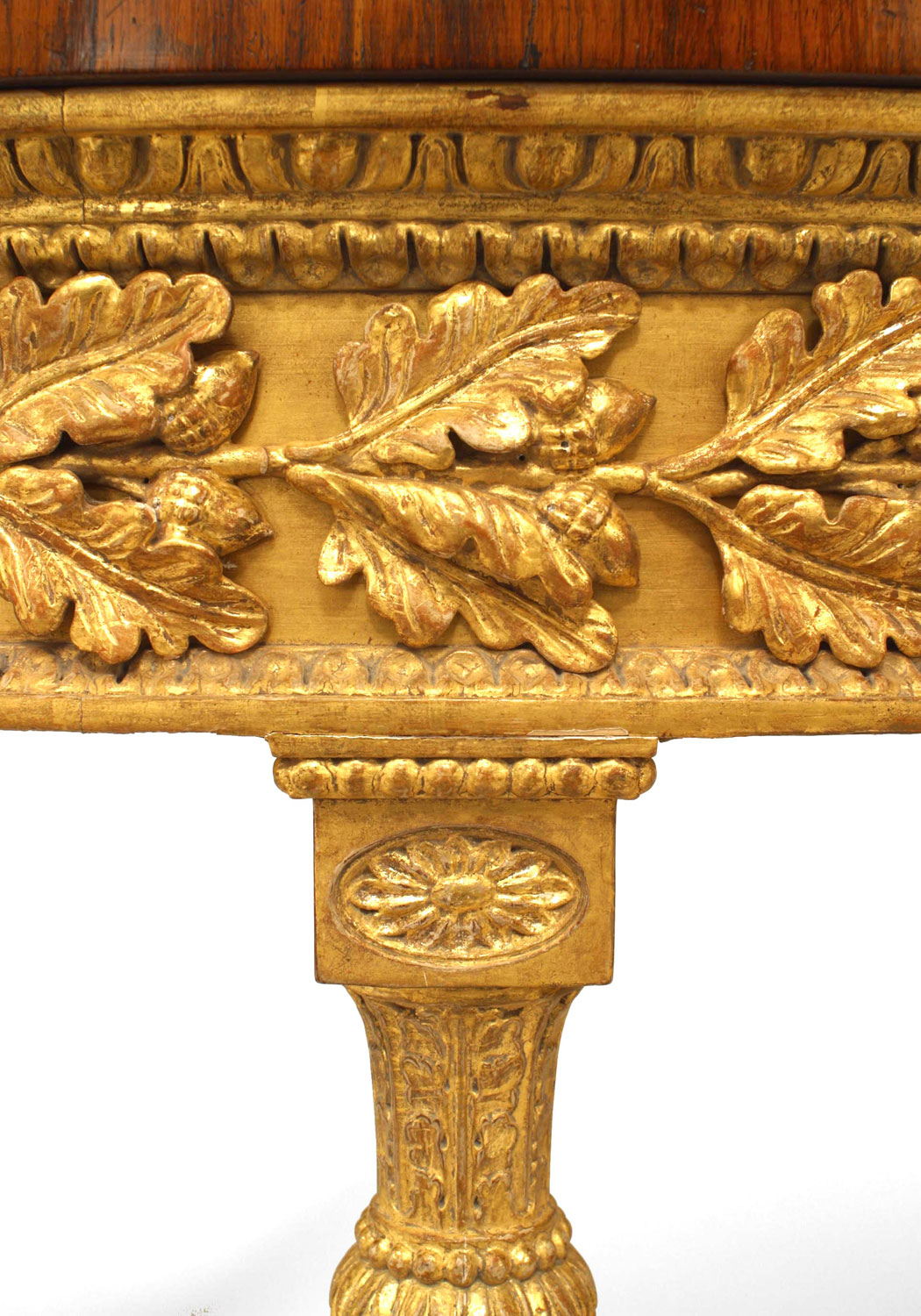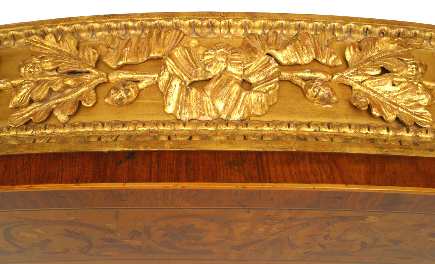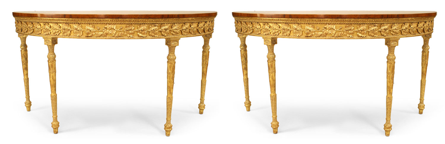 PAIR of English Georgian-style (19th Century) satinwood demilune shaped console tables with mahogany banding inlaid with scrolling design over a gilt & applied floral carved apron & legs. (PRICED AS PAIR)