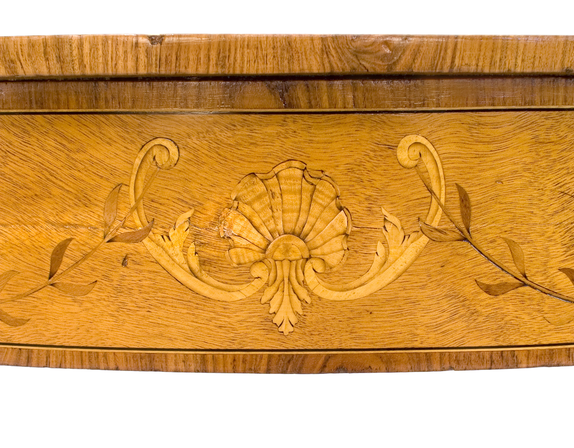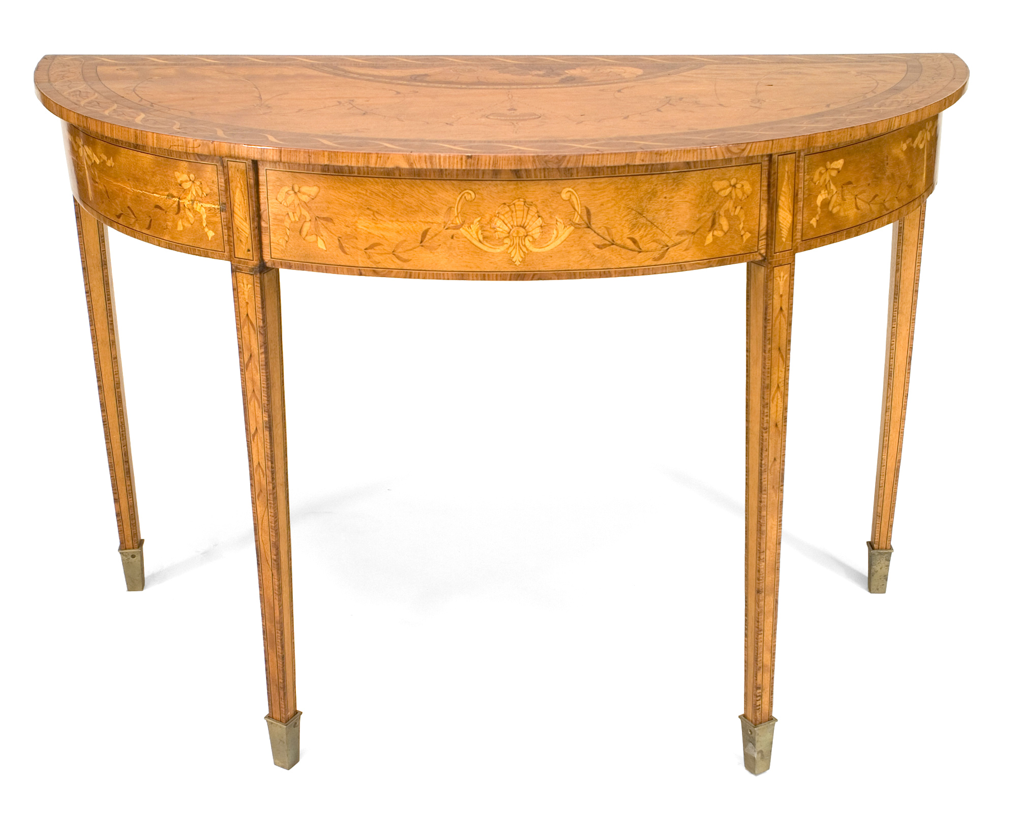 English Georgian satinwood demilune console table with various inlaid flowers and scrolls on apron and top with bronze sabot on feet. (Attributed to Charles Elliott)