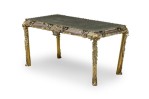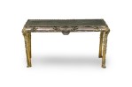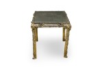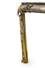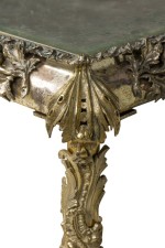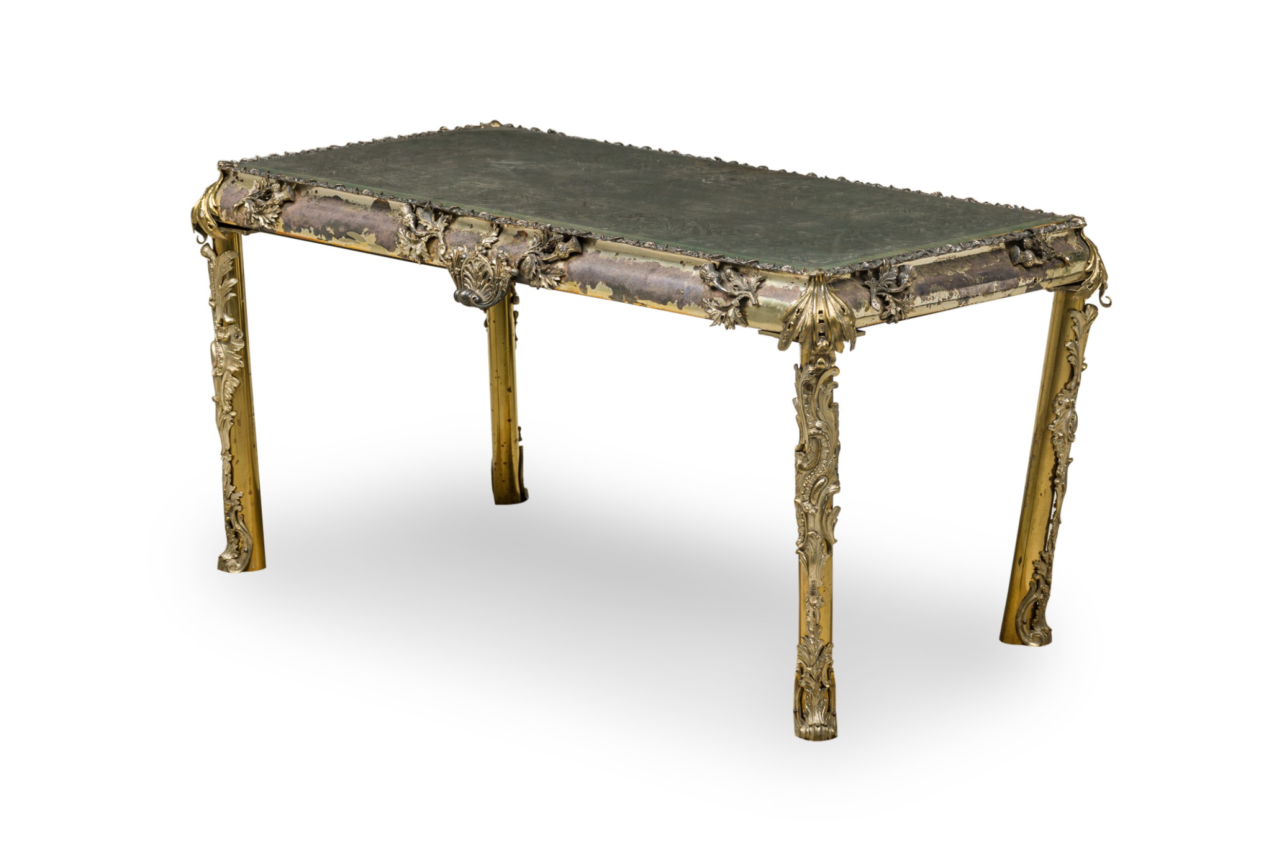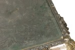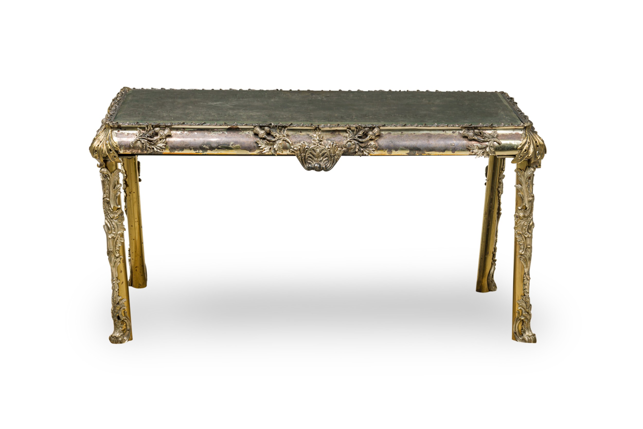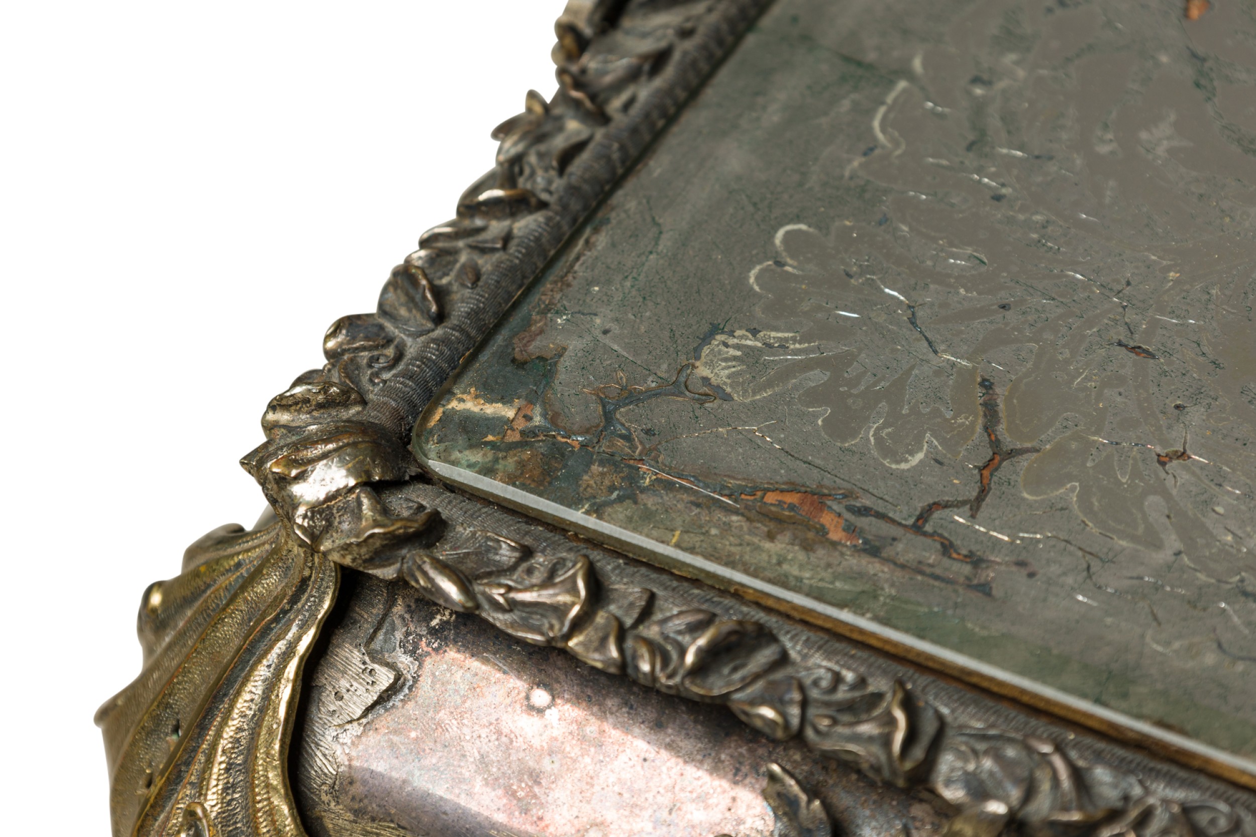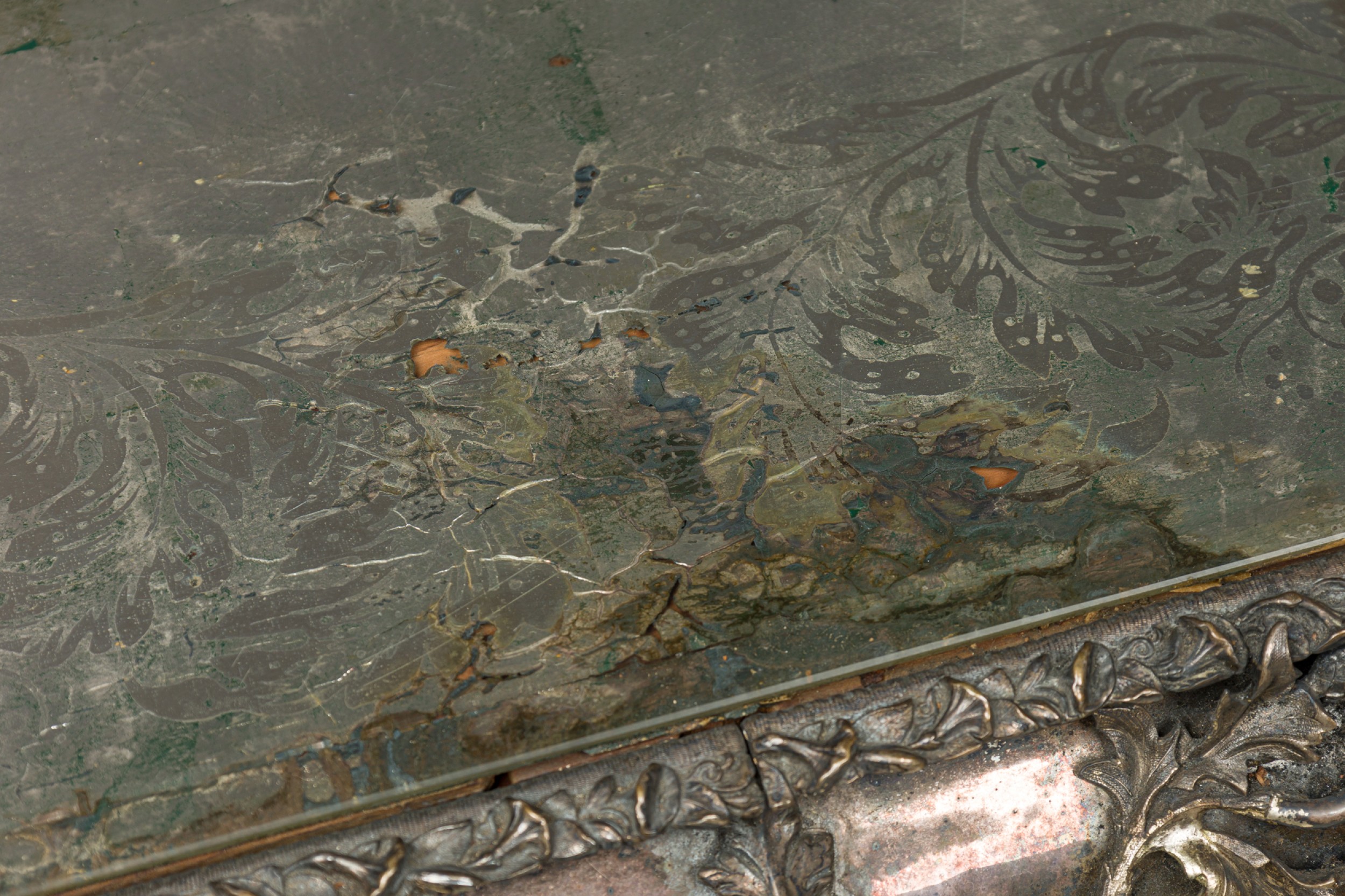 Style: French, English Materials & Techniques: Bronze, metal, mirror, silver Category: Tables Condition: Oxidation, tarnishing, and losses to table surface, one leg bent slightly inward.