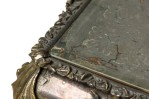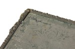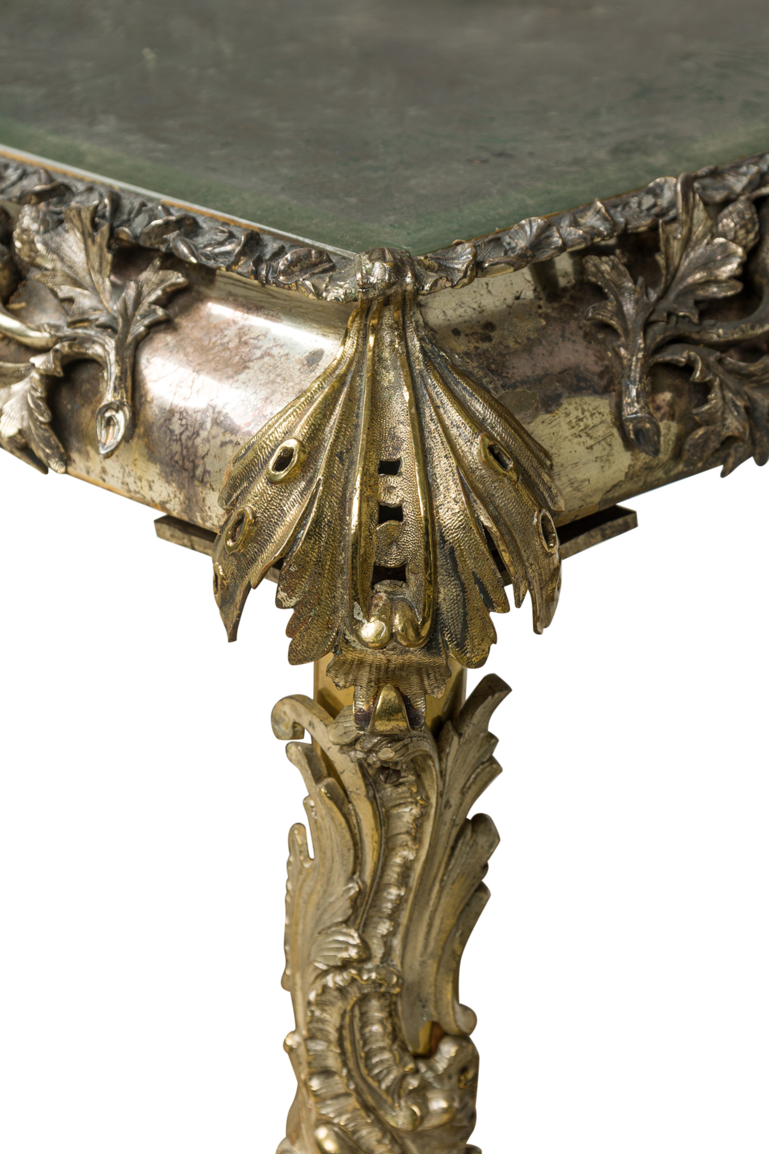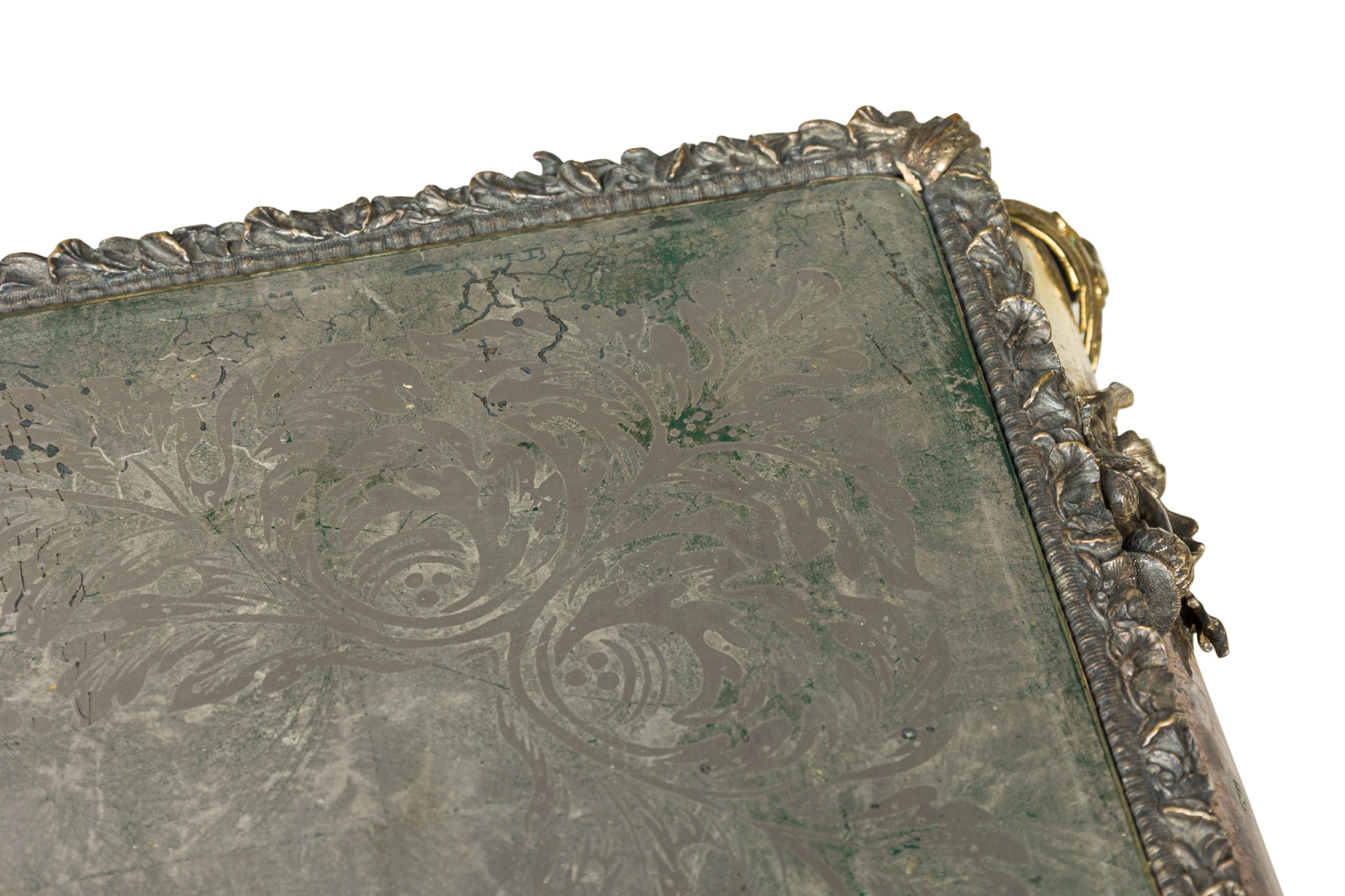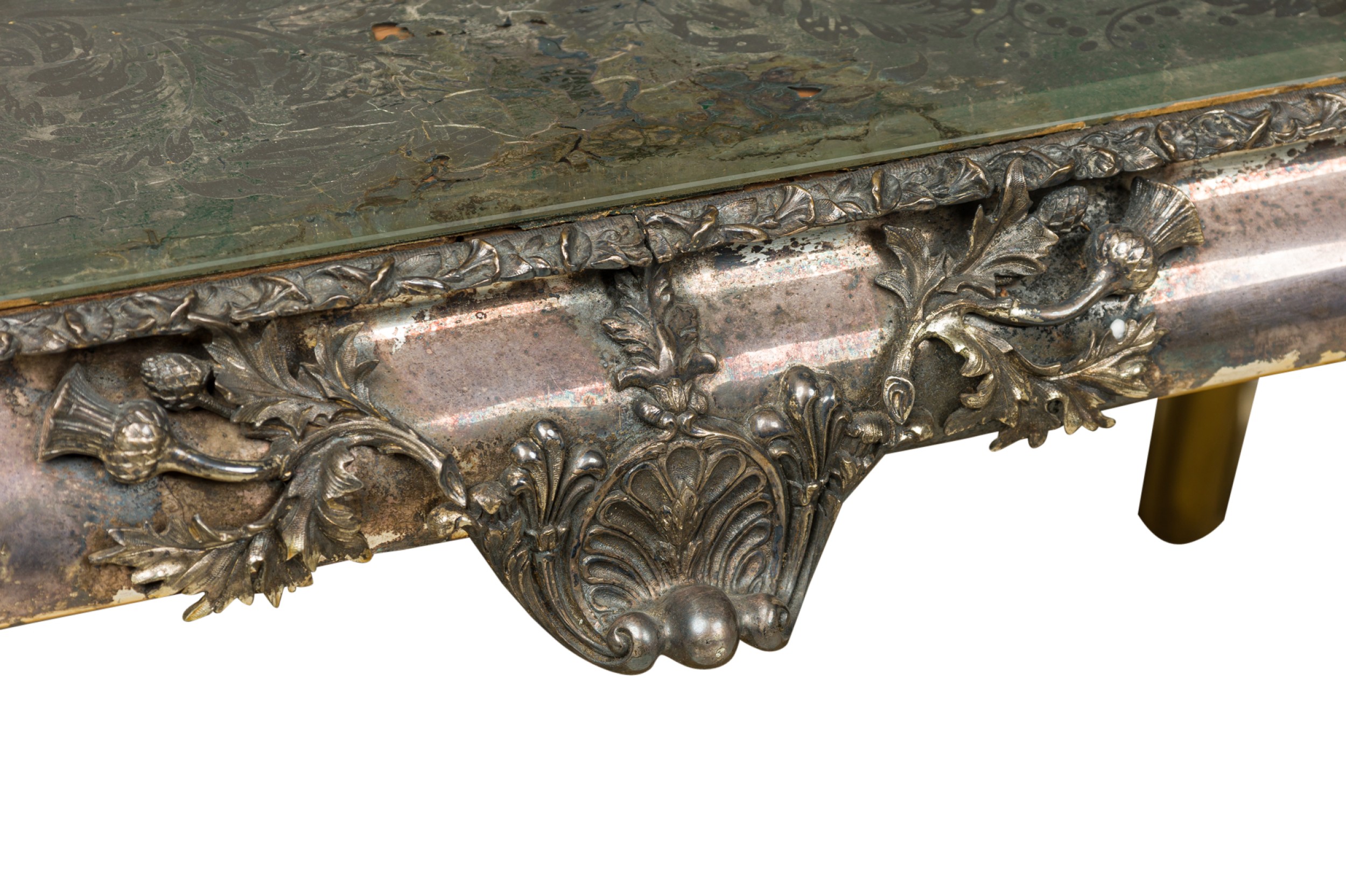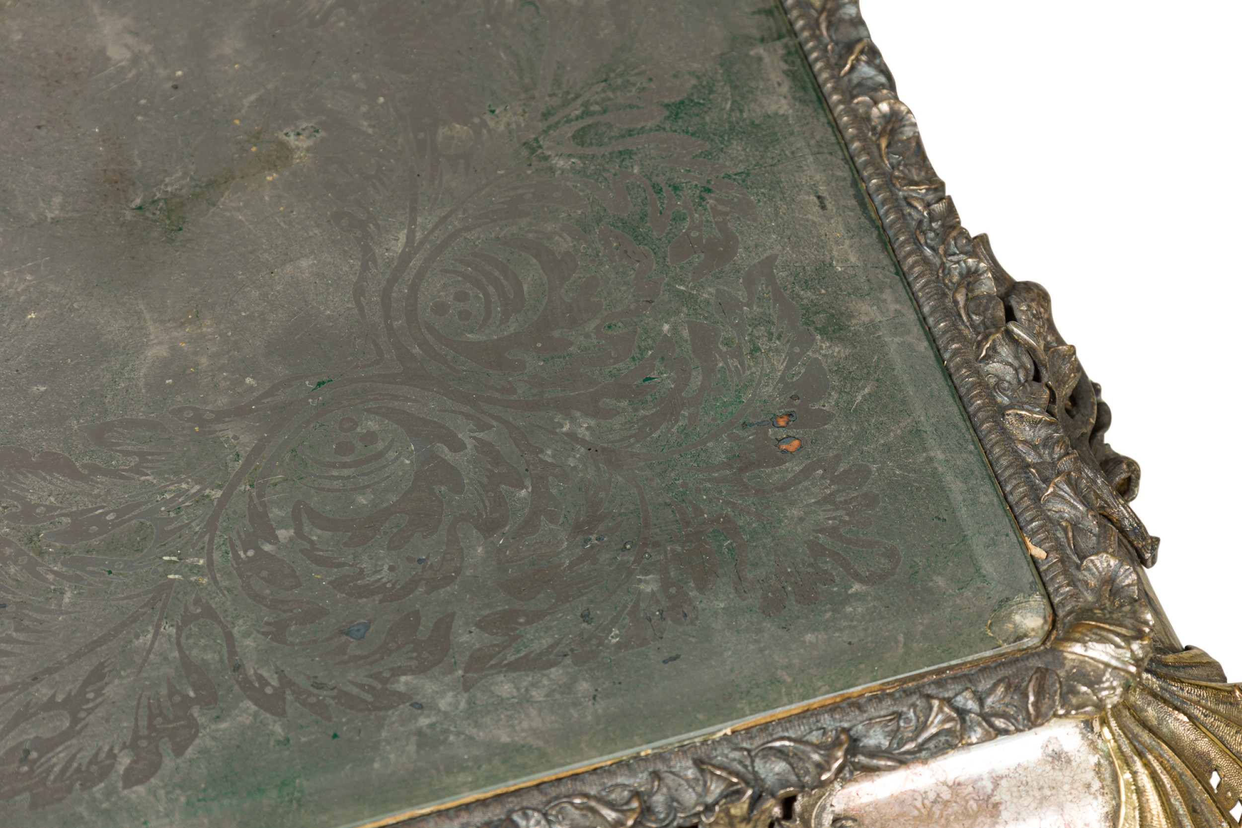 English Georgian (19th Cent) rectangular coffee / low table with an elaborately cast silver plate and bronze frame and an antique etched floral and scroll design mirrored top..