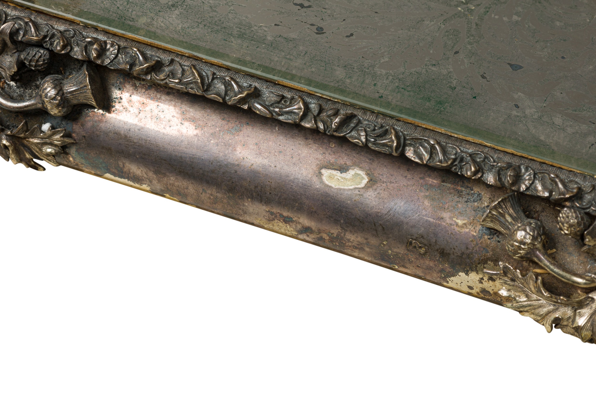 English Georgian (19th Cent) rectangular coffee / low table with an elaborately cast silver plate and bronze frame and an antique etched floral and scroll design mirrored top.