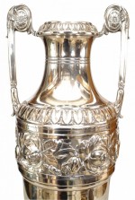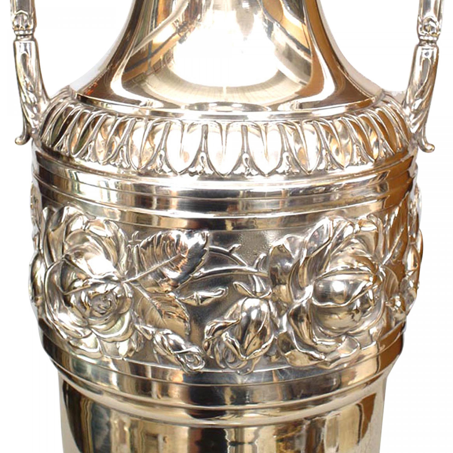PAIR of English Georgian style (19th Cent) tall silver plated narrow classic vases with handles and floral design..